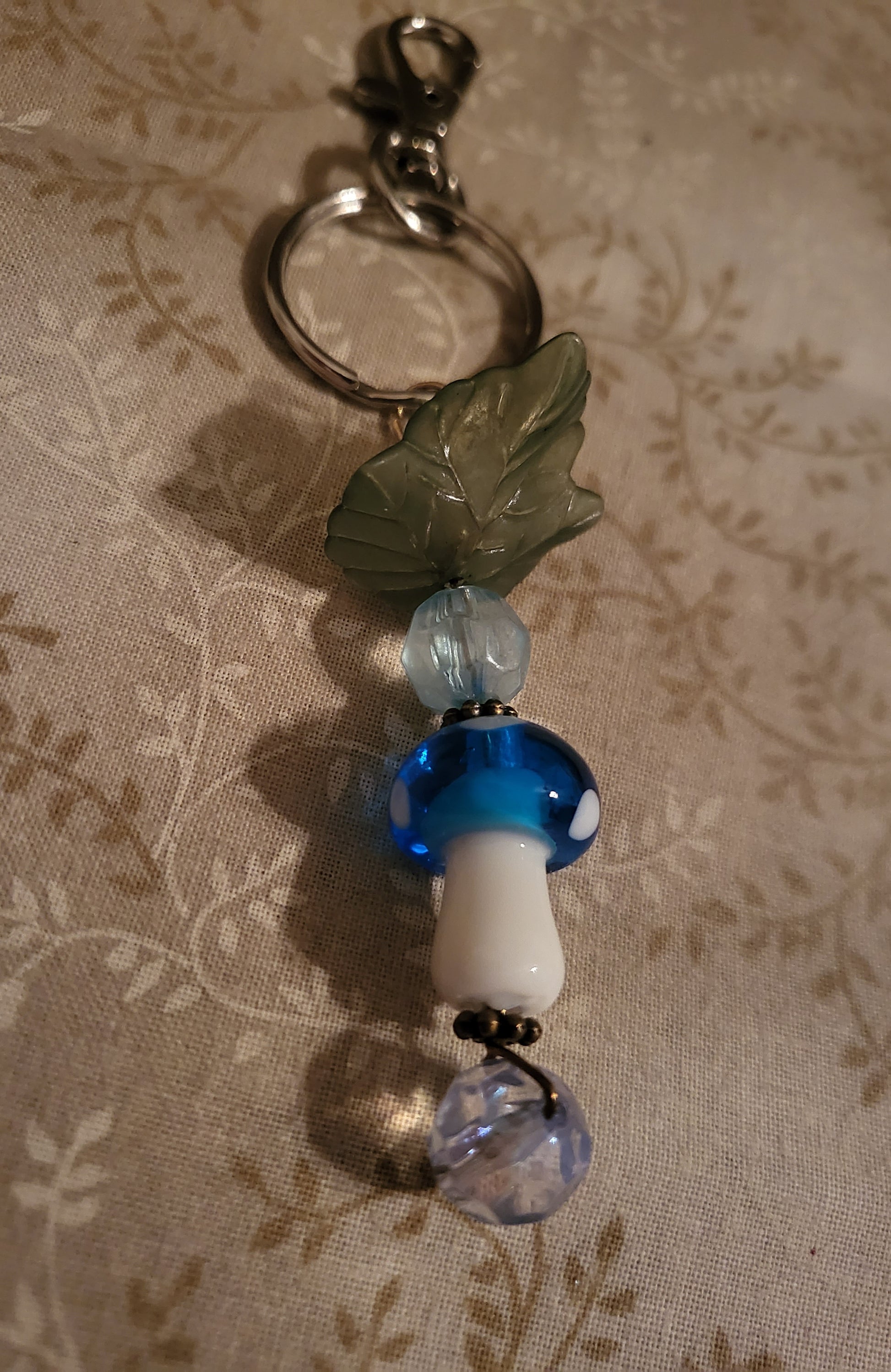 A blue glass mushroom beads wirewrapped with light blue beads and a green leaf. Measures 4" and has a lobster clasp keychain.