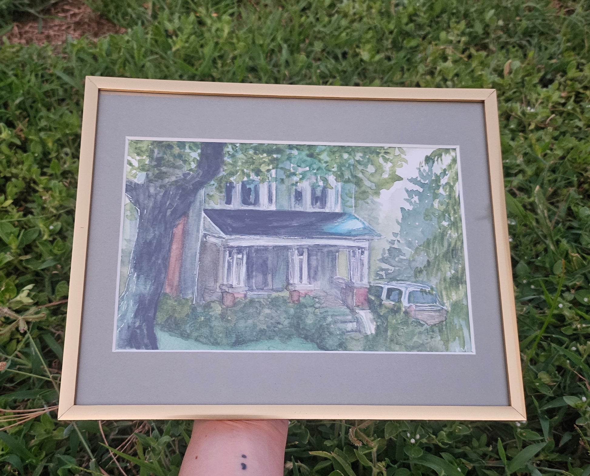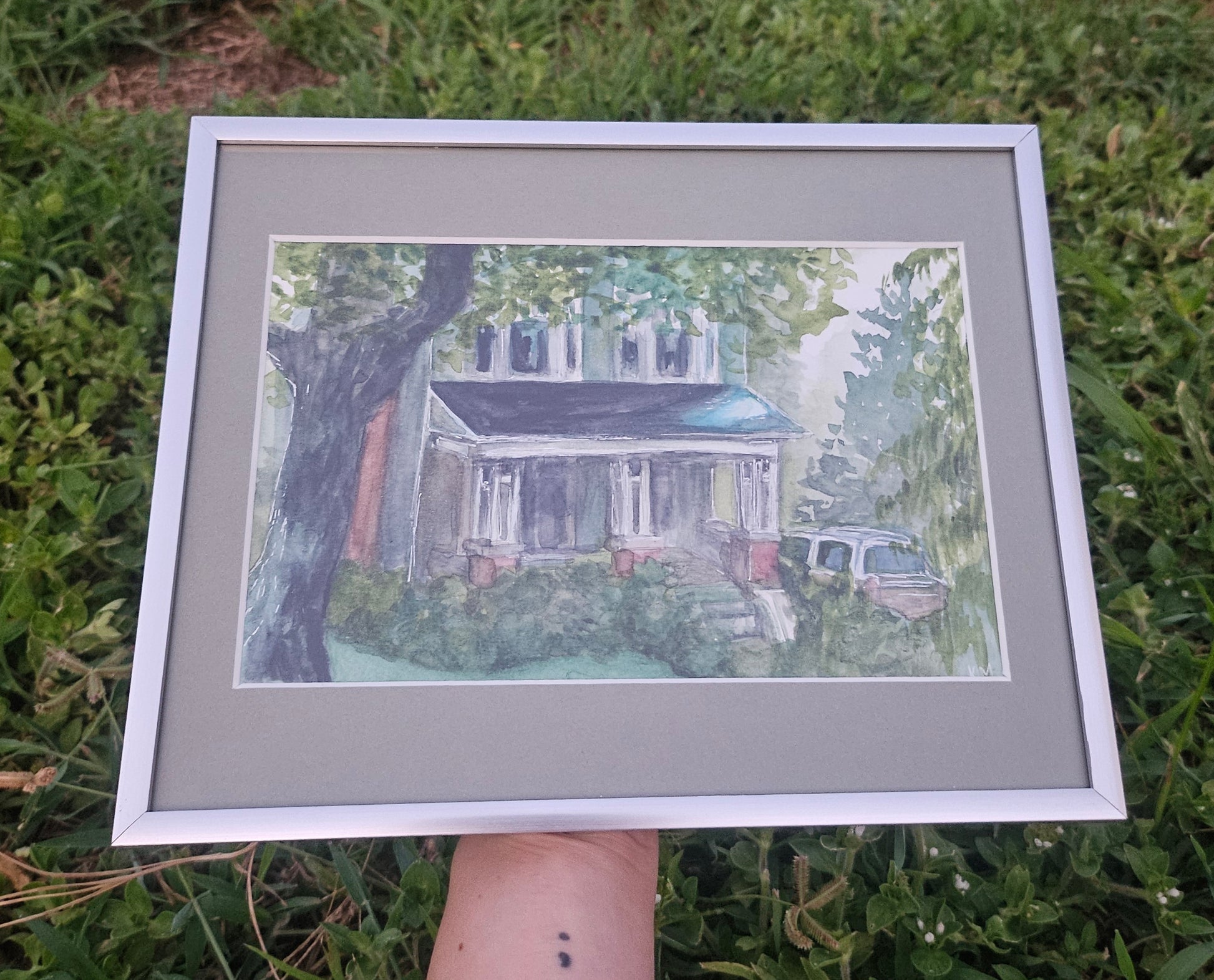 An original 6x9 watercolor of Bill Denbrough's childhood home from IT matted with a sierra olive acid free mat into a silver 8x10 frame. Can sit or hang. Gold frame available if preferred, just let us know, default frame is silver though.