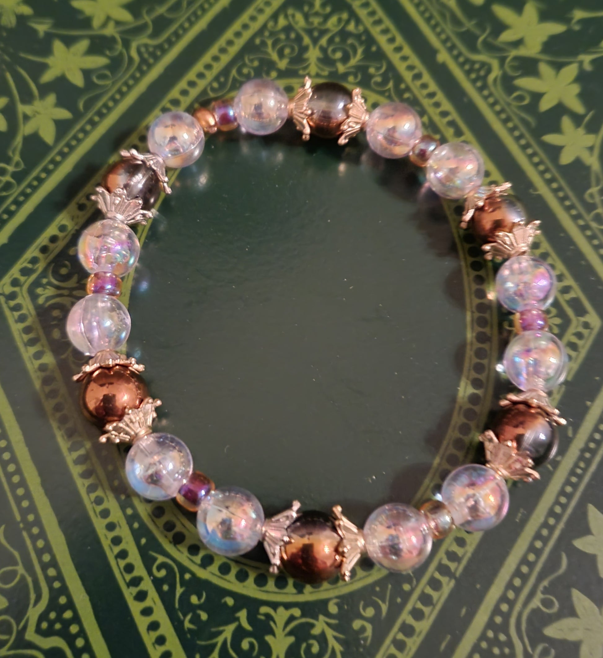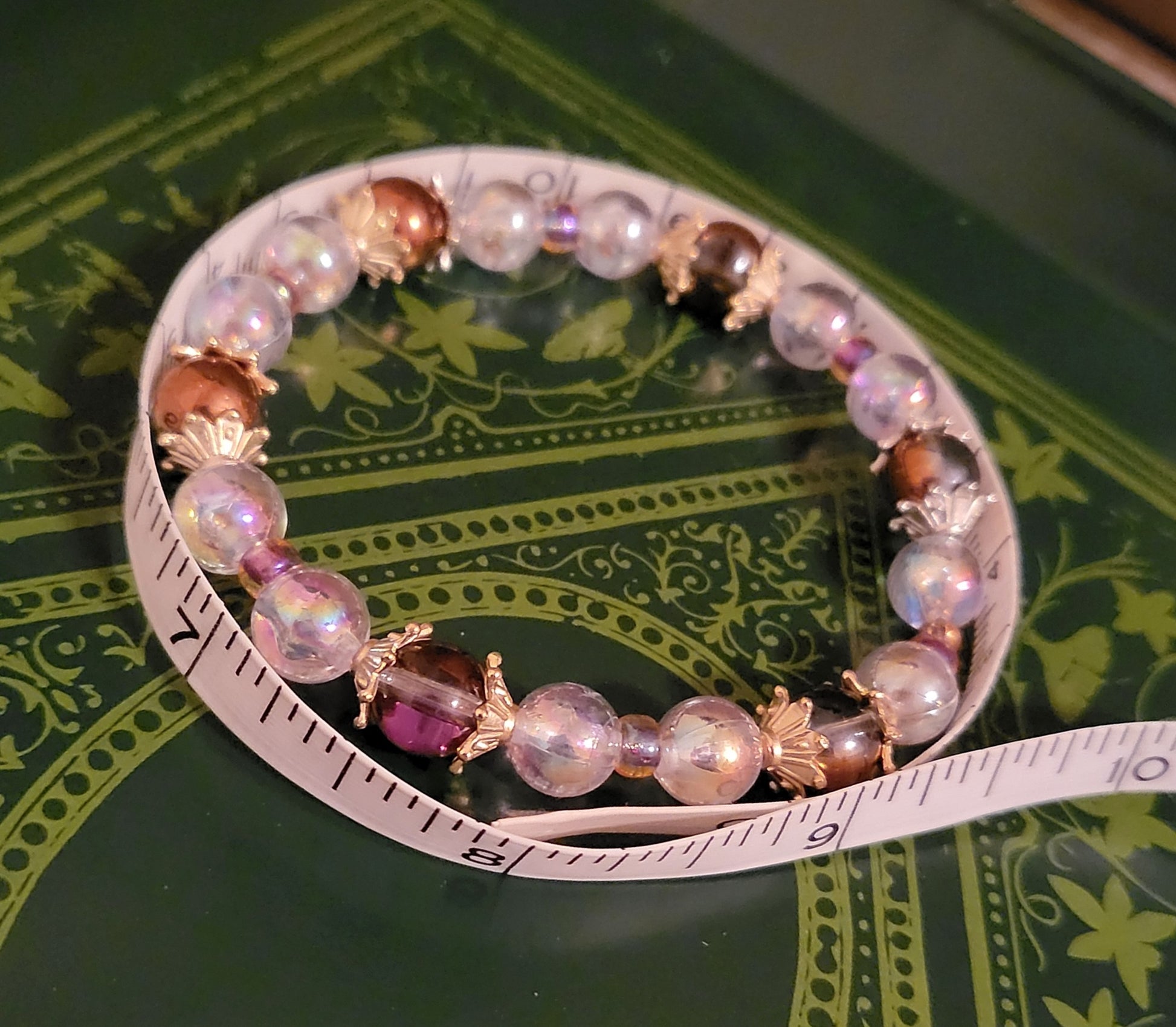 A 8" stretchy beaded bracelet with iridescent brown beads, gold star spacers and iridescent bubble beads.