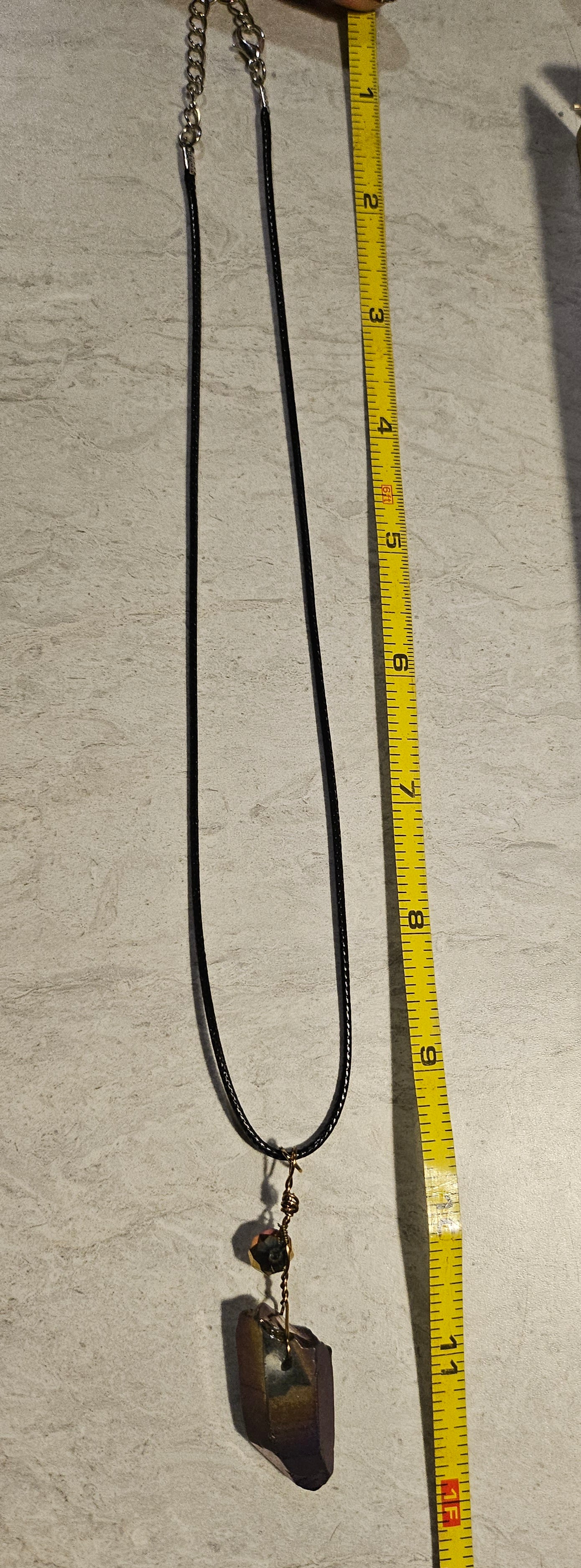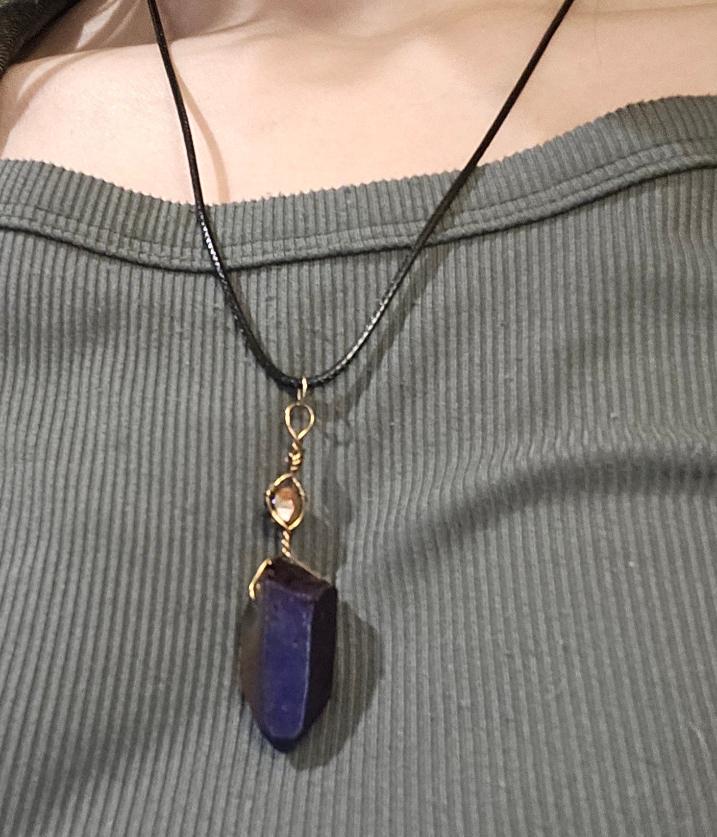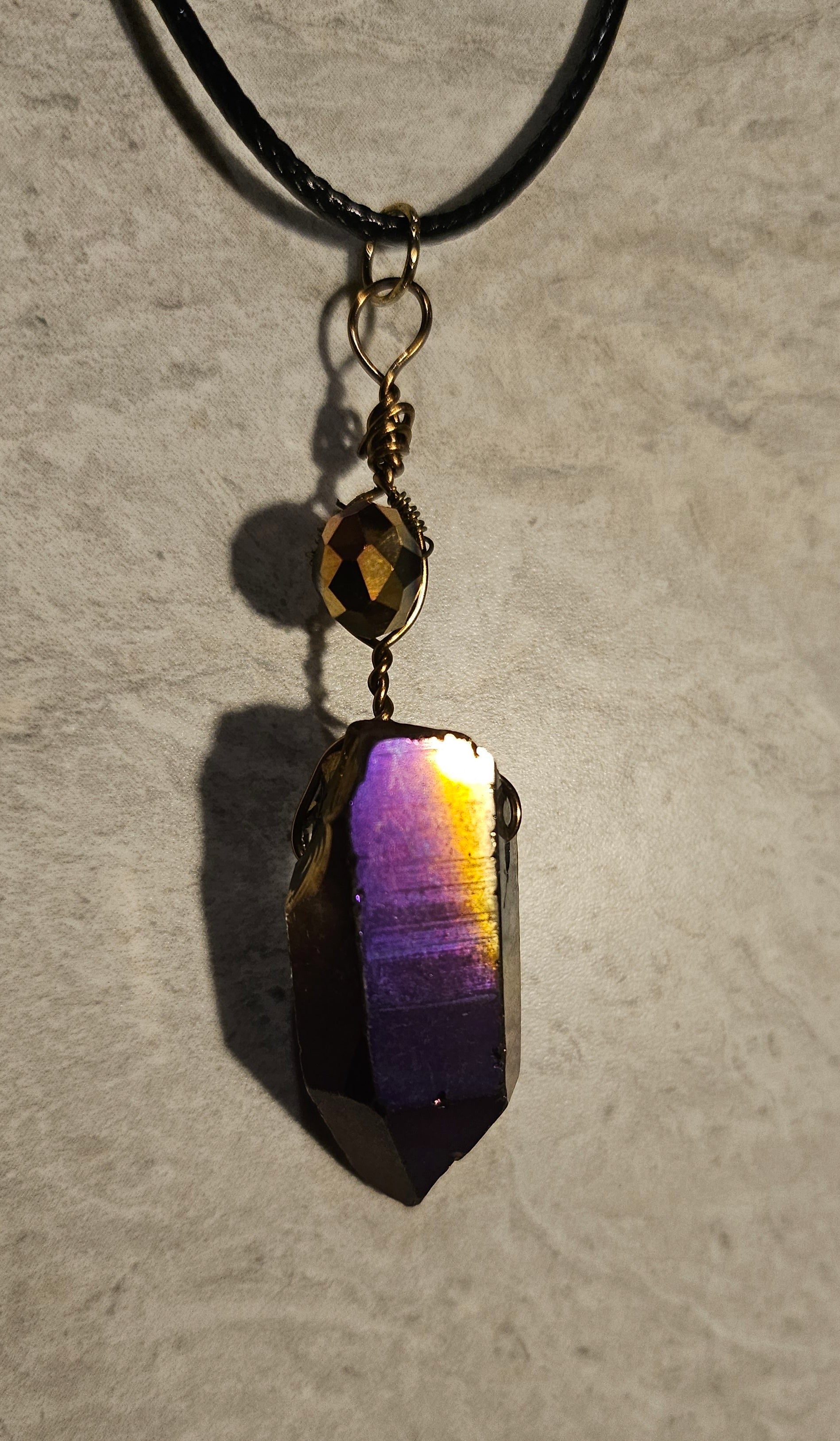 A 9" necklace featuring a short dark purple crystal with an iridescent faceted purple accent bead. On a black cord with a lobster clasp.