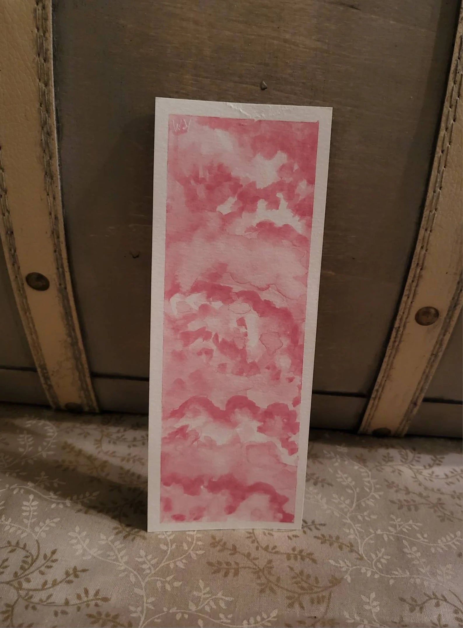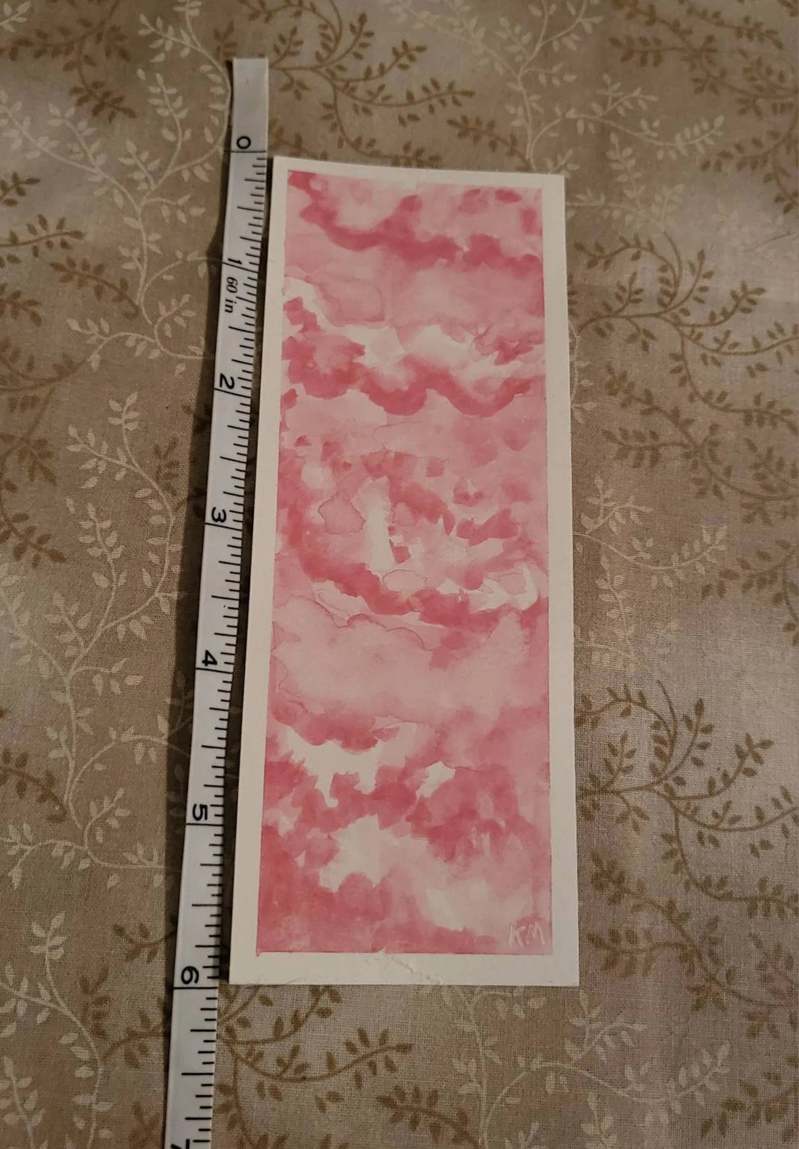 A 2x6 bookmark of pink clouds on 110lb cardstock in watercolor paint