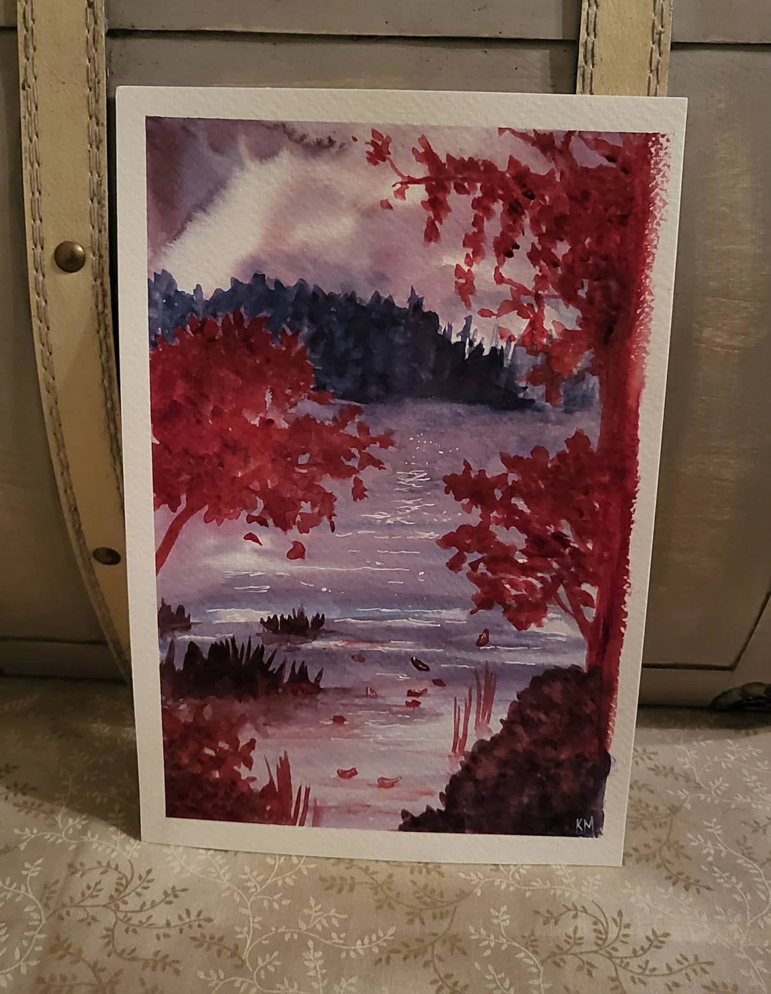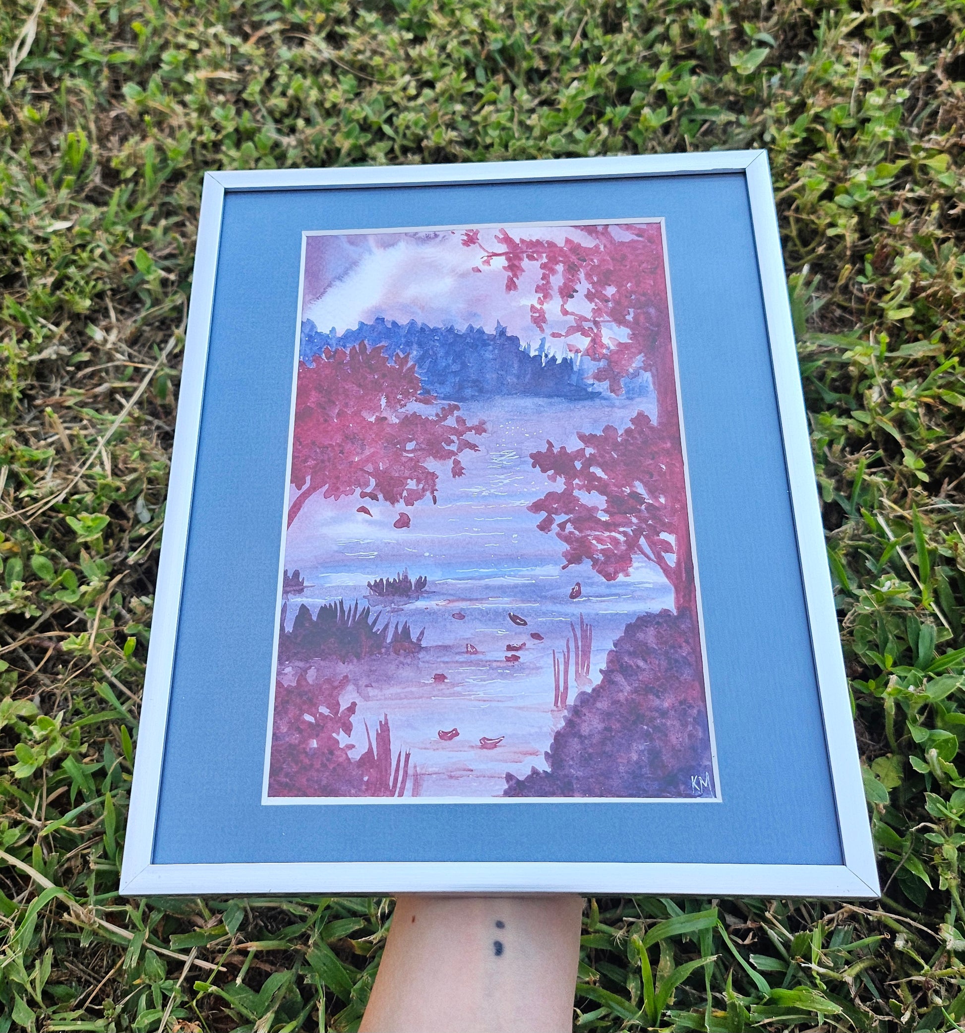A 6x9 original watercolor painting of a water scene with foliage in purple/red hues mattes in nautical blue to fit an 8x10 silver plastic frame. Frame can sit or hang.