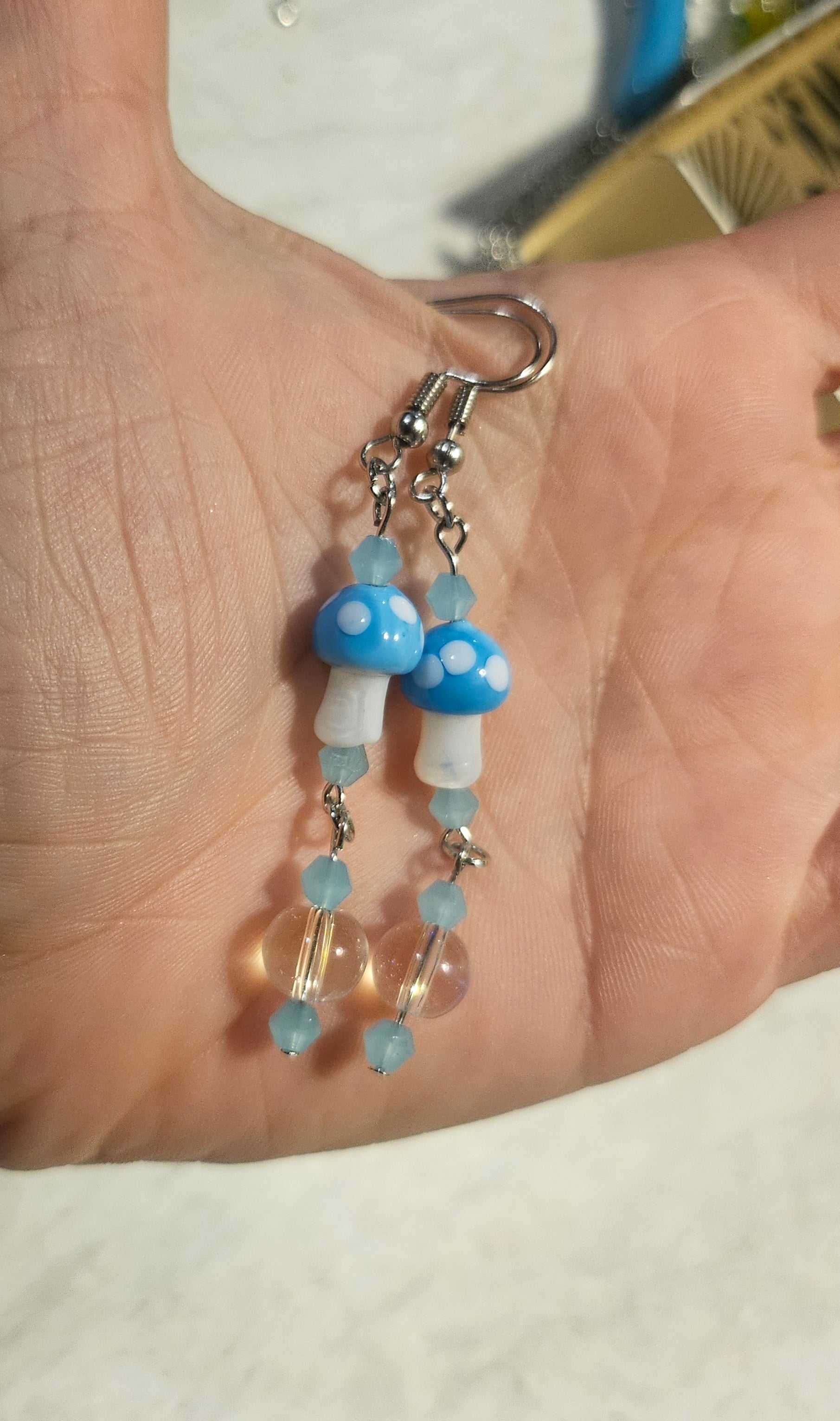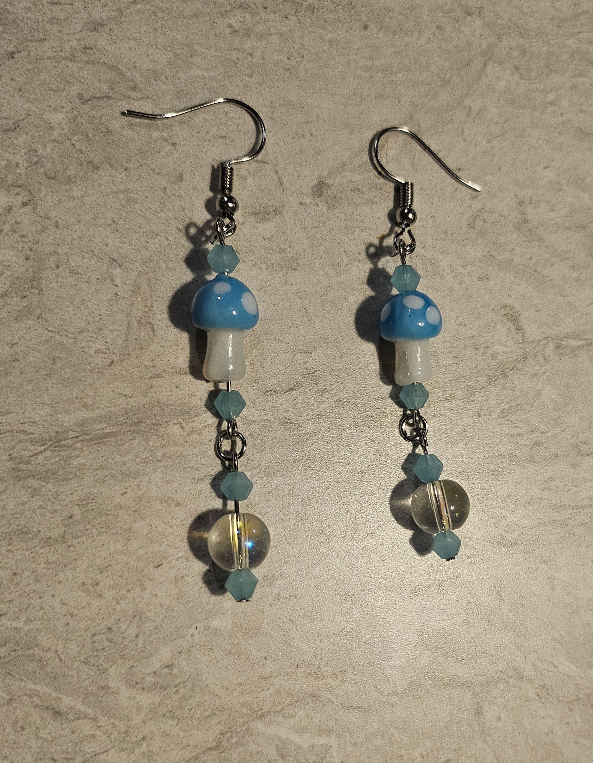 A pair of 3" fishook earrings featuring cyan mushrooms, cyan glass beads and a clear iridescent bead.