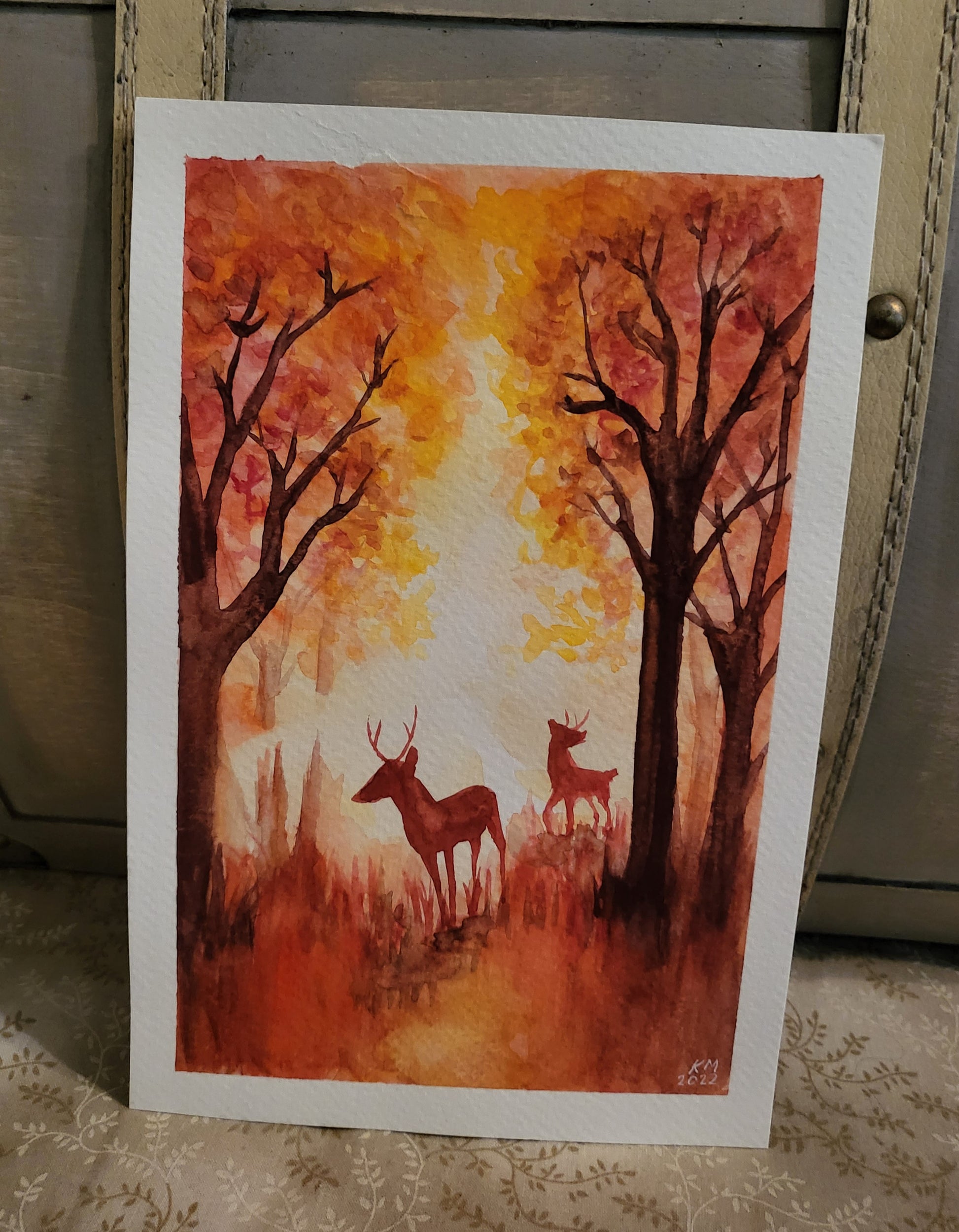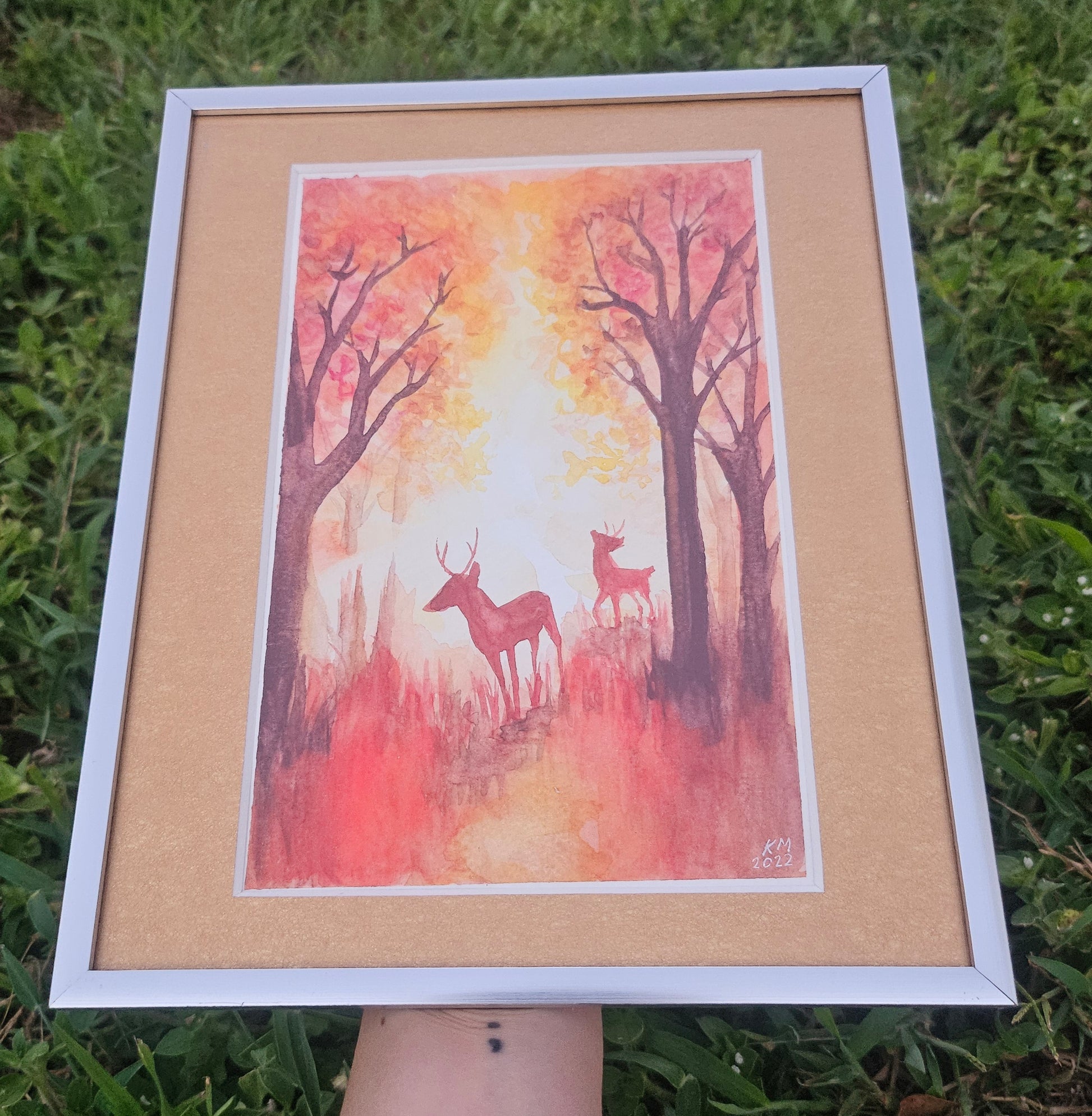 A 6 x 9 original watercolor painting of 2 deer framed by trees and backlit by an autumn sunset. The piece is matted with a textured gold into an 8x10 silver frame. Frame can sit or hang.