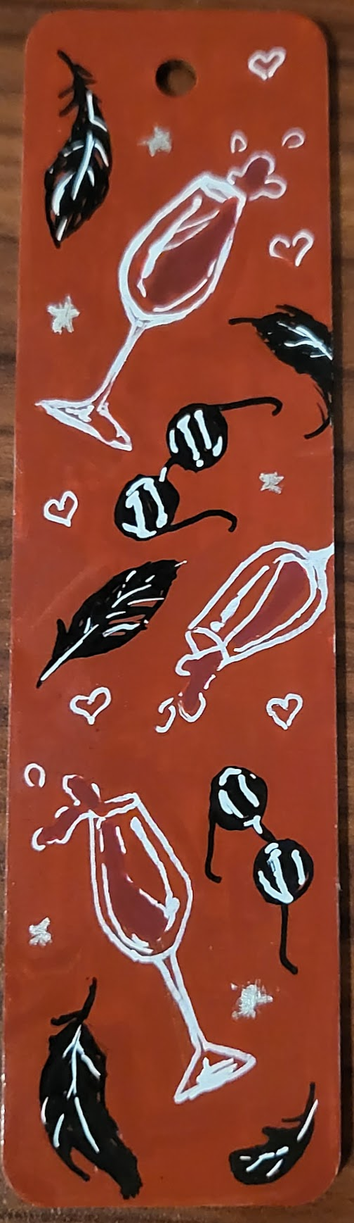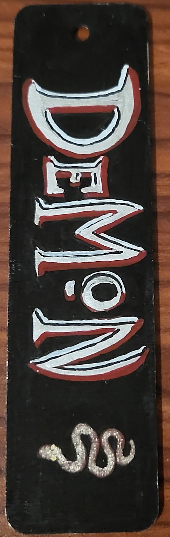 Because you can't have one without the other, here's a Crowley inspired bookmark. It's made of wood and painted with POSCA markers and leafing pen. The hole at the top comes threaded with a metallic silver tassel to easily find your place.