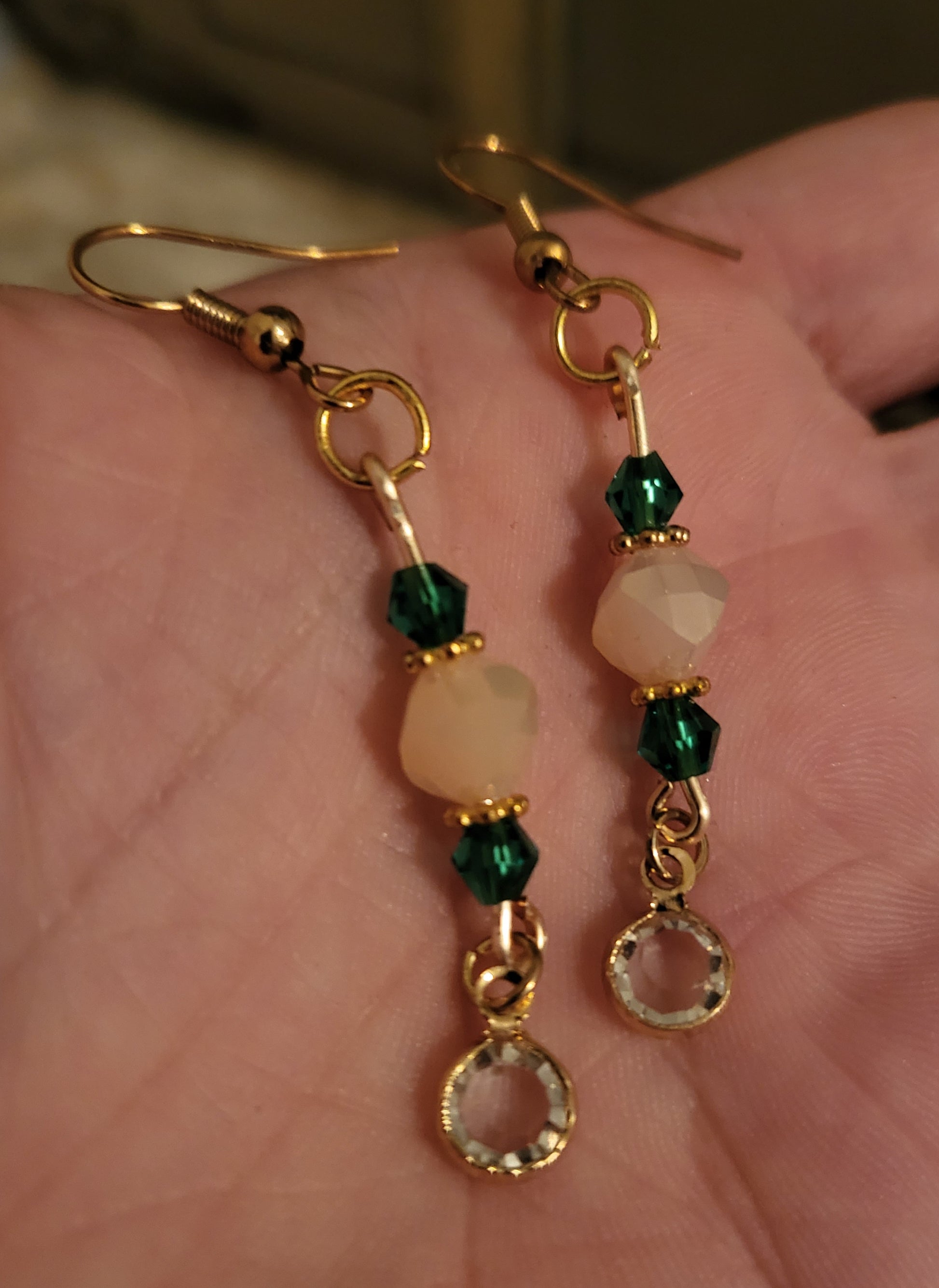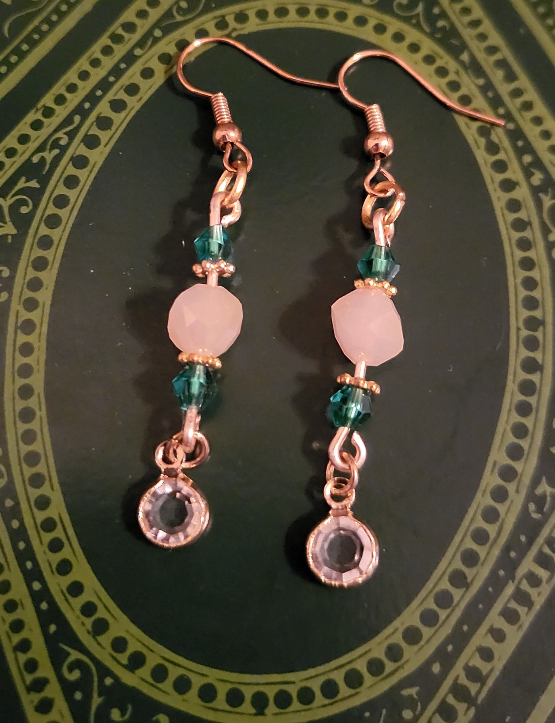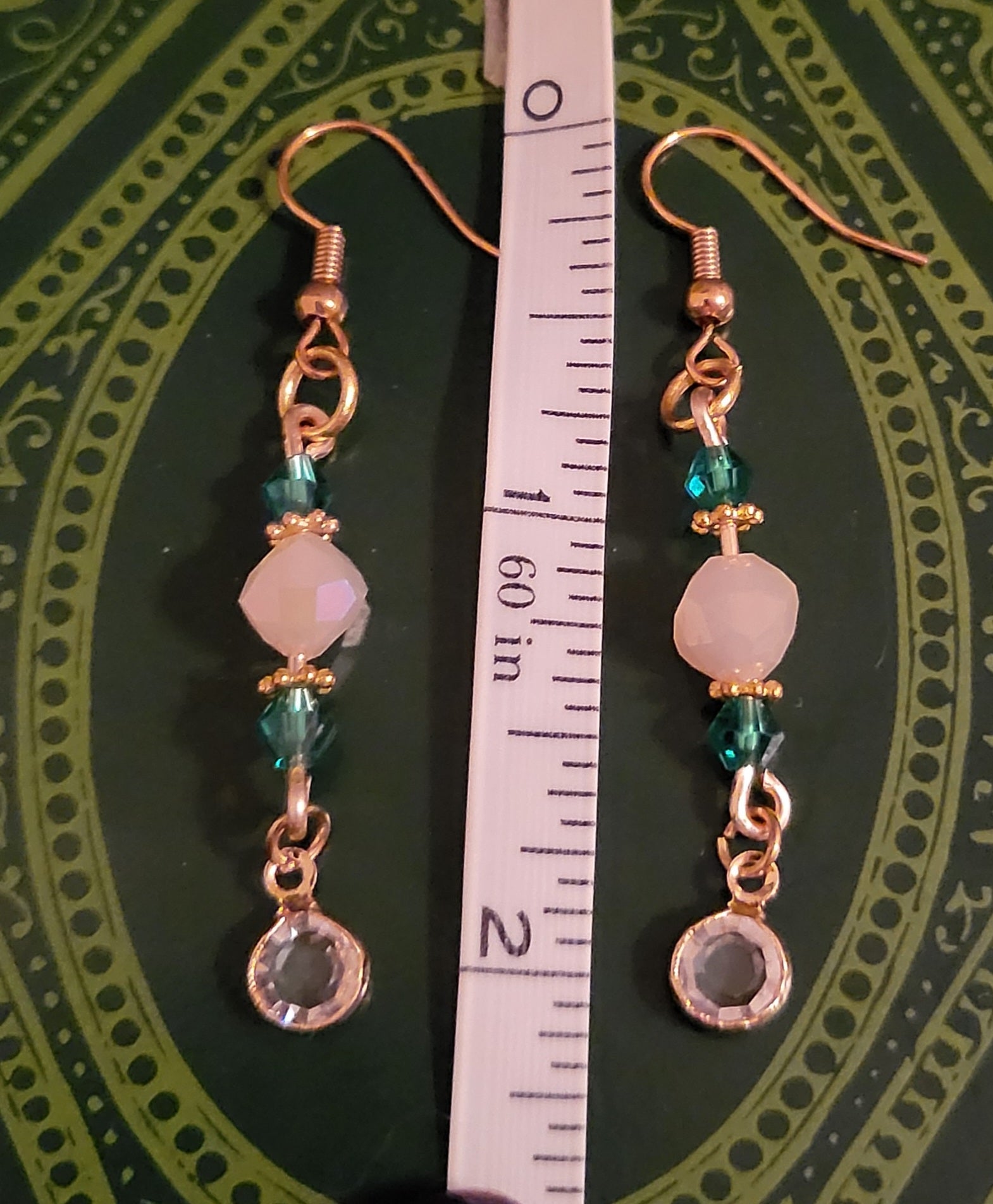 A pair of 2" earrings with light pink, white and green beads with crystal dangly charms on fishook earrings