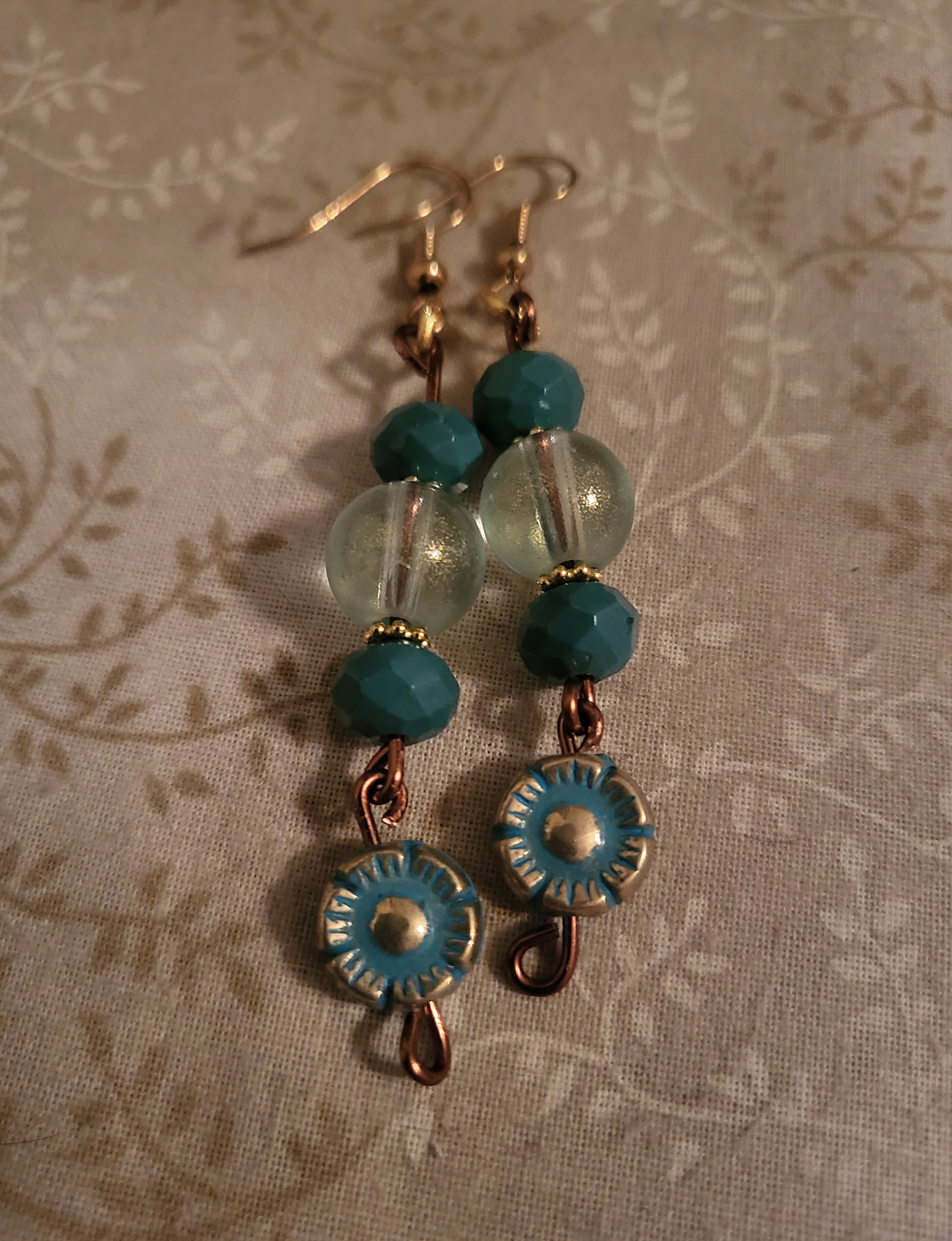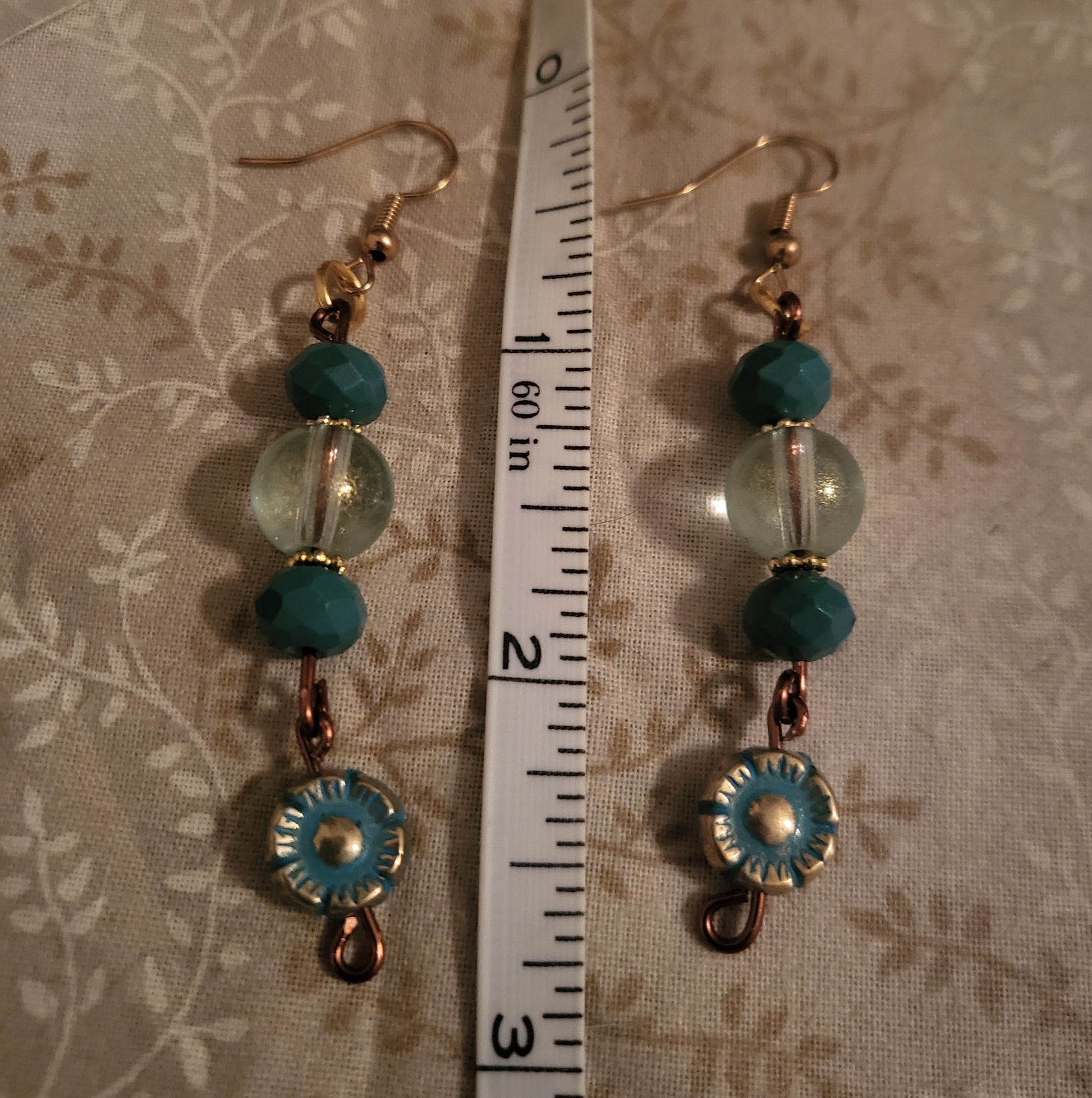 A pair of 3" inch dangly earrings on copper wire with green beads and a flower charm. Earrings are fishook with clear backs.