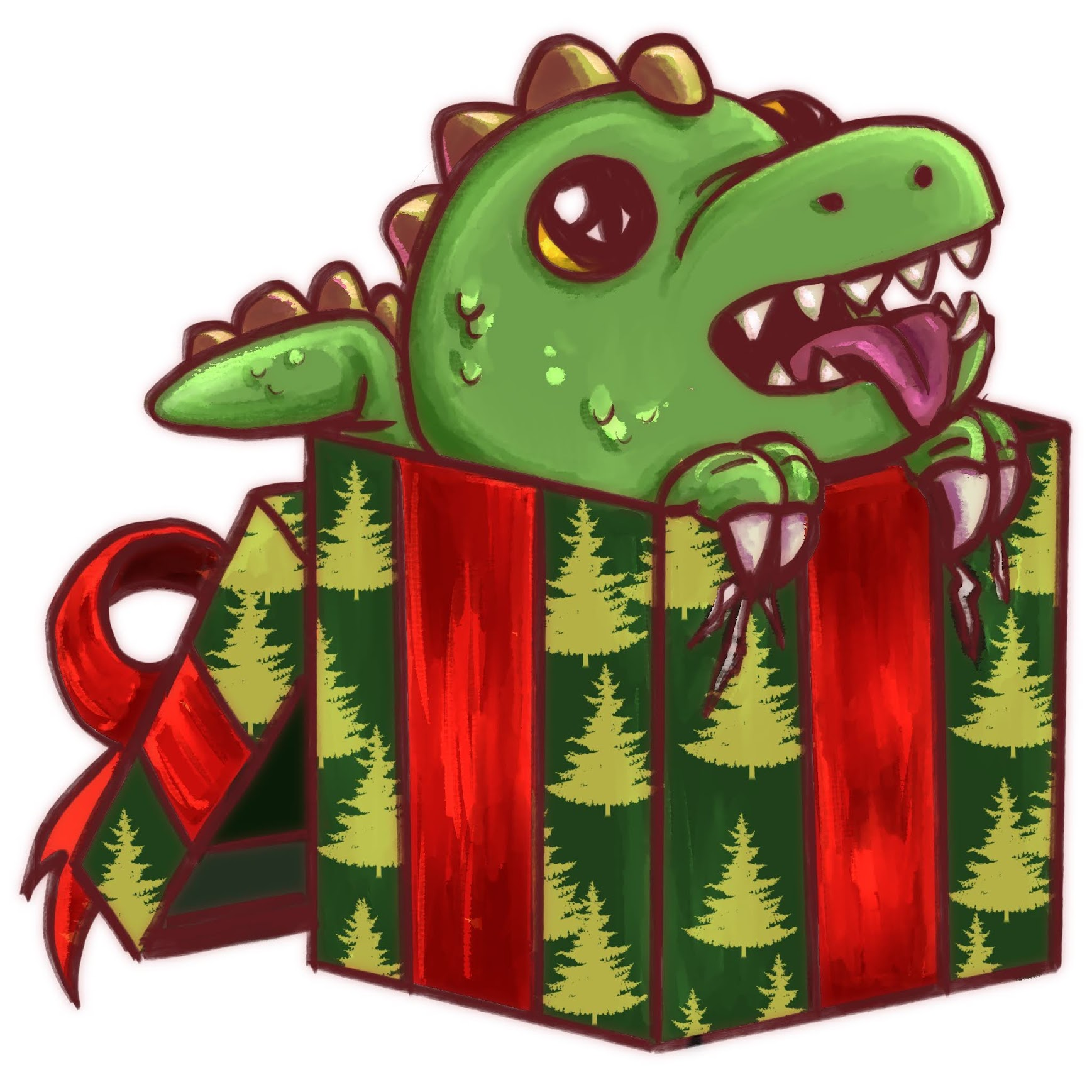 a lil t rex ouppy dog. just a lil guy. Each sticker is an inch and a half tall and covered with a holographic holly and bow laminate