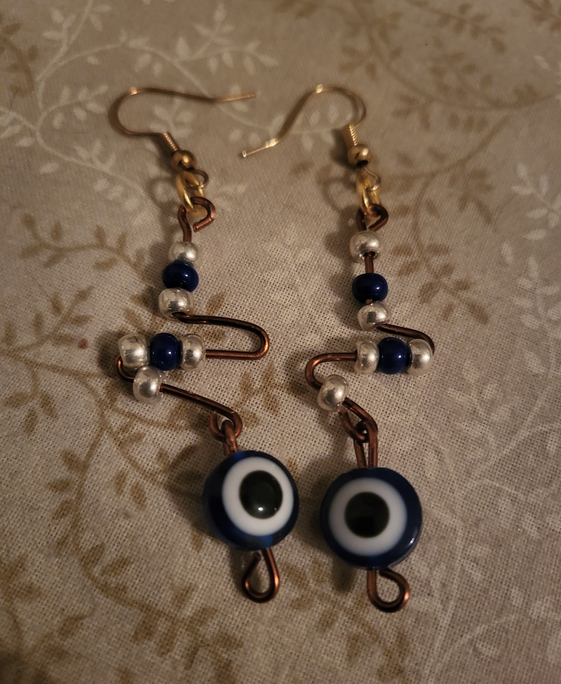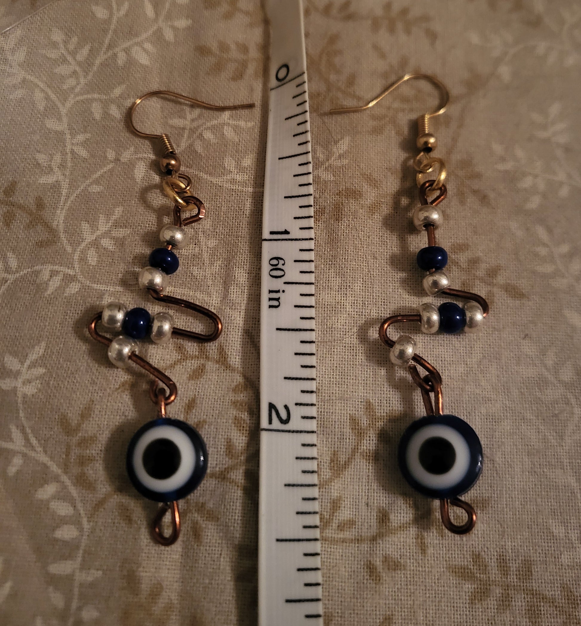 A pair of 2.5" inch dangly earrings on copper wire, beads are gold and blue with eye charms. Earrings are fishook with clear backs.