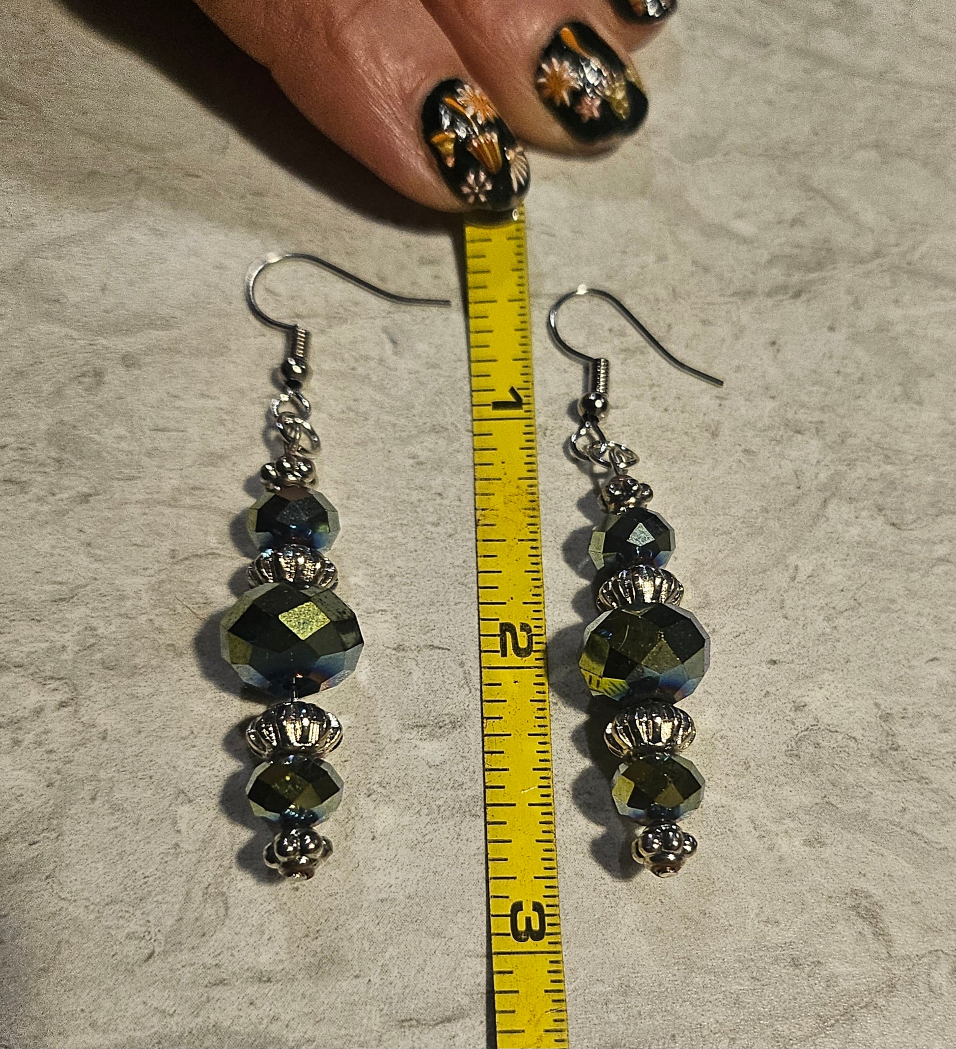 A pair of 3" earrings made from dark blue flashy glass beads on eye pins. The hardware is silver fishhook earrings.