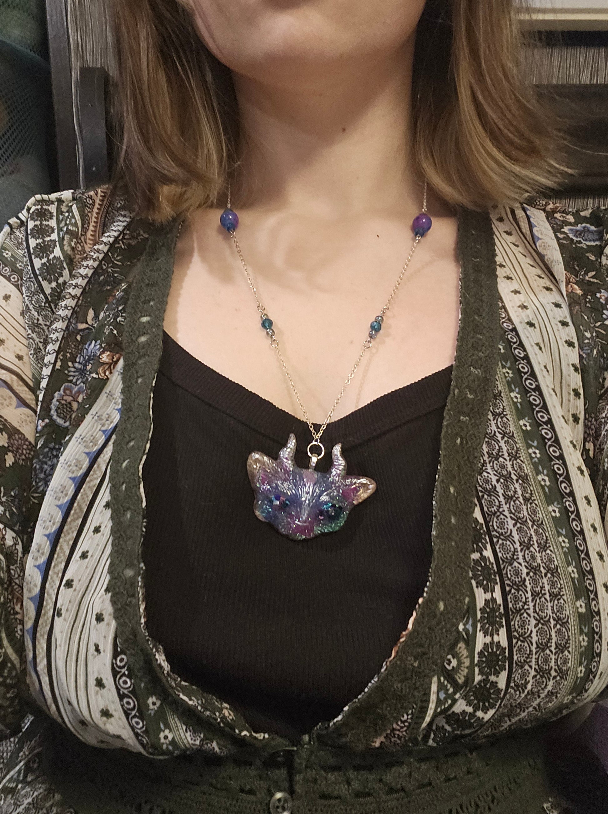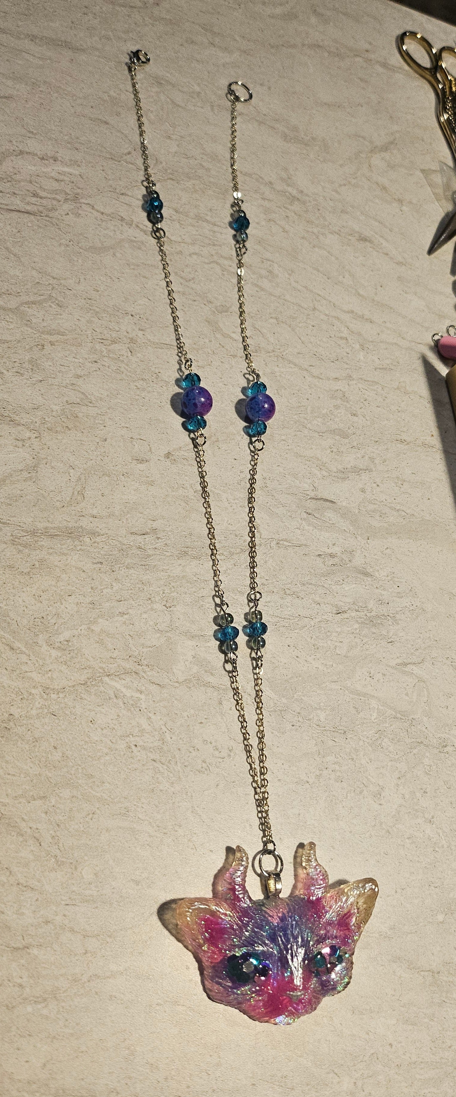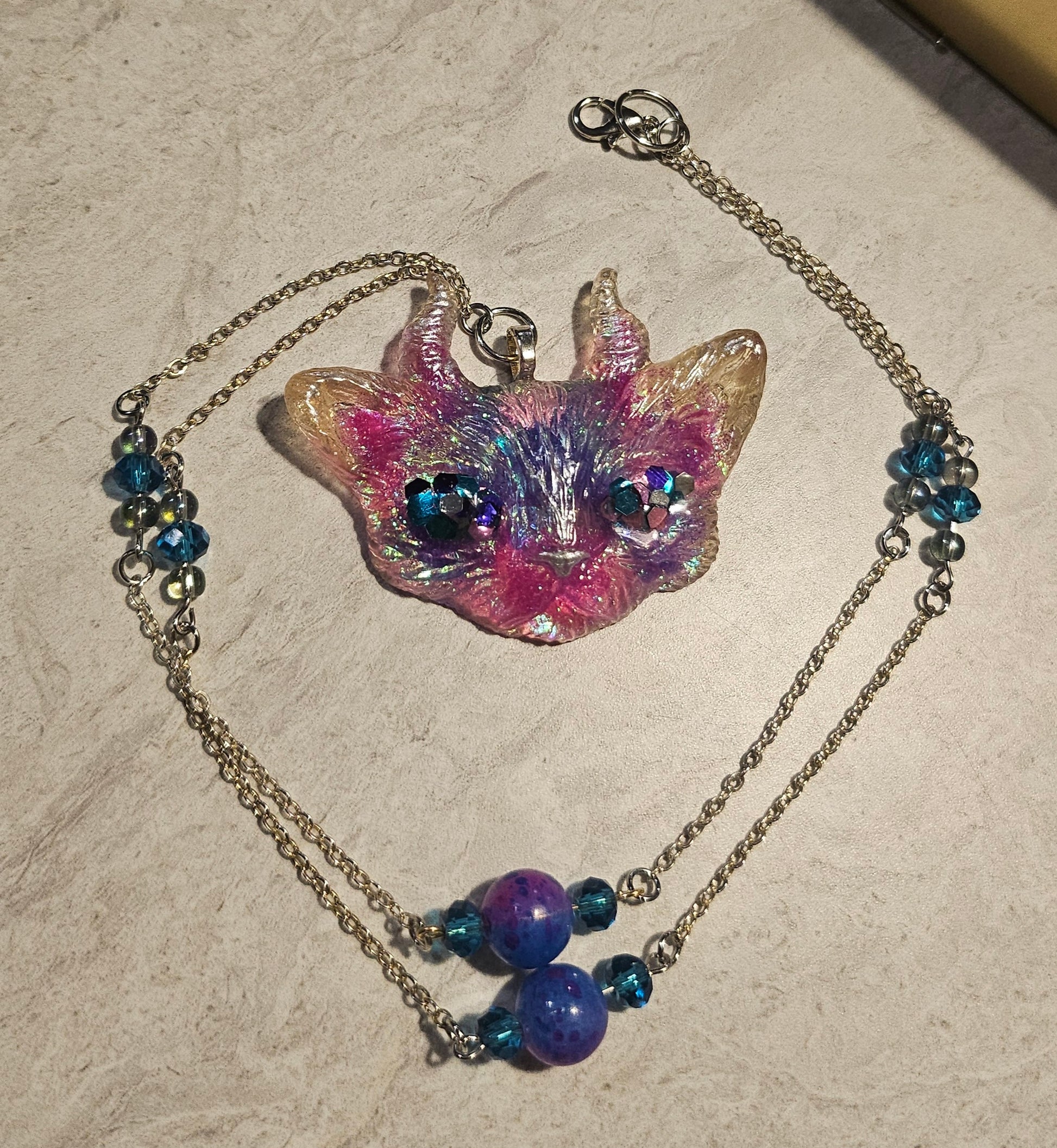 A horned odd kitty head cast from epoxy resin with pink/blue glitter spaced with glass beads.