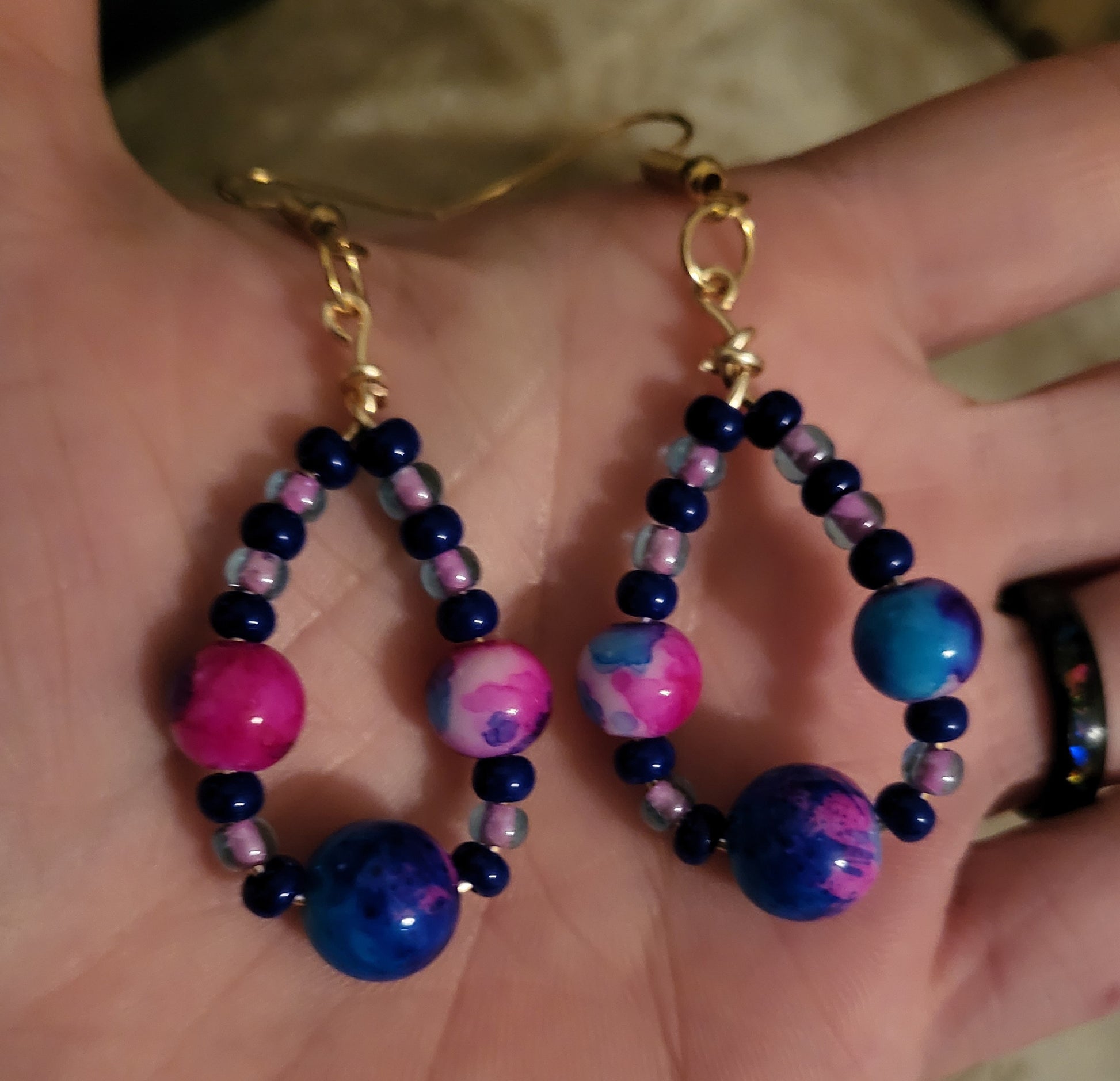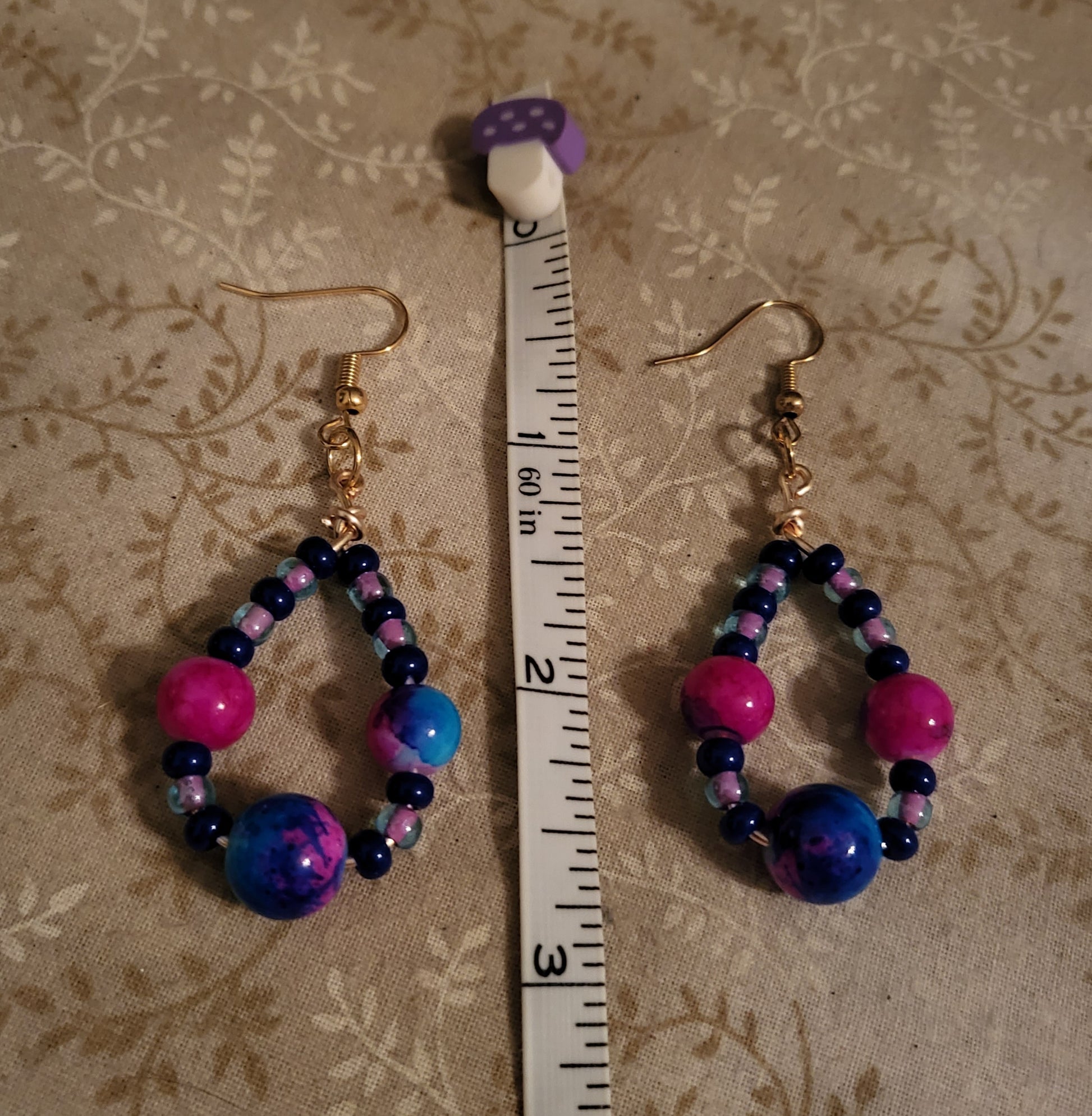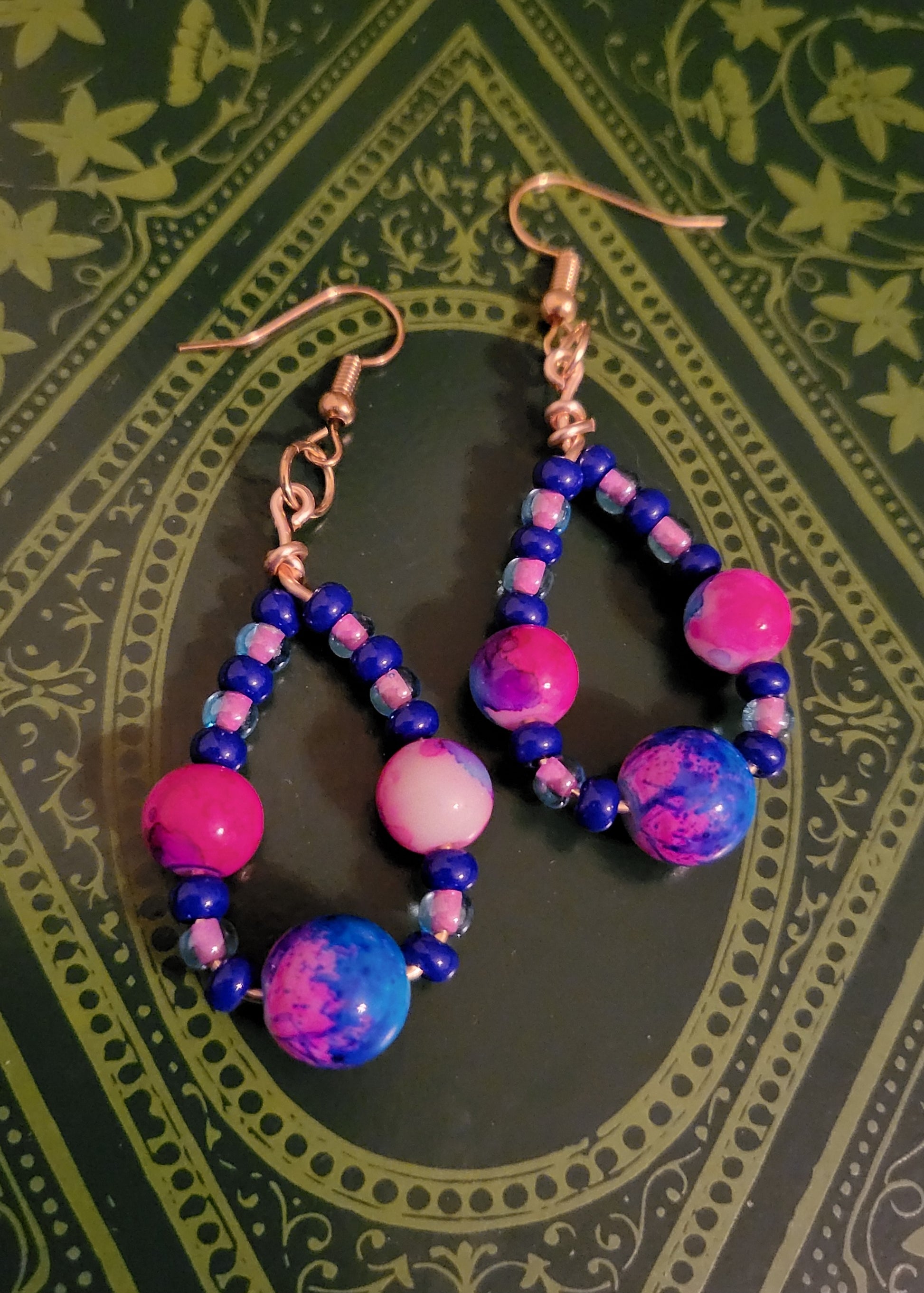 A pair of 3" dangly earrings on copper wire with fuschia and blue beads on fishook earrings.