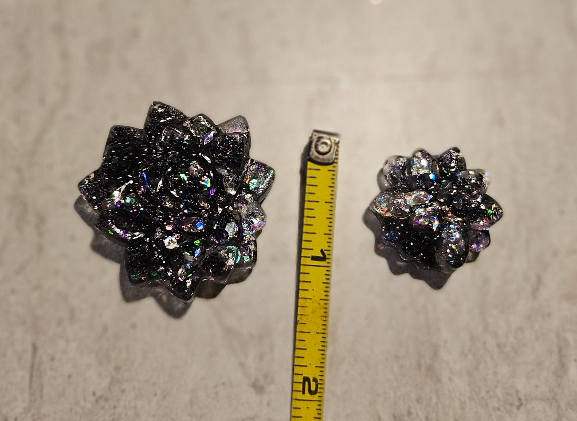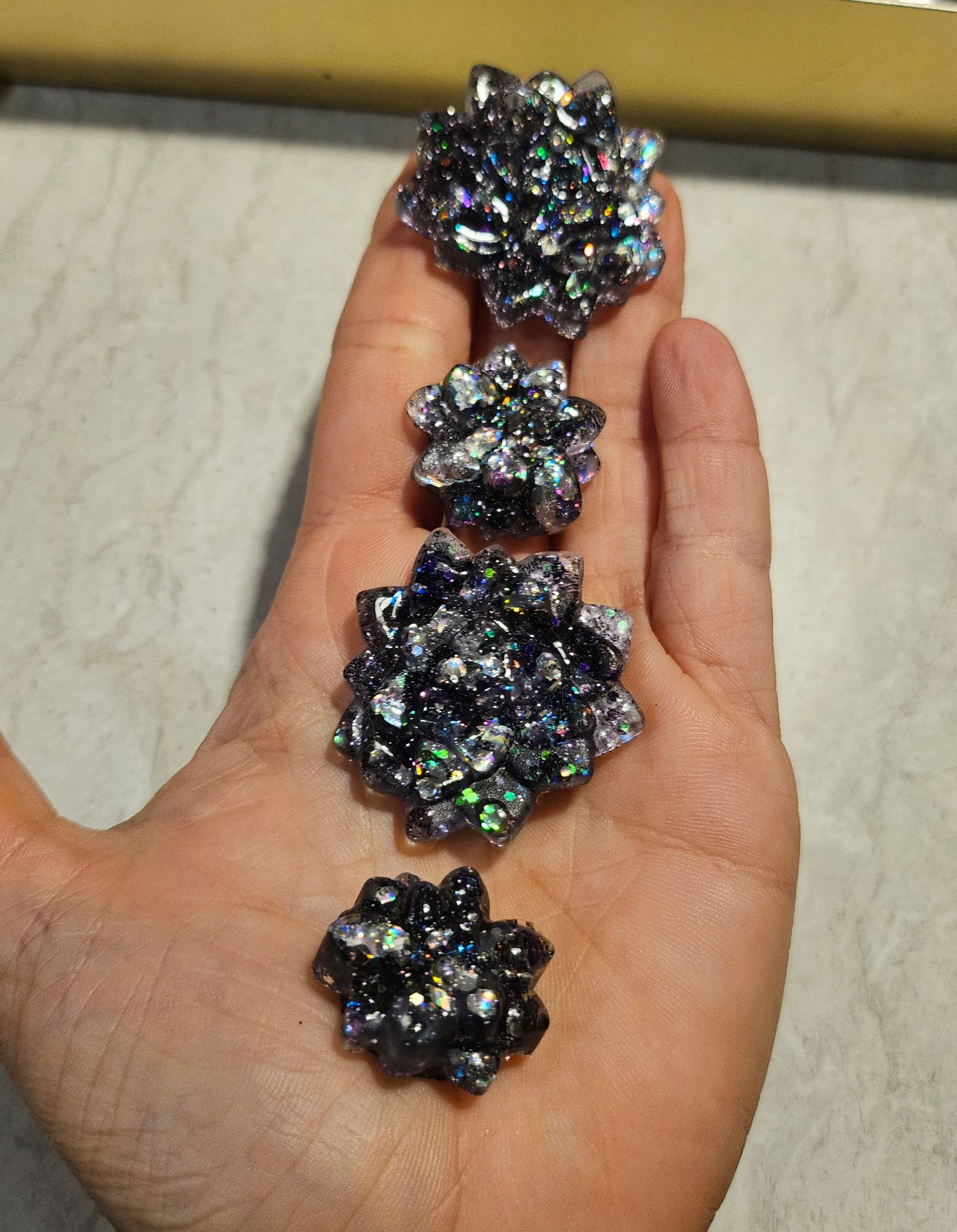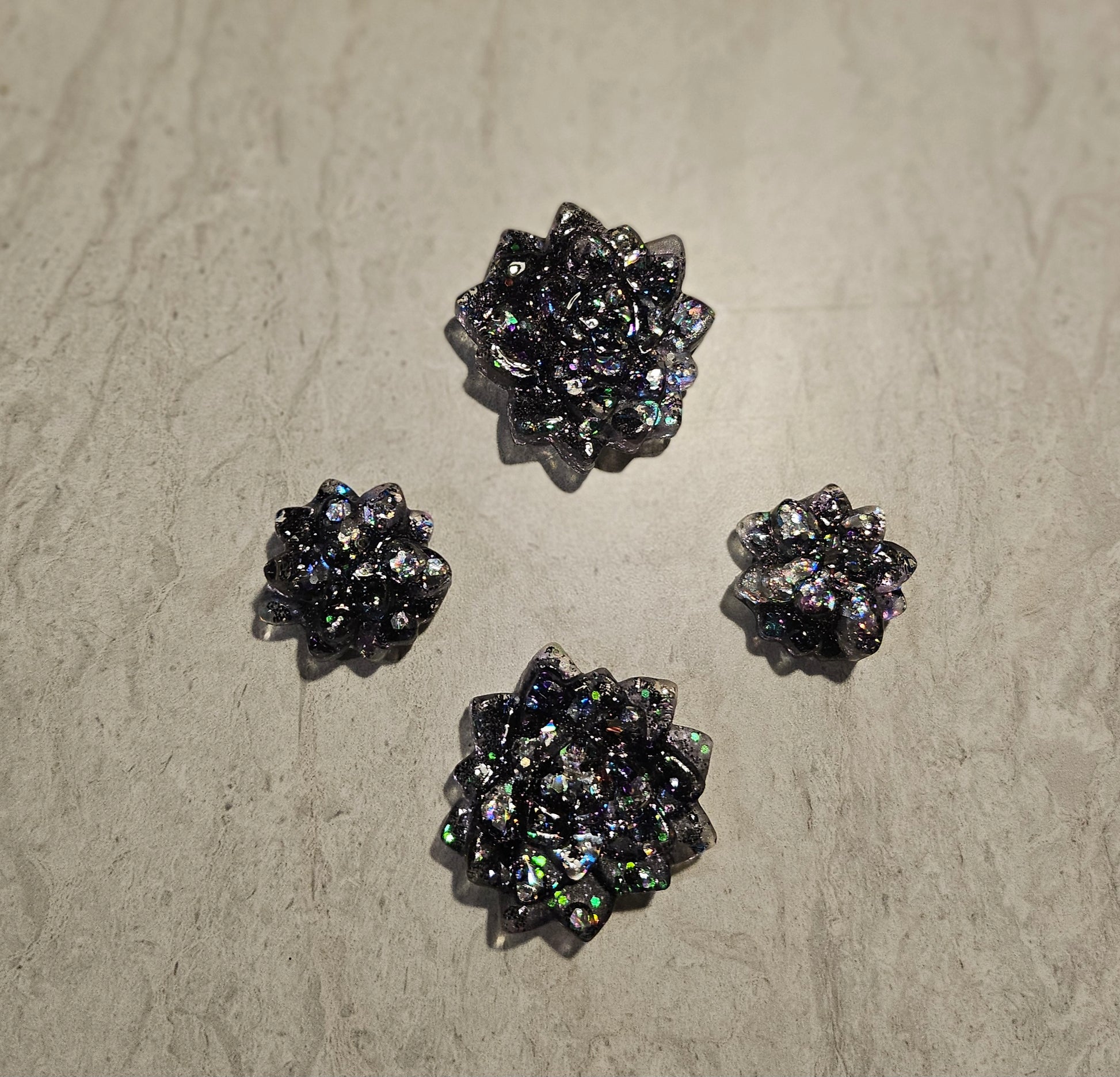 A 4 piece magnet set made from epoxy resin with a succulent mold. Fine black glitter is layered with holographic glitter. 4 magnets total, measuring 2" and 1.5".