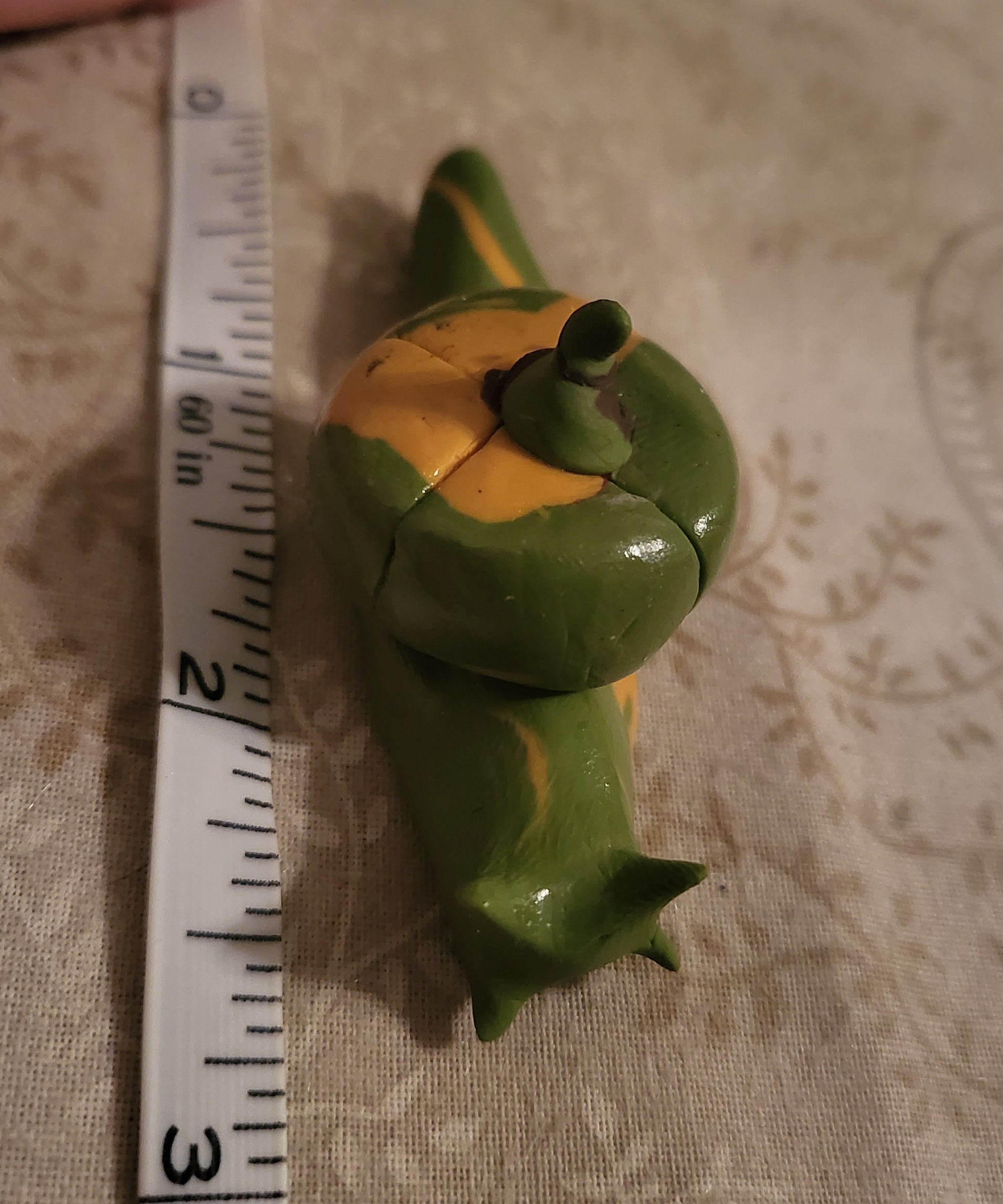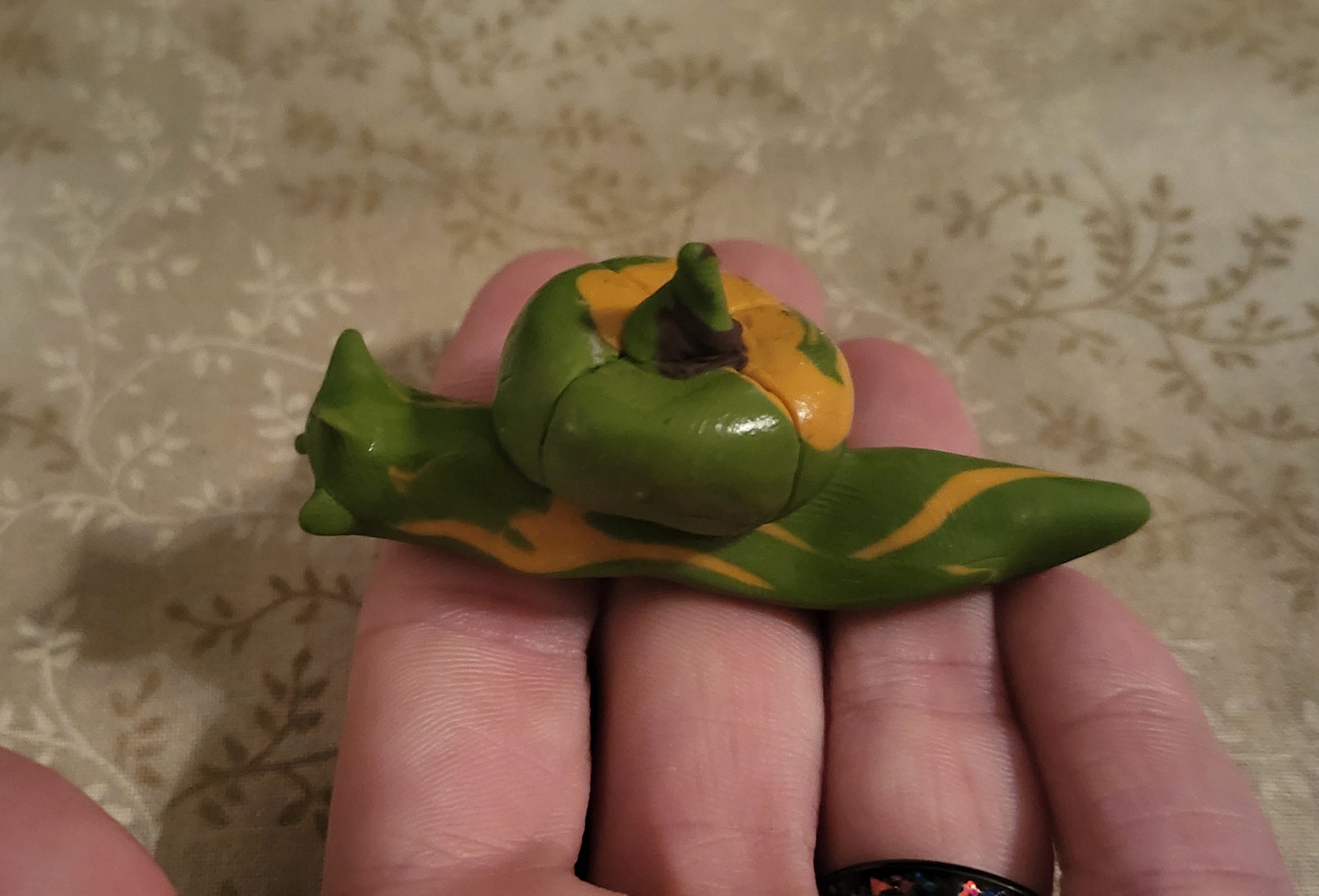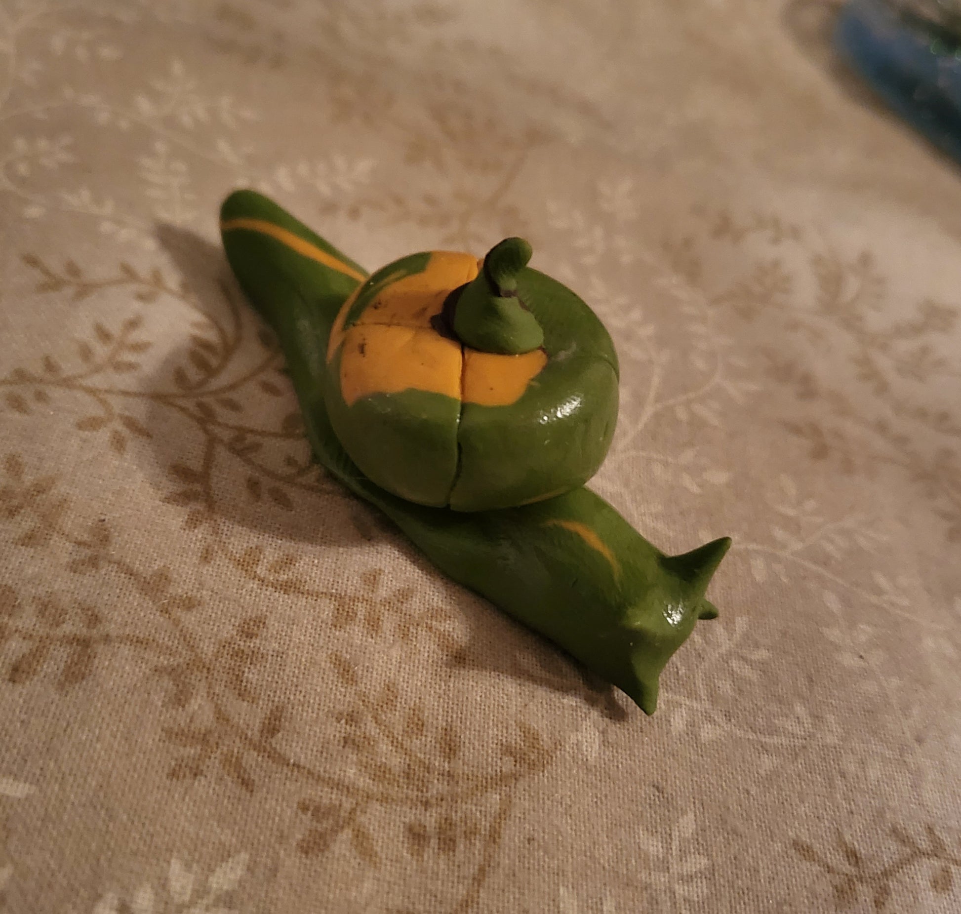 A 2.5" oven baked clay figurine of a green and orange snails with a pumpkin for a shell. Pumkpin Pals make great desk companions or paperweights.