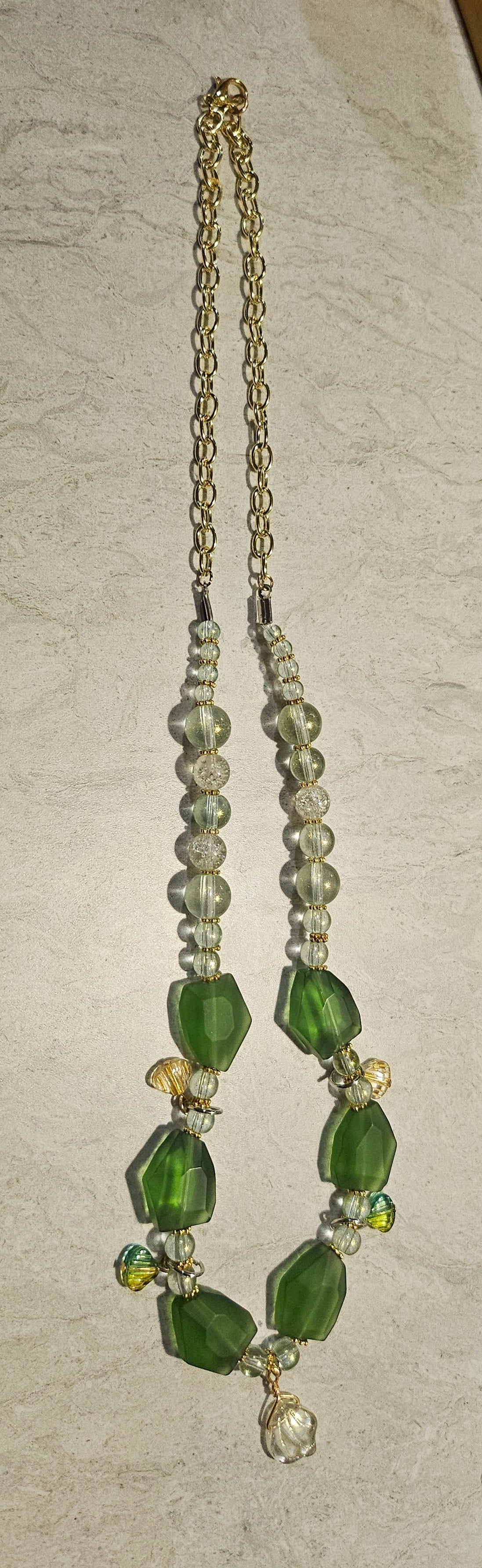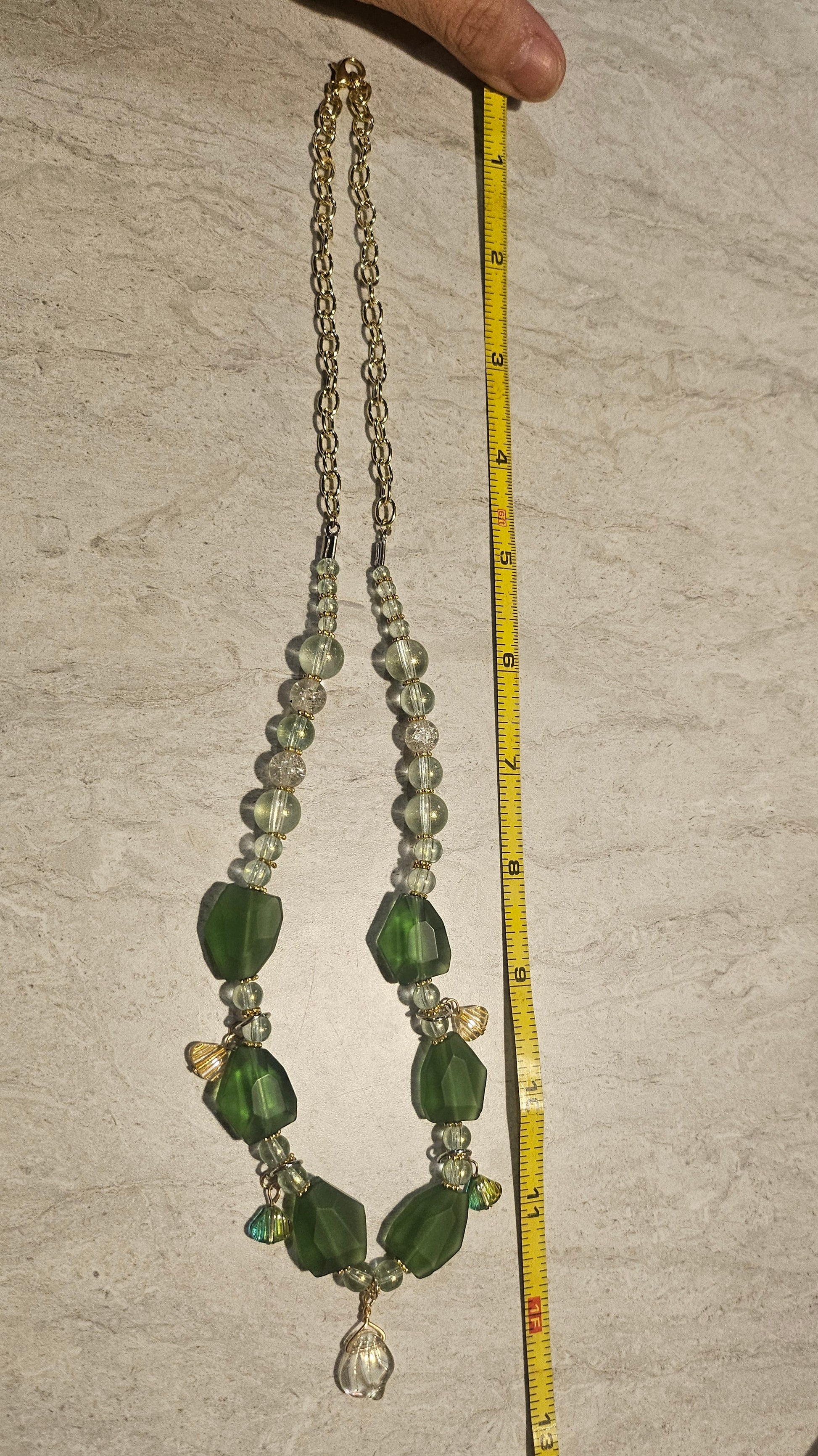 An 11" lobster clasp necklace featuring green seaglass and glass dangly seashell charms.