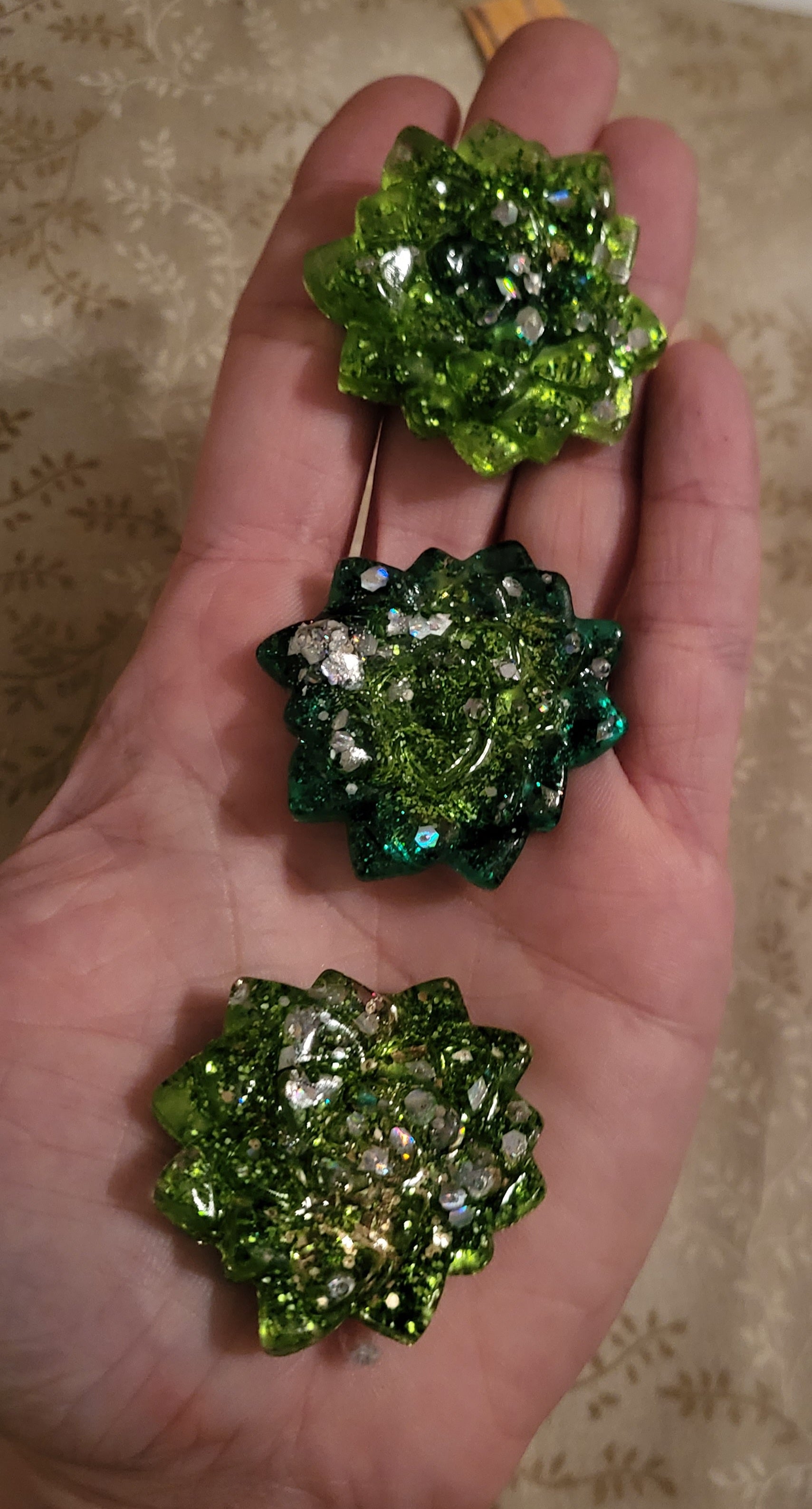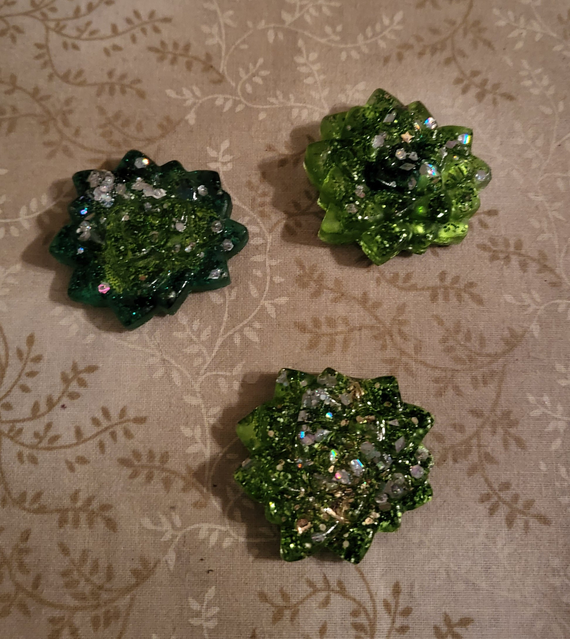 A set of 3 magnets cast from clear epoxy resin, with green and holographic glitter. Diameter of 1.5"