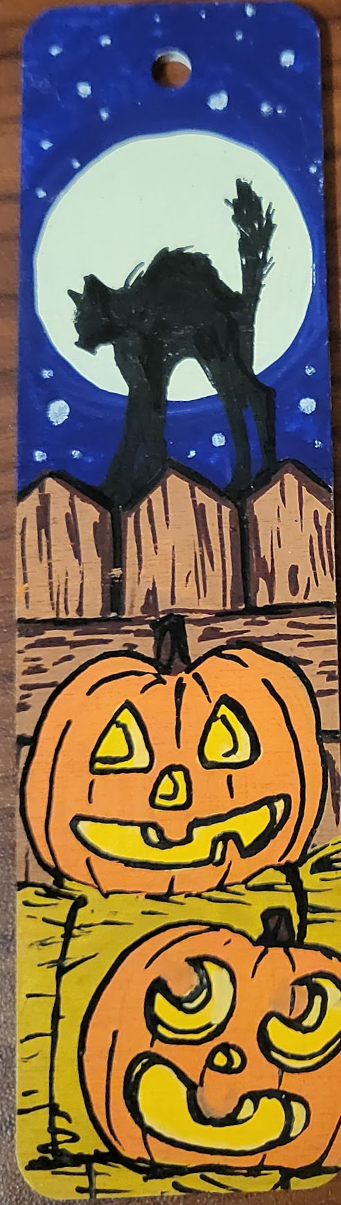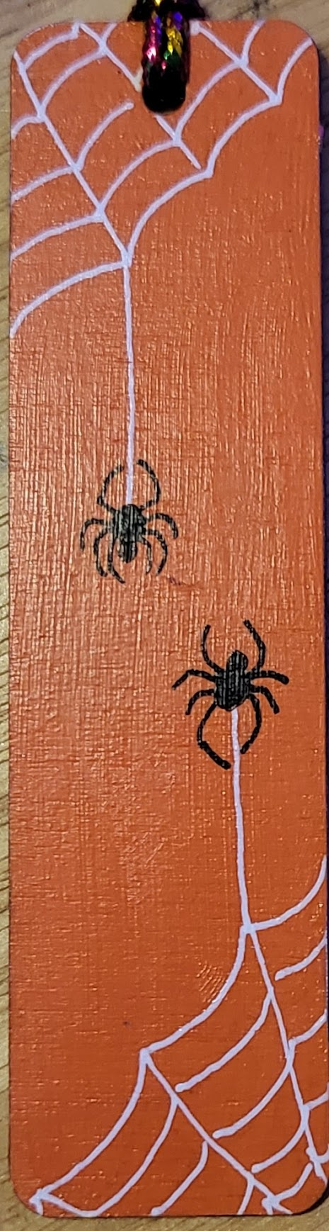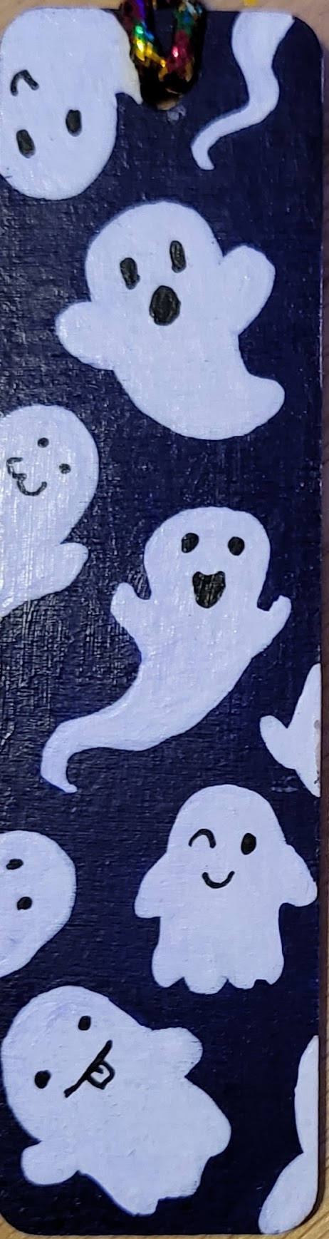 Choose between two (double sided designs) special Halloween bookmarks! Both are made of wood and painted with POSCA markers. The hole at the top is threaded with a multicolored metallic cord to easily keep your place.