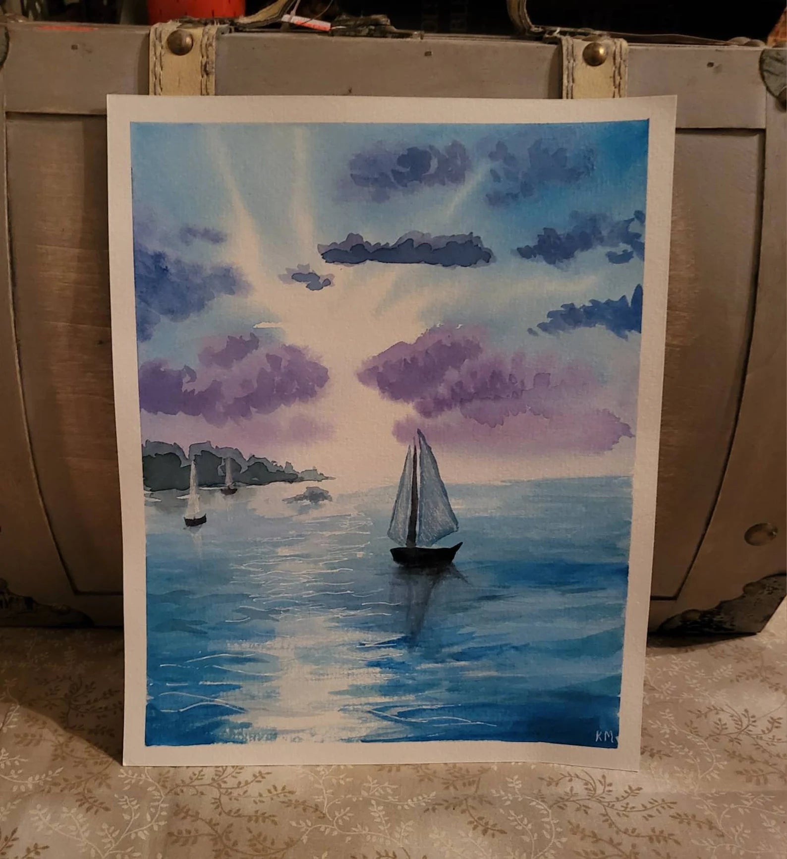 An 8x10 original watercolor painting of sailboats on the water, sky purple and blue, with a harbor in the distance. On arches watercolor color paper, art will fit into an 8x10 frame (not provided)