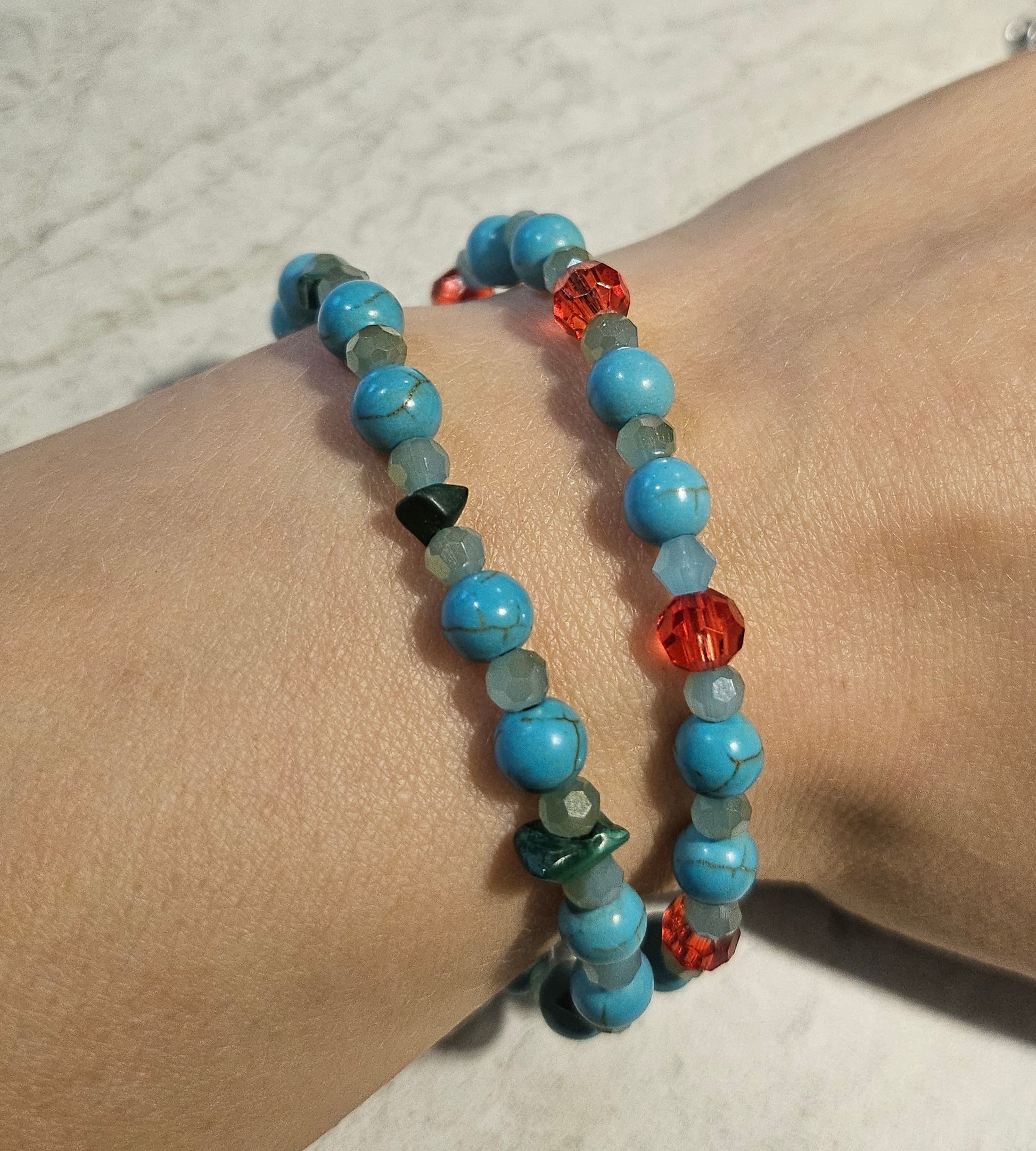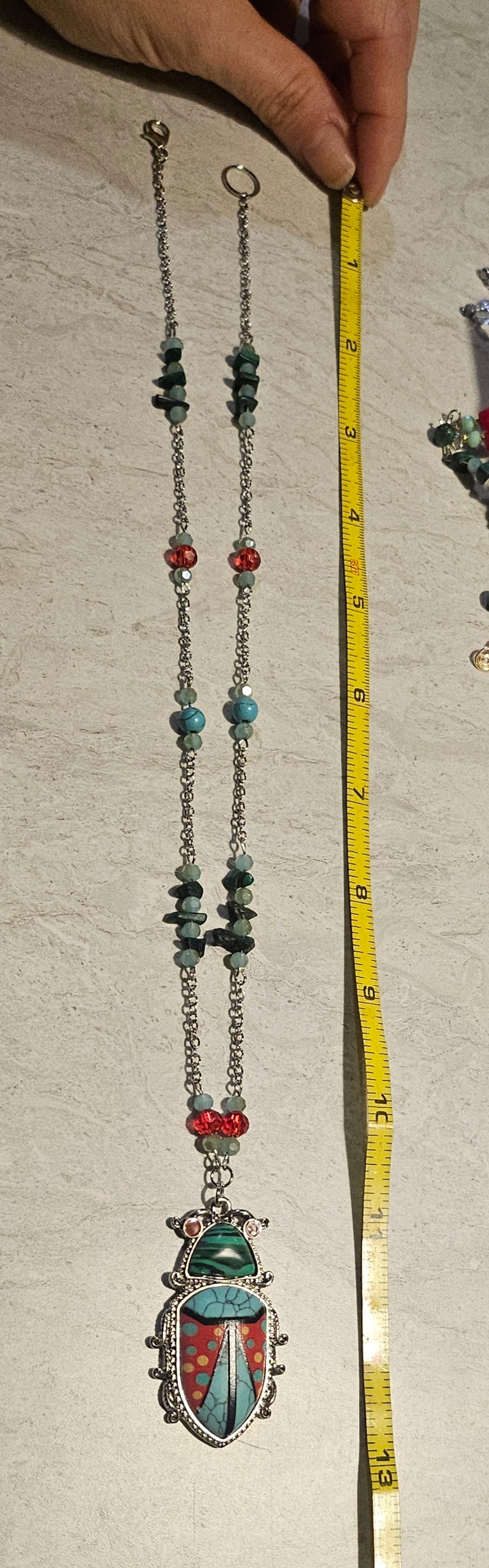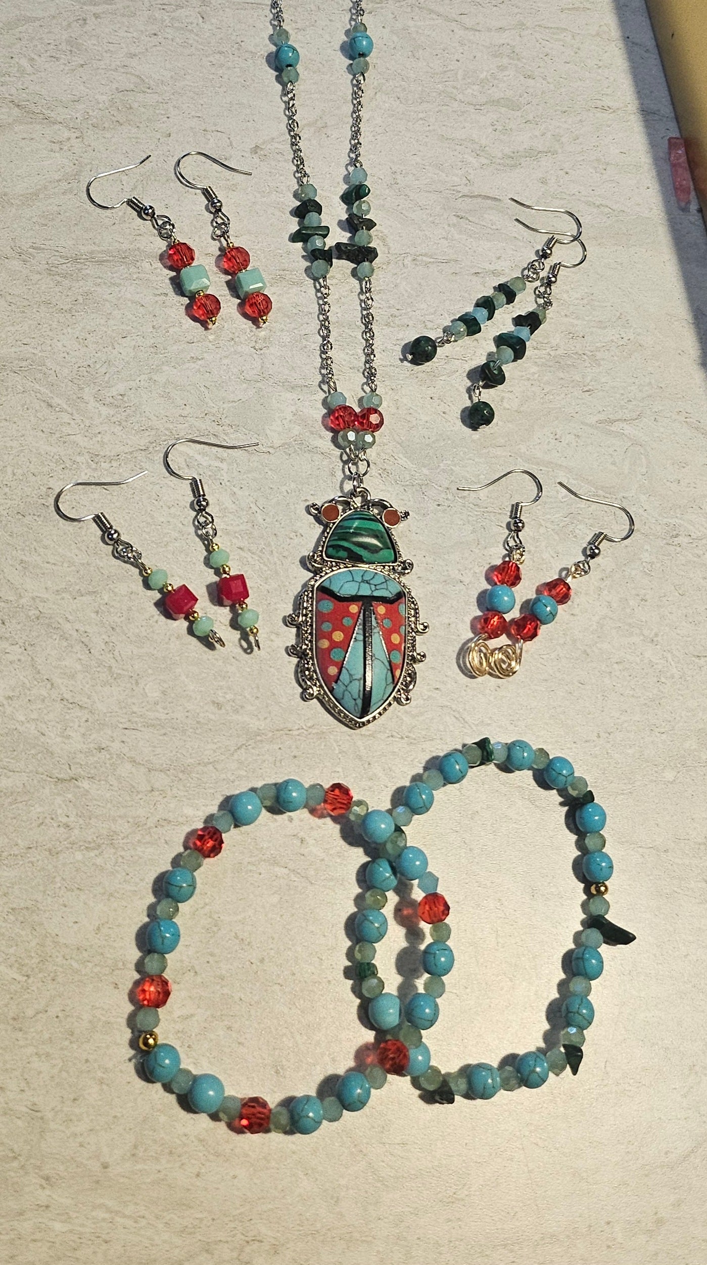 A jewelry set featuring a brightly colored beetle pendant accented with turquoise and malachite chips. There are 4 pairs of earrings that compliment the pendant made with glass red beads and turquoise/malachite and a set of 7" stretchy bracelets.
