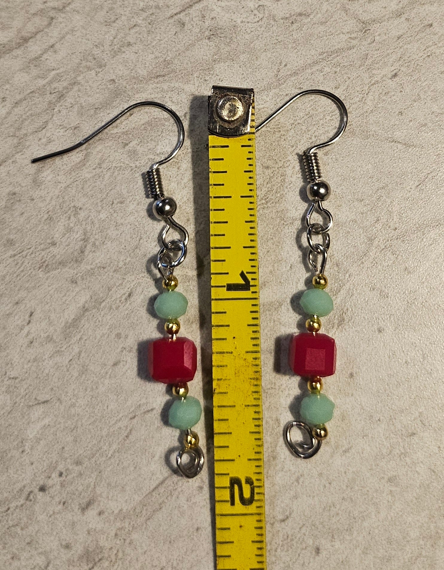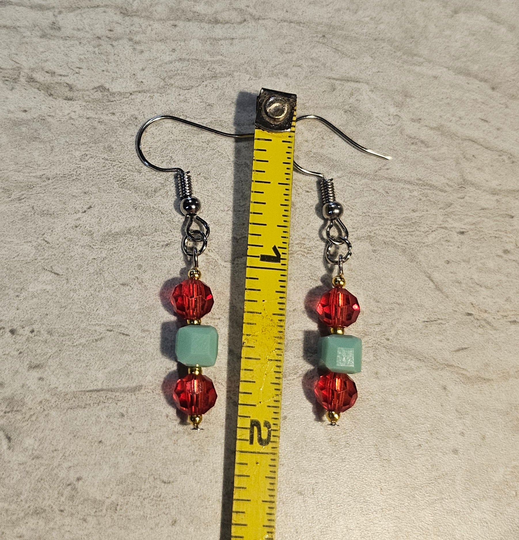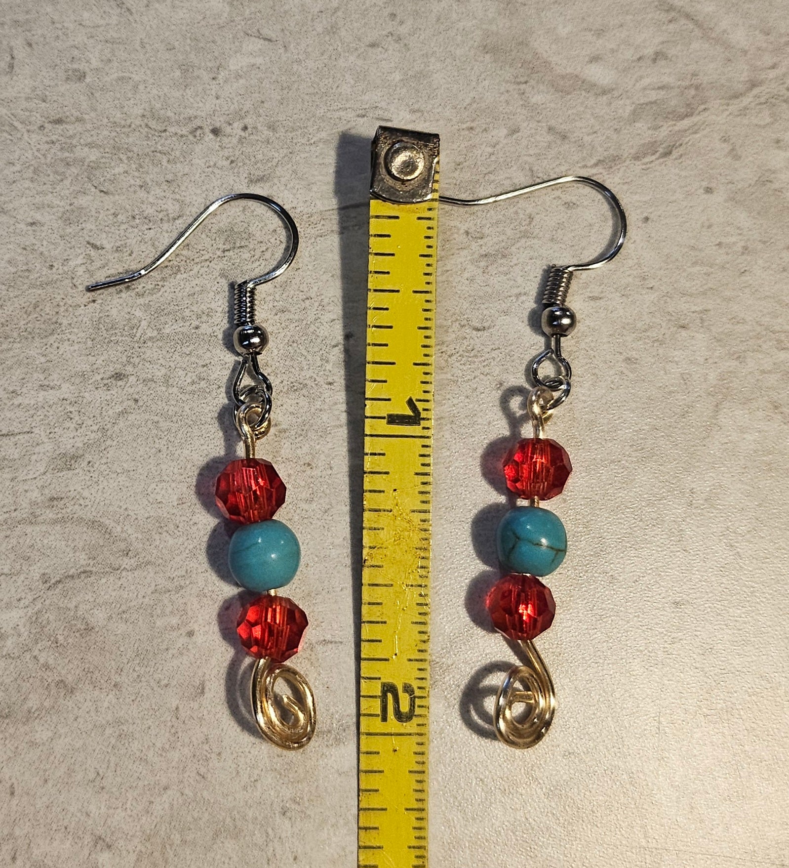 A jewelry set featuring a brightly colored beetle pendant accented with turquoise and malachite chips. There are 4 pairs of earrings that compliment the pendant made with glass red beads and turquoise/malachite and a set of 7" stretchy bracelets.