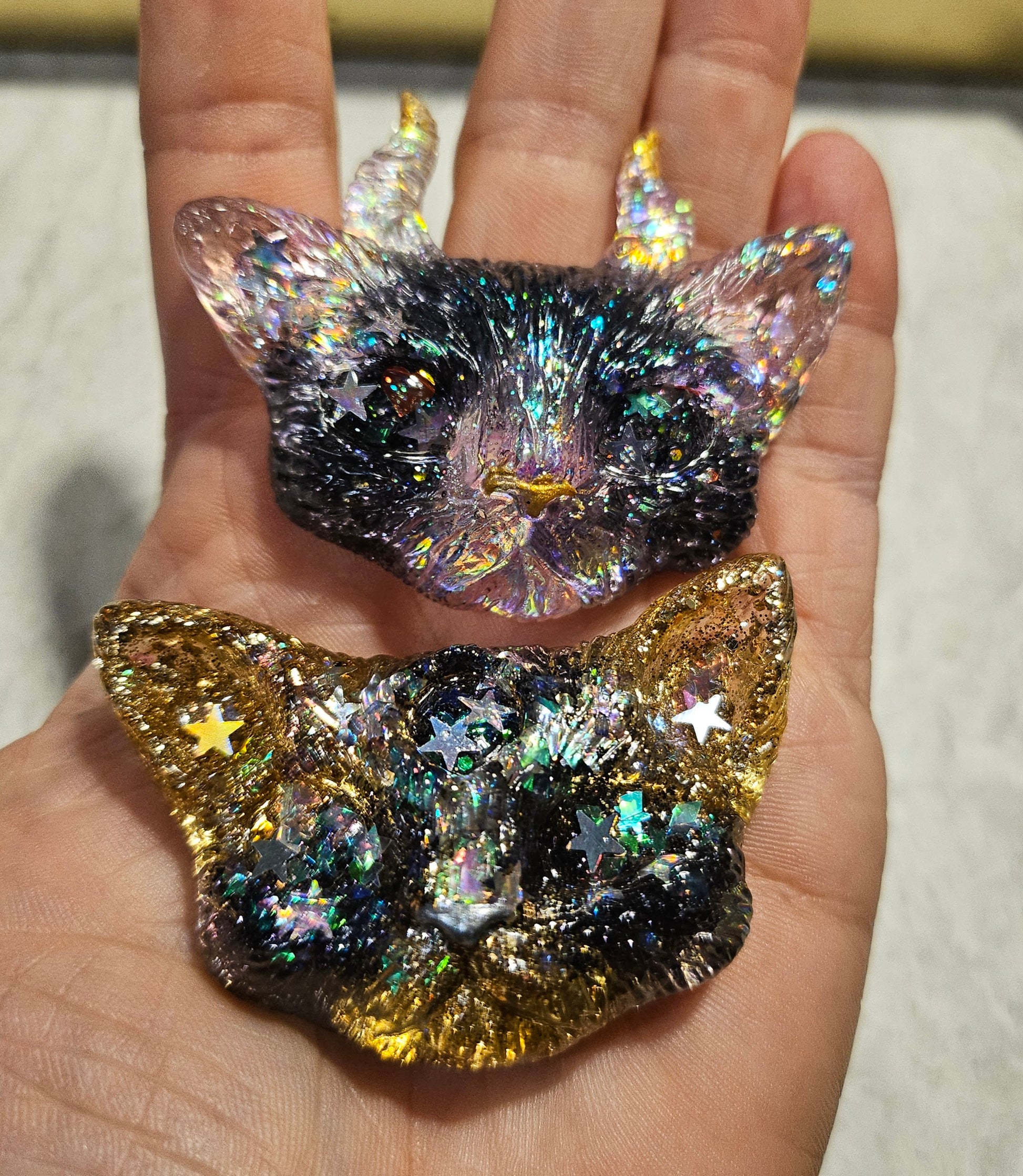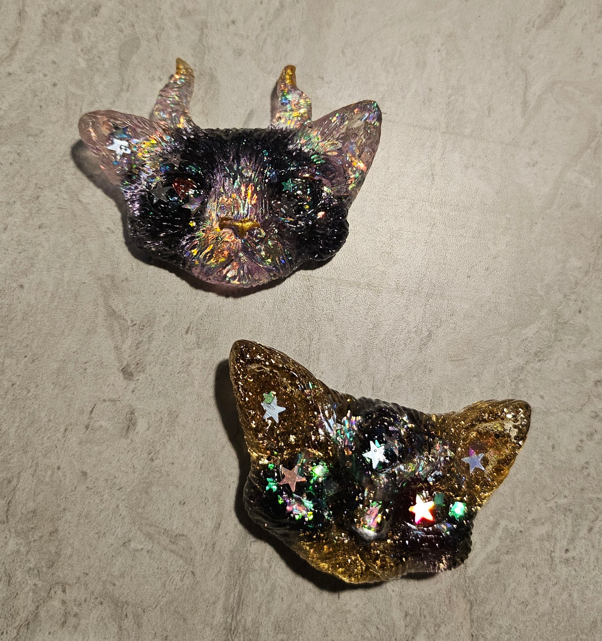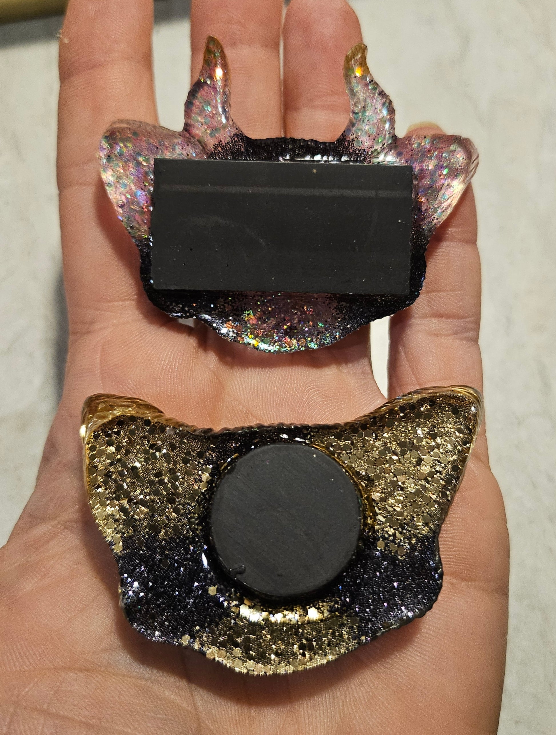 A set of Odd Kitty magnets poured from epoxy resin and lavender/gold/black glitter.