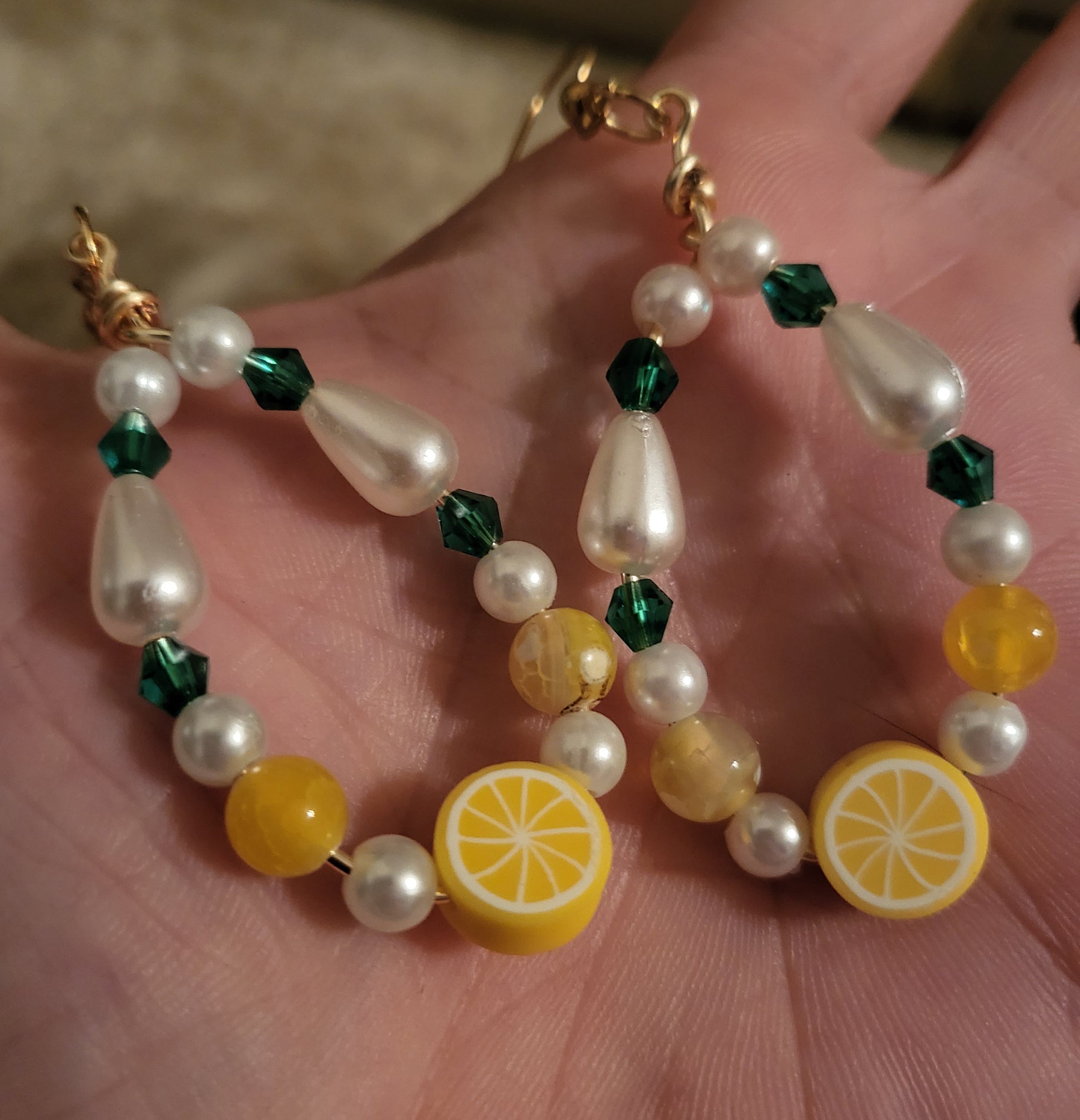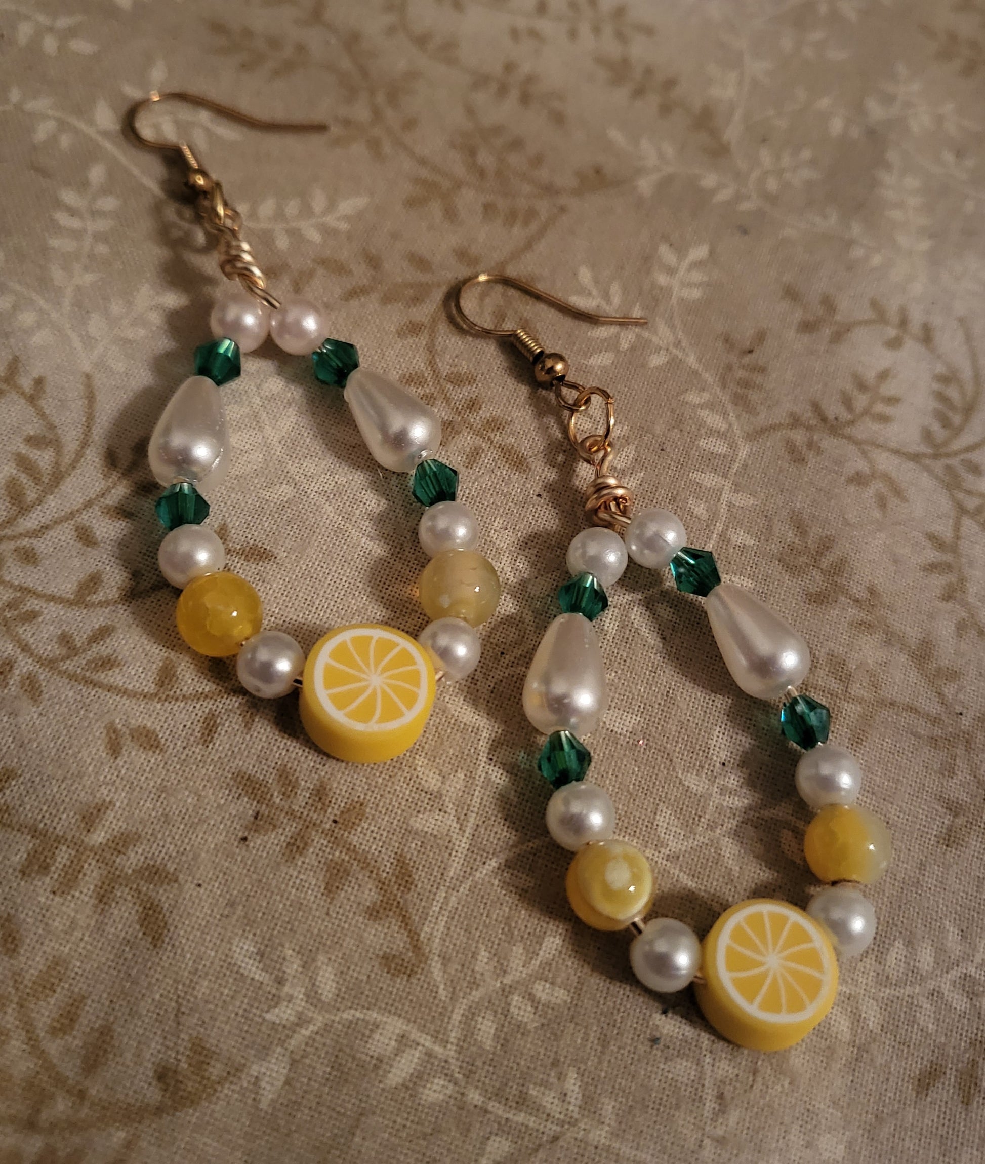 A pair of 3" earrings on copper wire featuring a lemon bead with teardrop faux pearls and green beads as accents. On fishhook earrings.