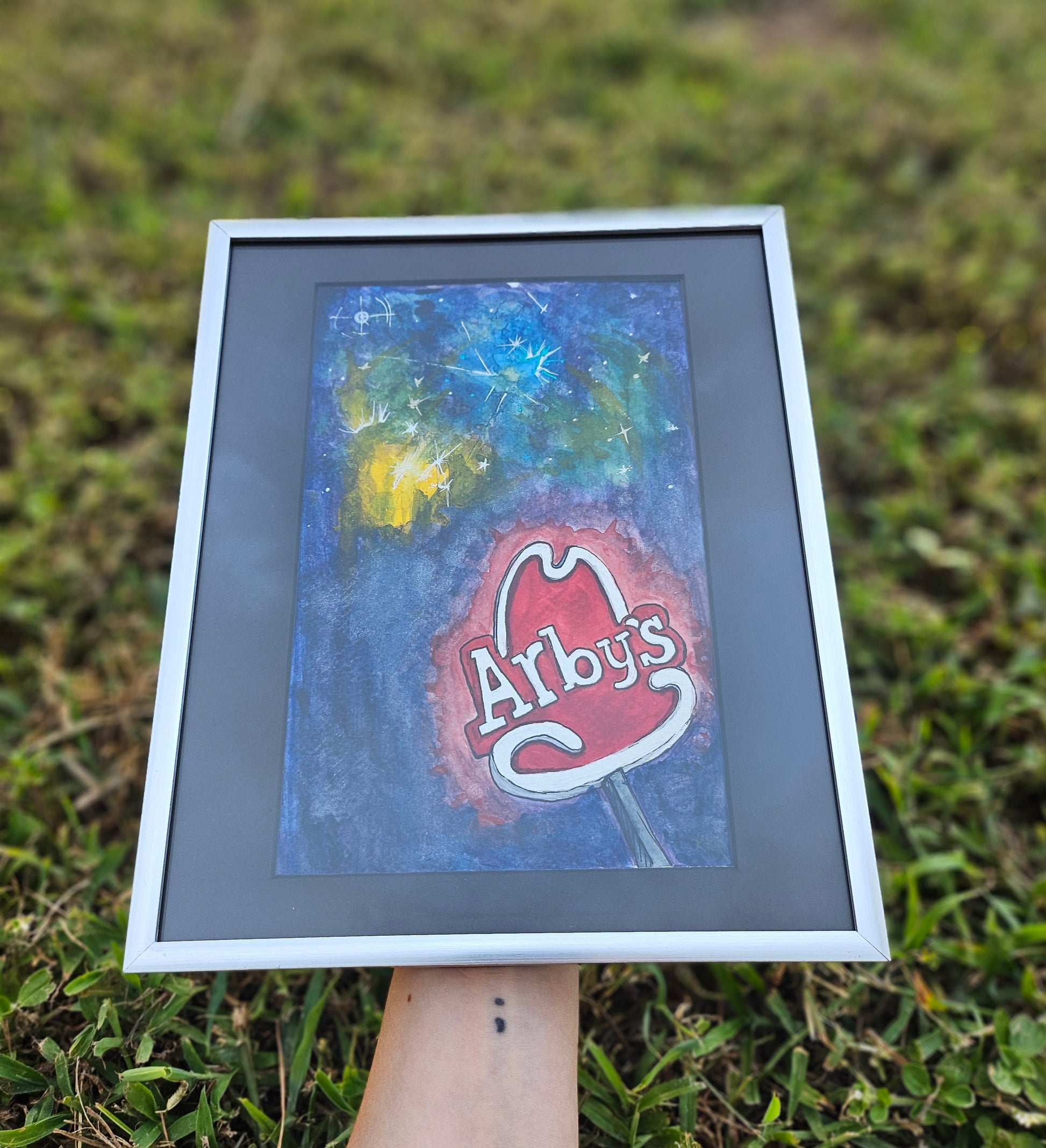 A 6 x 9 original watercolor painting of the lights over the Arby's.