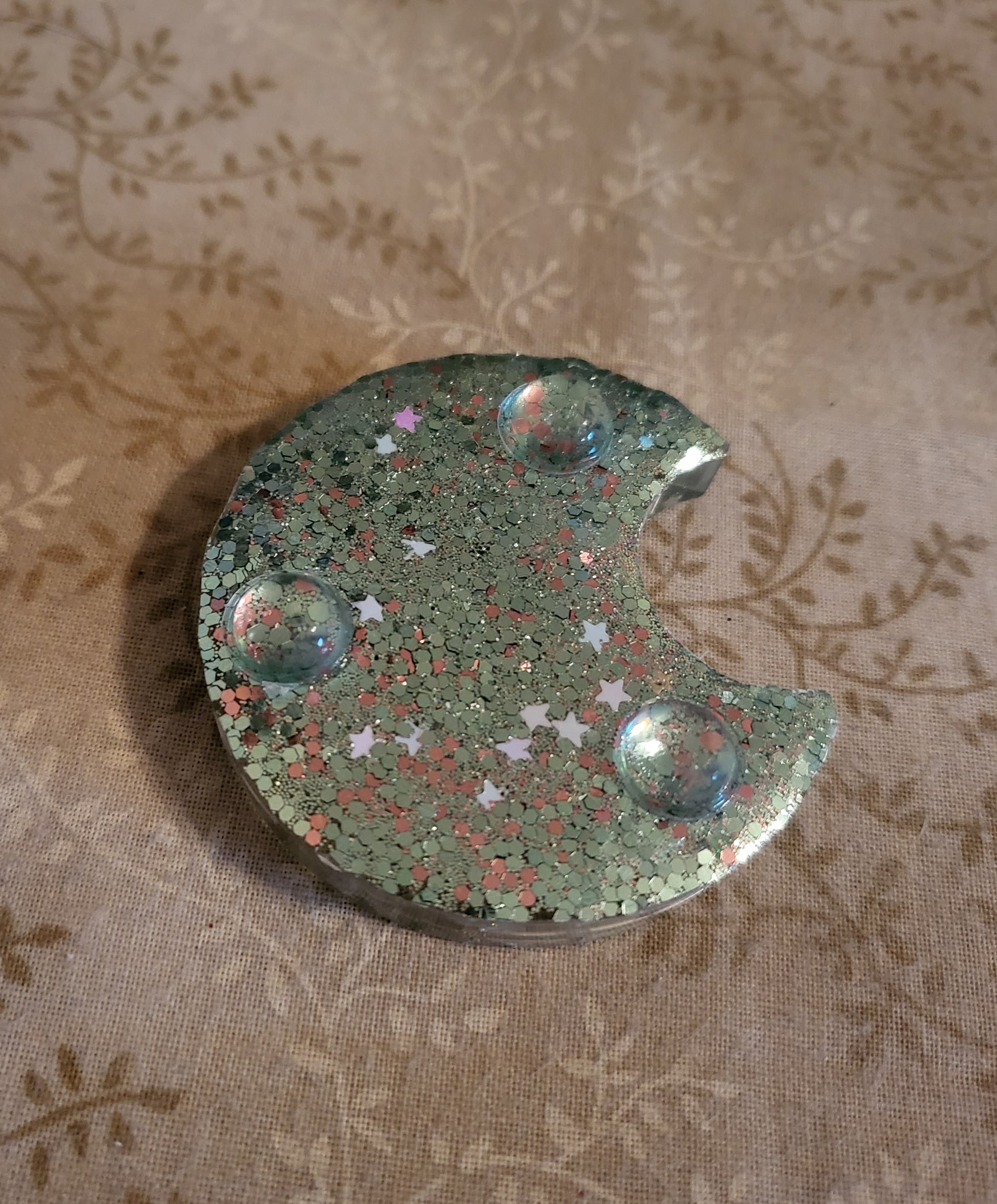 A 2" crescent moon shaped jewelry tray made with clear epoxy resin and glitter. Main glitter color is light blue with gold and silver stars. Bottom of tray had 3 bump ons to prevent sliding.