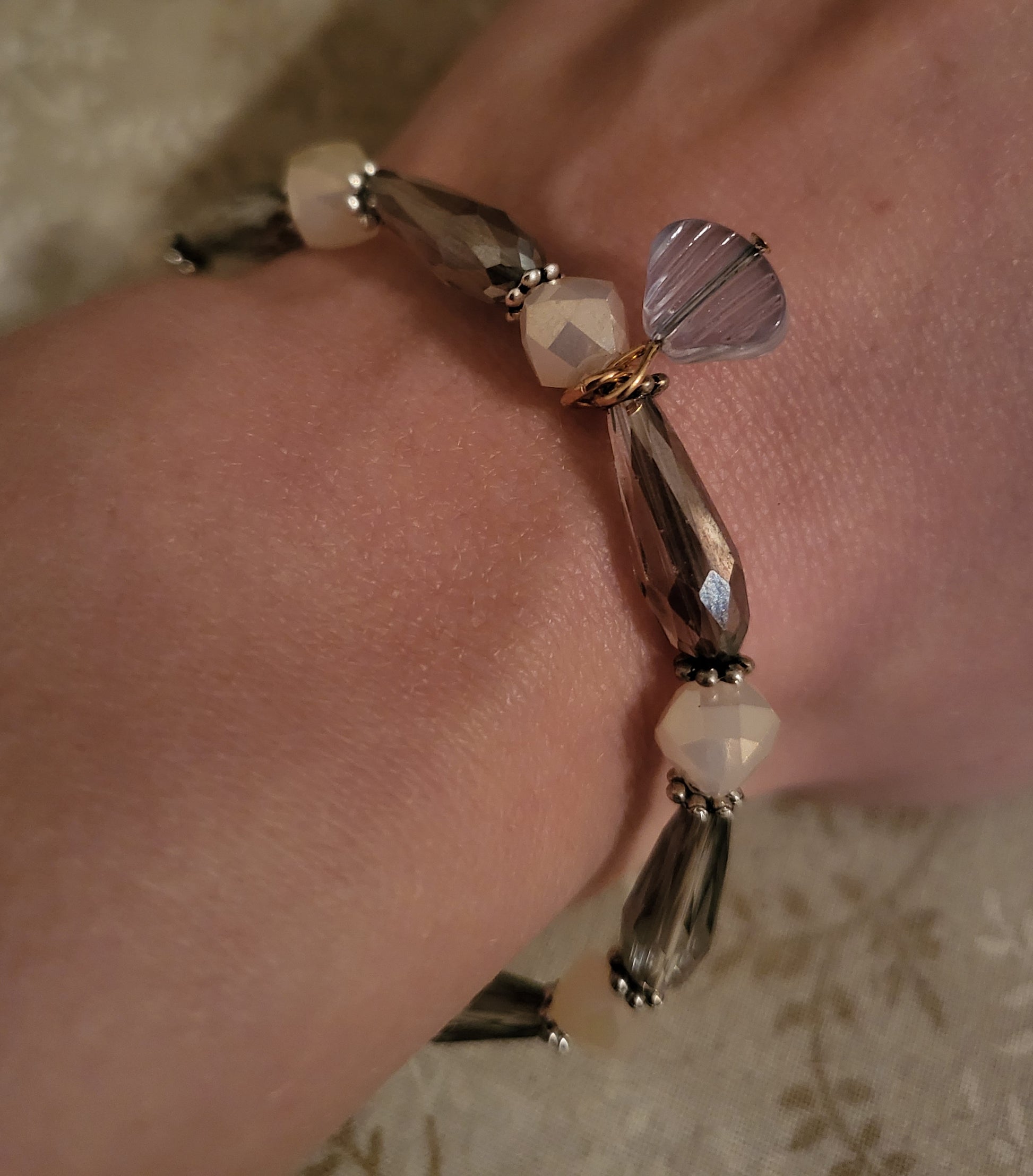 The Monochrome Mermaid charm bracelet features light grey and cream beads š©¶ Charms include tiny glass seashells. The bracelet fits a wrist diameter of 7 inches and the knot is secured with a crimp bead.