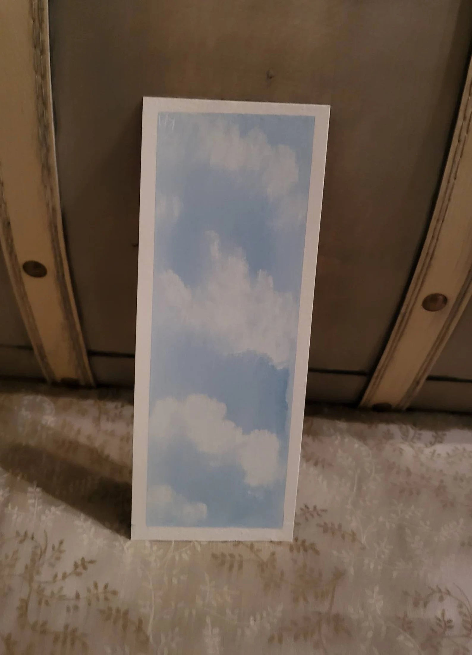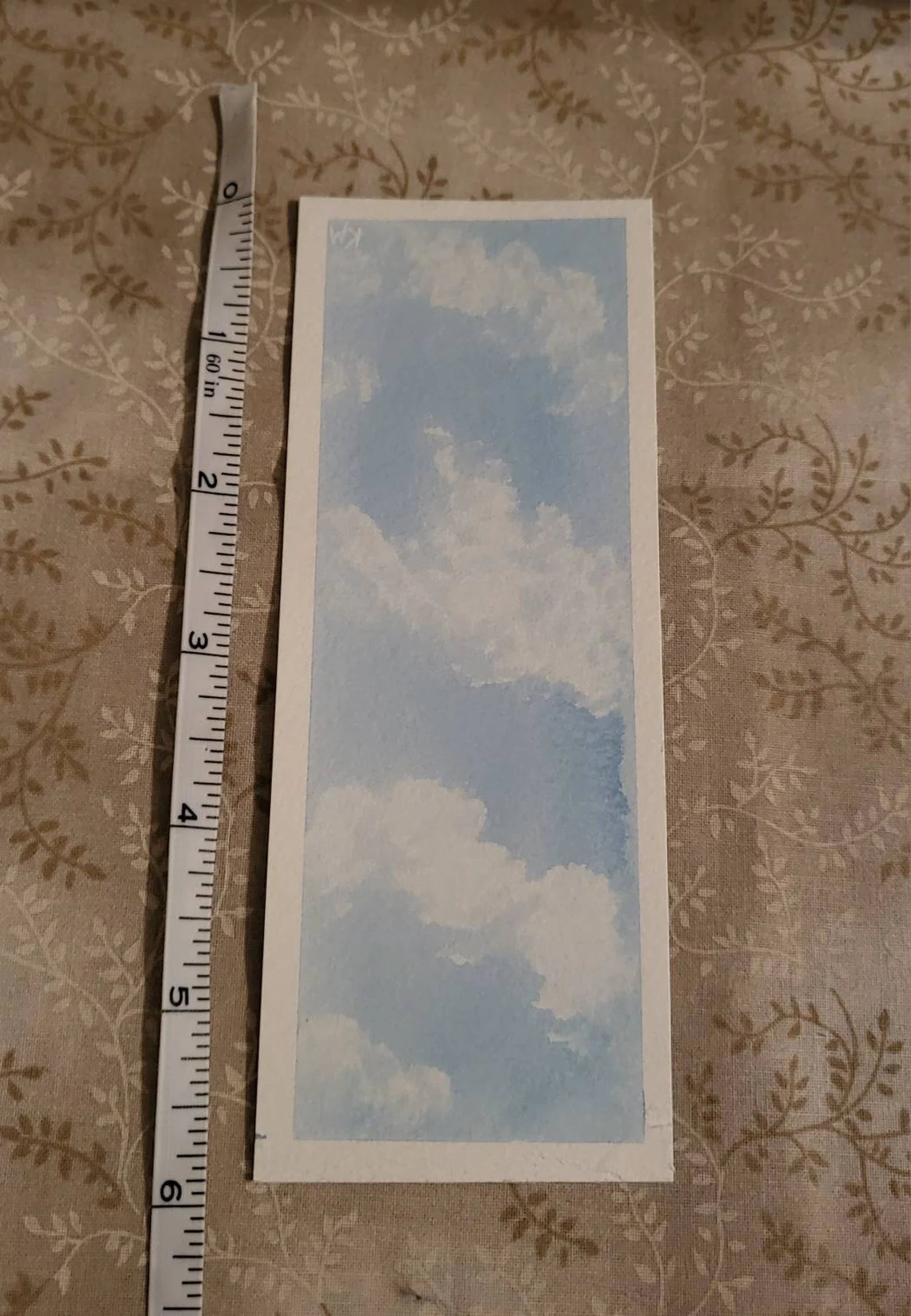 A 2x6 bookmark of blue clouds on 110lb cardstock, watercolor paint