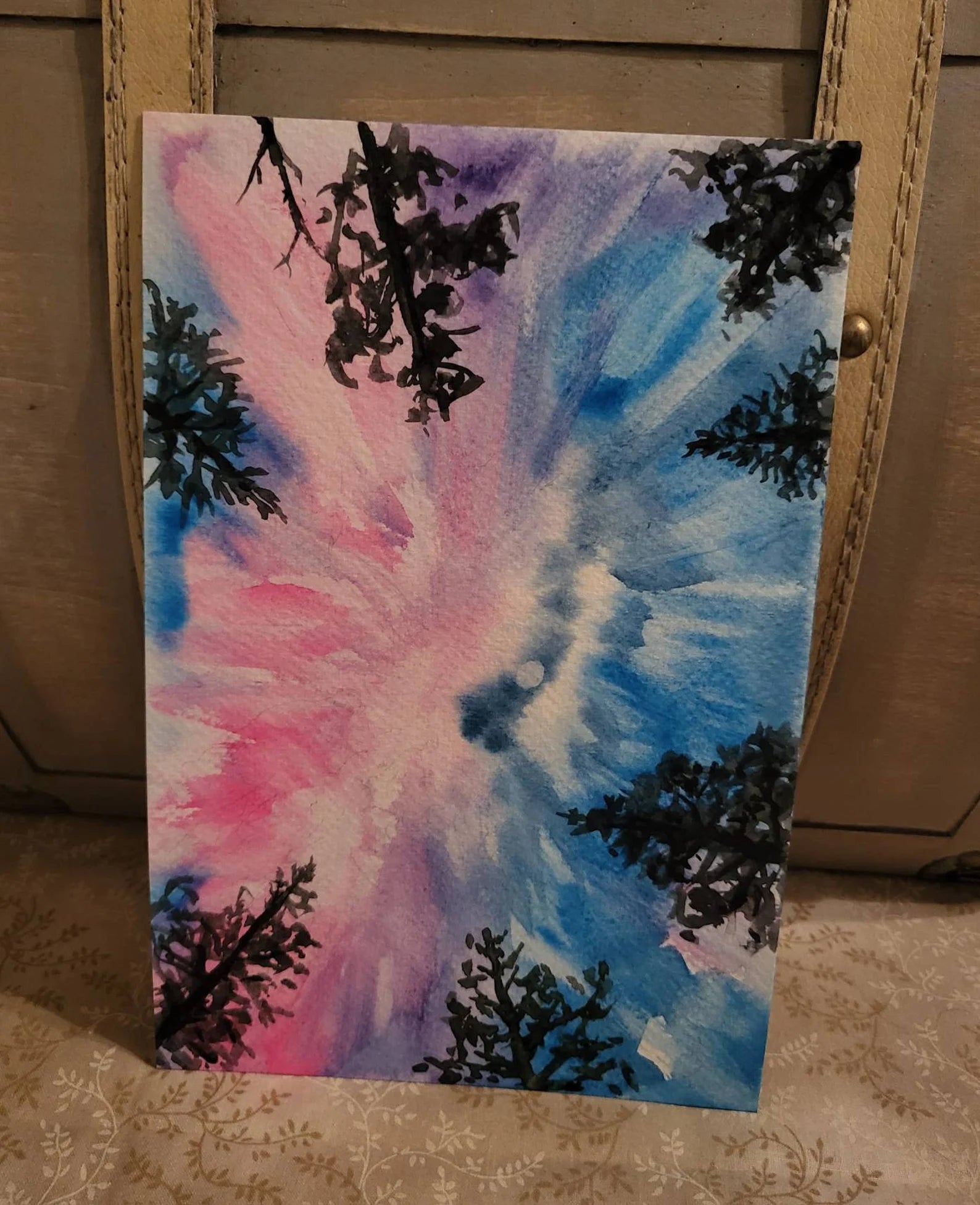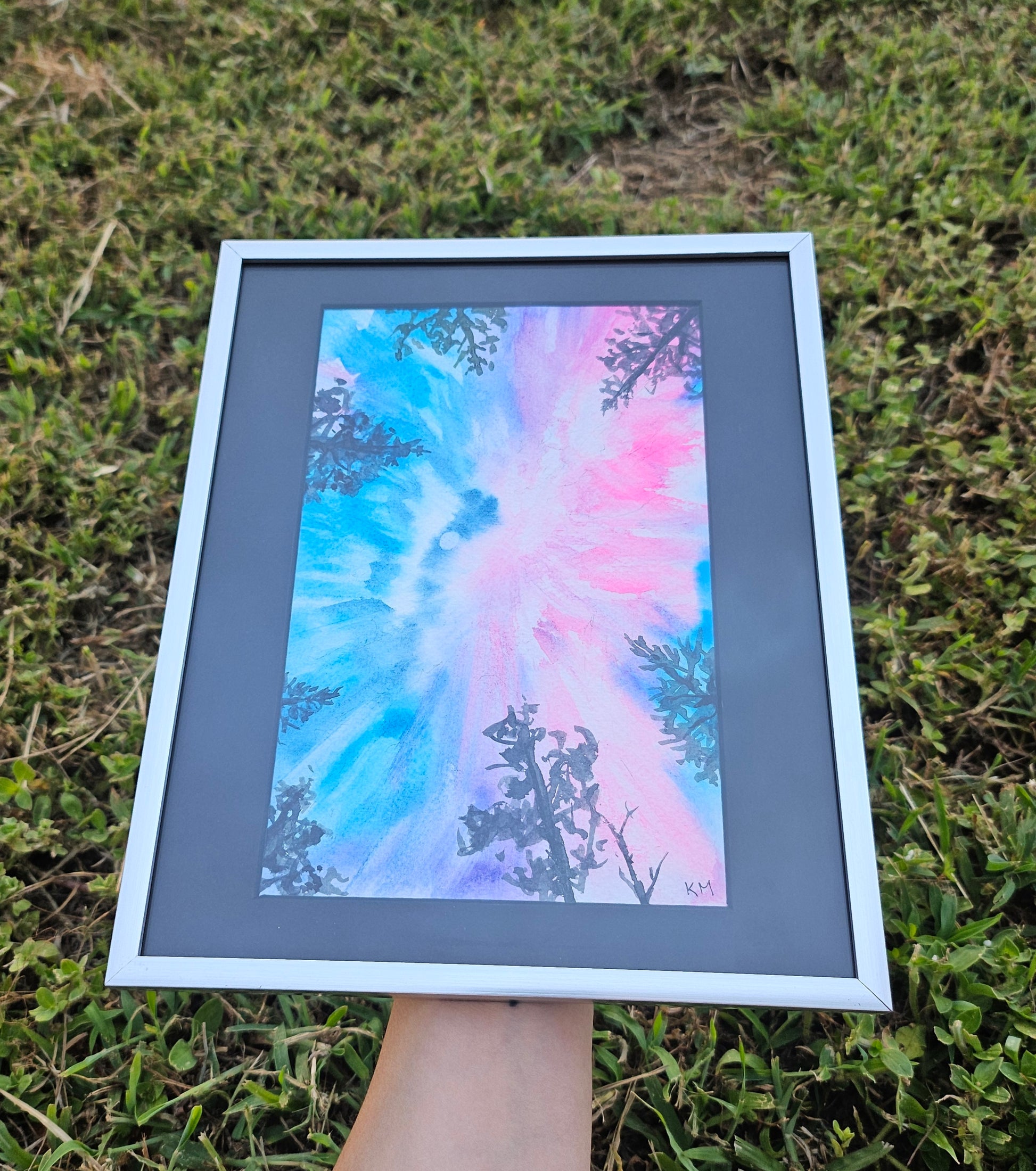 A 6x9 original watercolor painting of a neon blue/pink aurora borealis, worm's eye view framed in black to fit into an 8x10 frame. Frames is plastic with glass and can sit or hang.