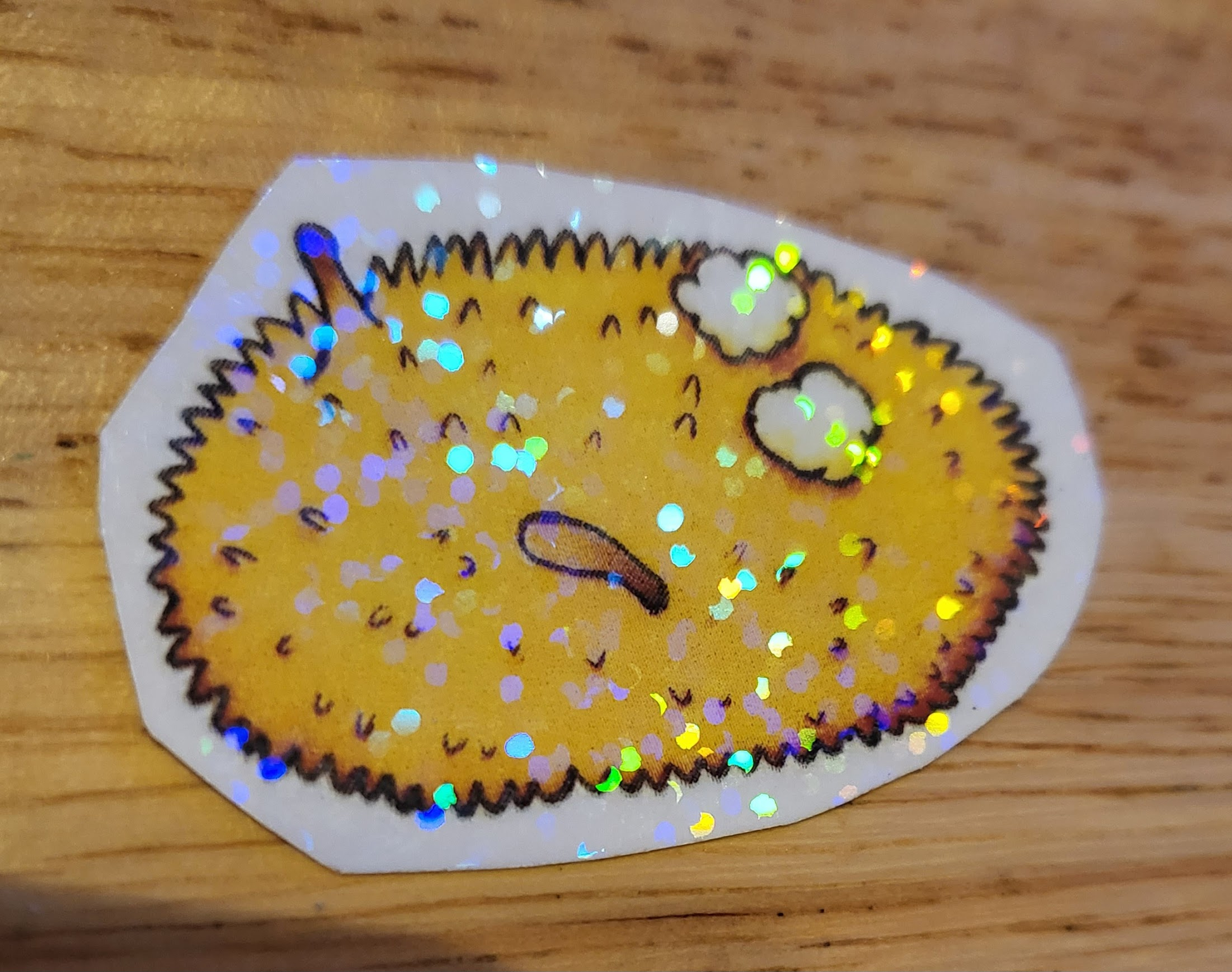 each sticker measures 2 inches long and is covered with a layer of holographic laminate