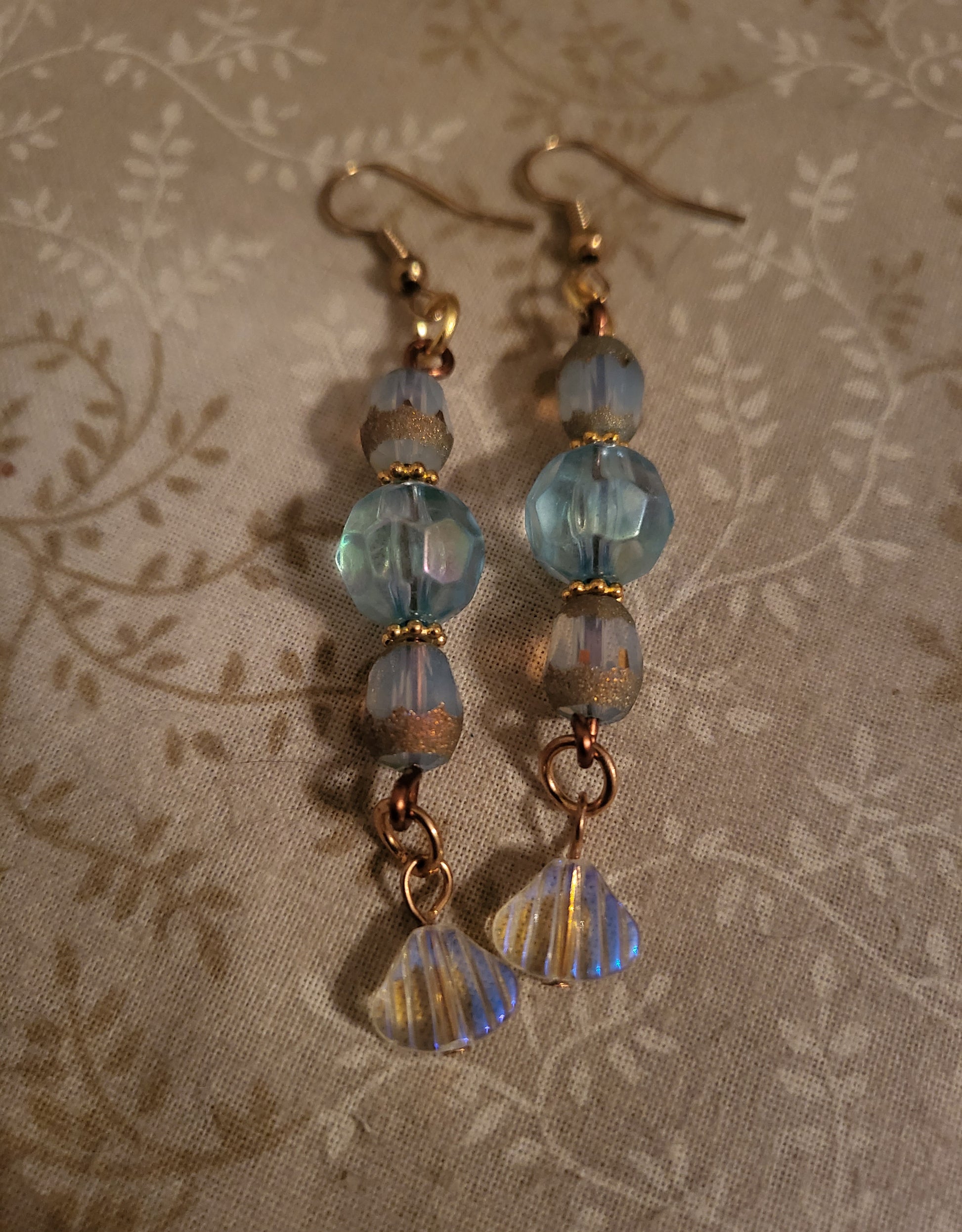 A pair of 3" inch dangly earrings on copper wire, beads are blue and gold with an iridescent shell charm. Earrings are fishook with clear backs.