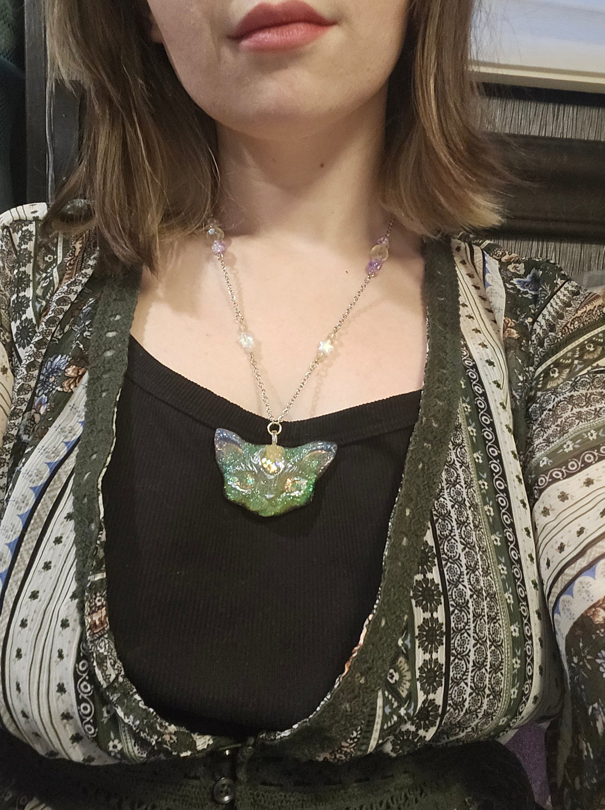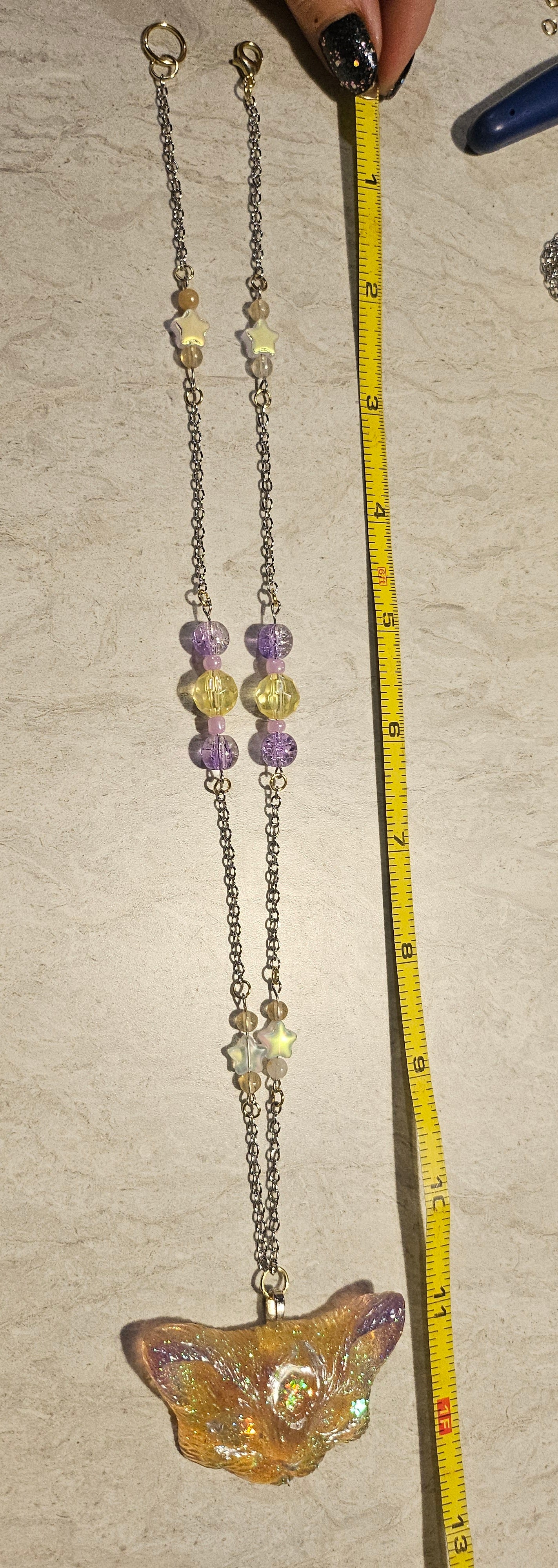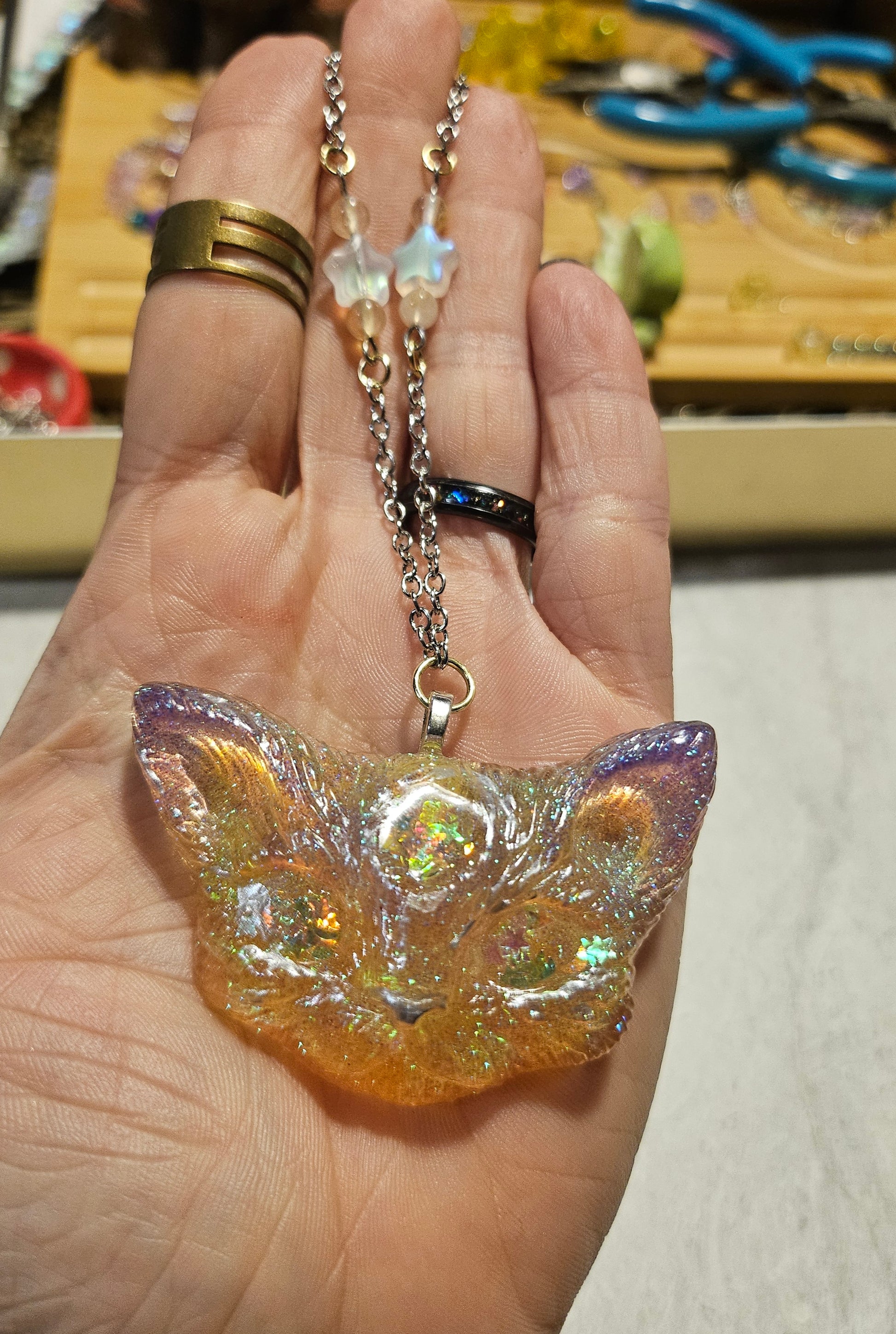 A 3 eyed Odd Kittty cast from epoxy resin with purple and yellow glitter spaced with glass beads.