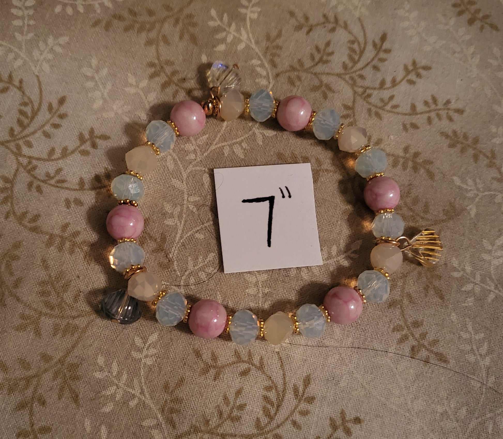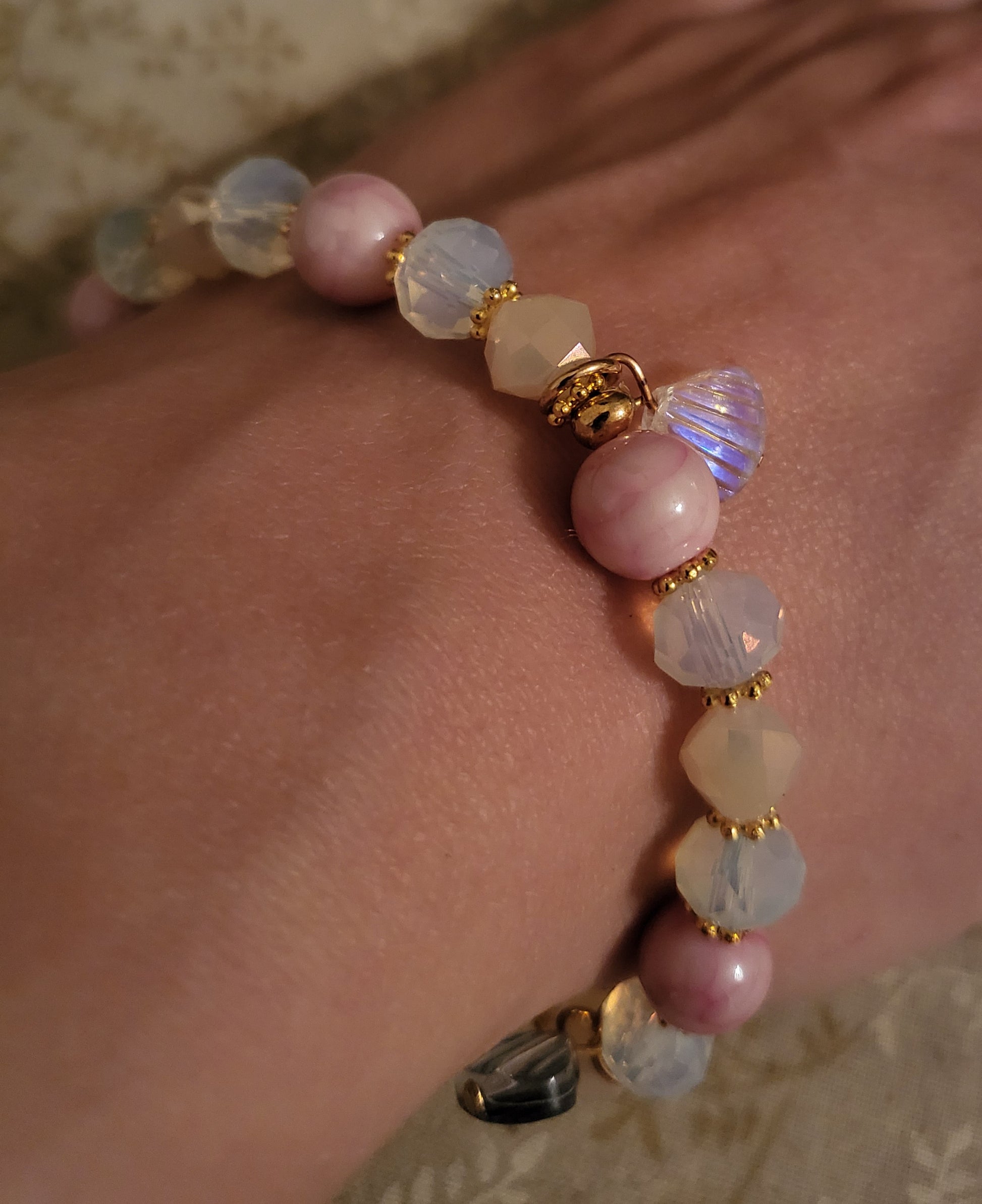 The Pastel Beachy stretchy charm bracelet features pink and white beads with gold spacers. Charms are tiny iridescent seashells. The bracelet fits a wrist diameter of 7 inches and the knot is secured with a crimp bead.