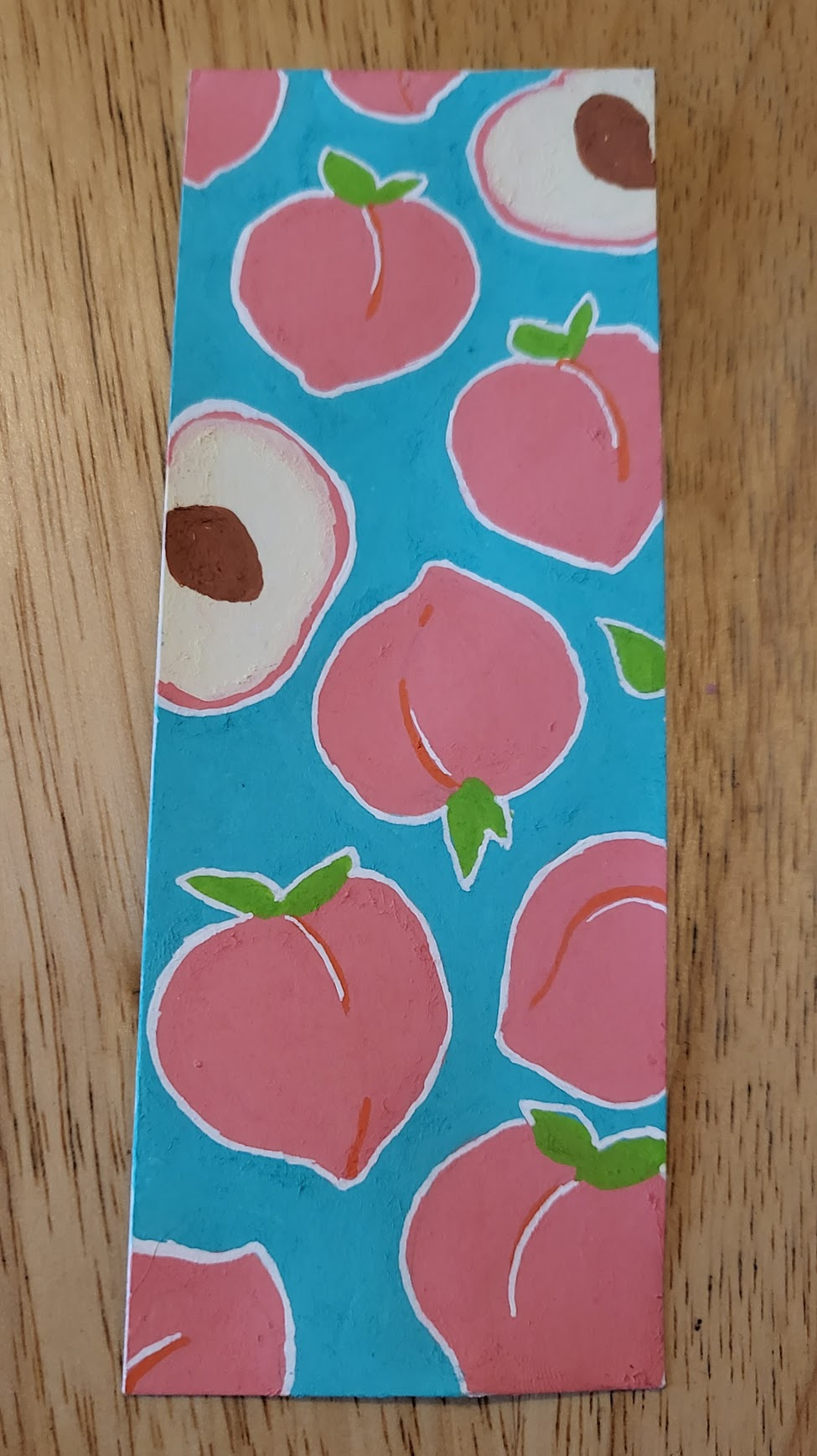 Here's a cute way to kick off your summer reading! A greenish blue bookmark decorated with cartoon peaches on one side and the word "Peachy" on the other.