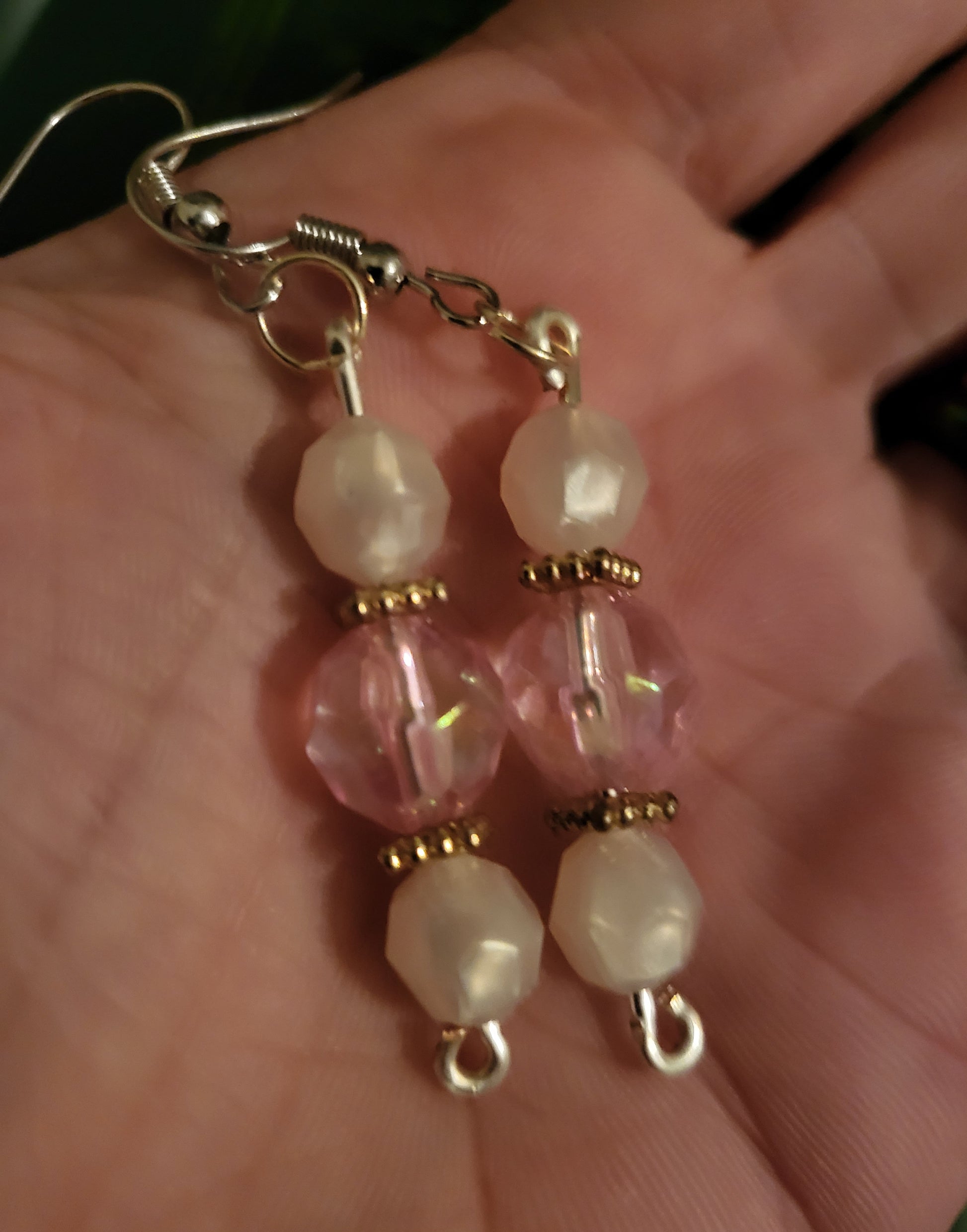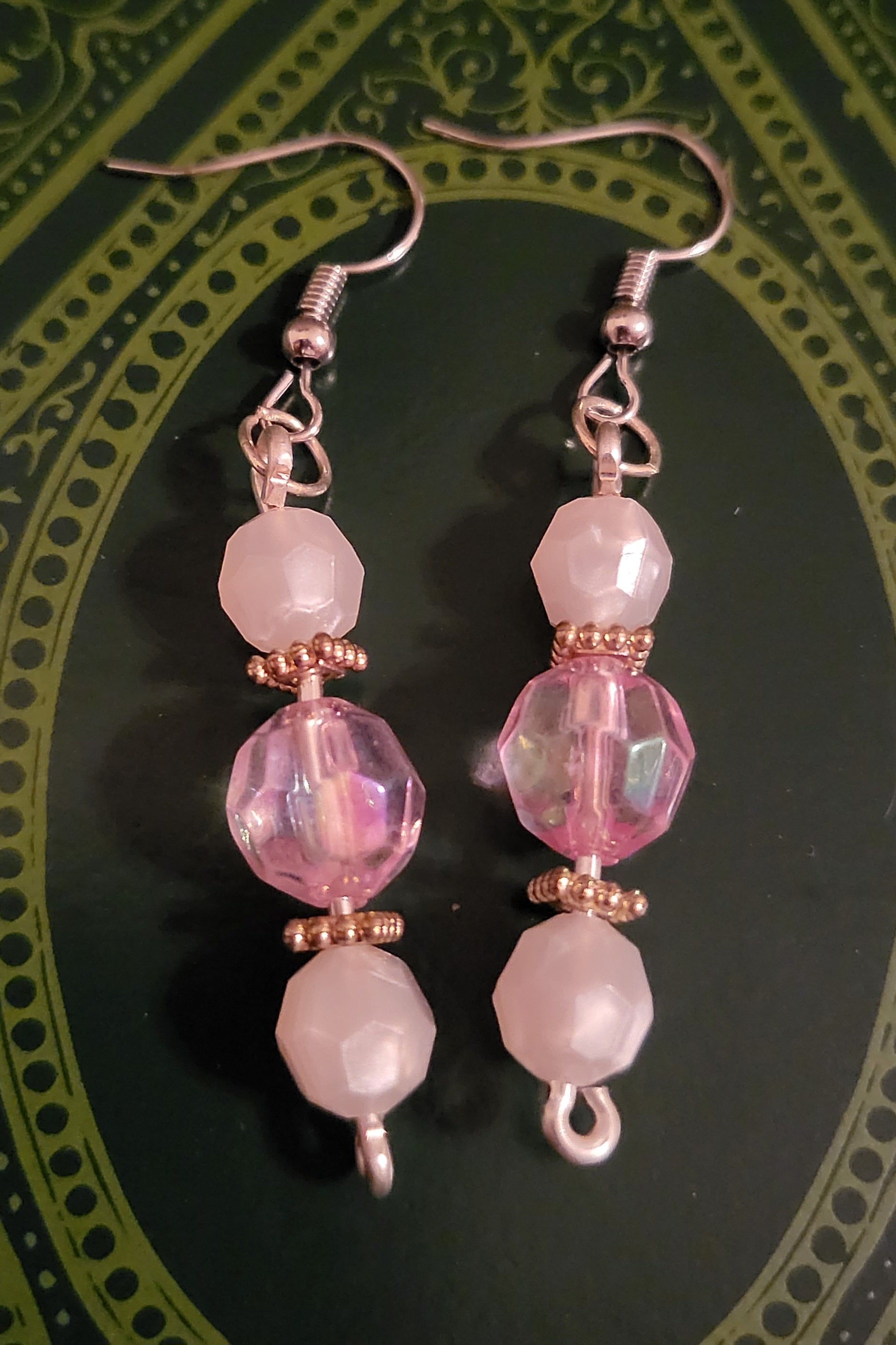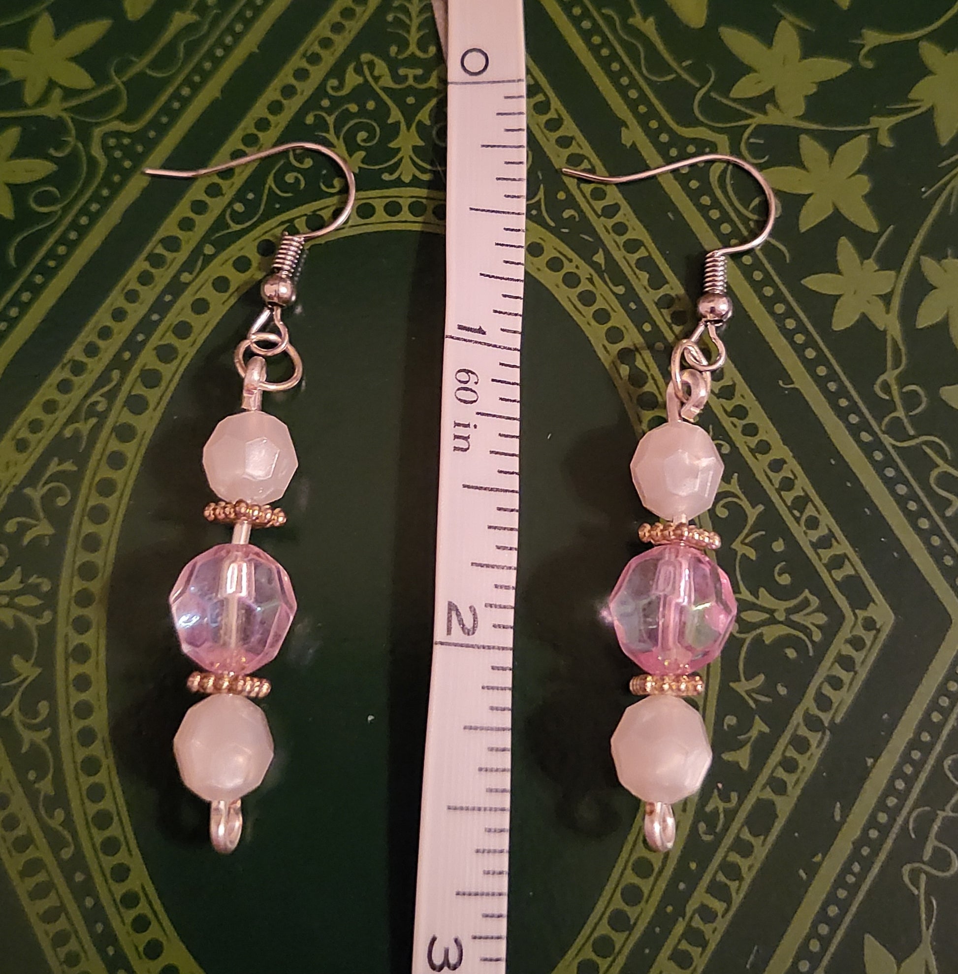 A pair of 2.5" earrings with light pink and white beads on fishook earrings.