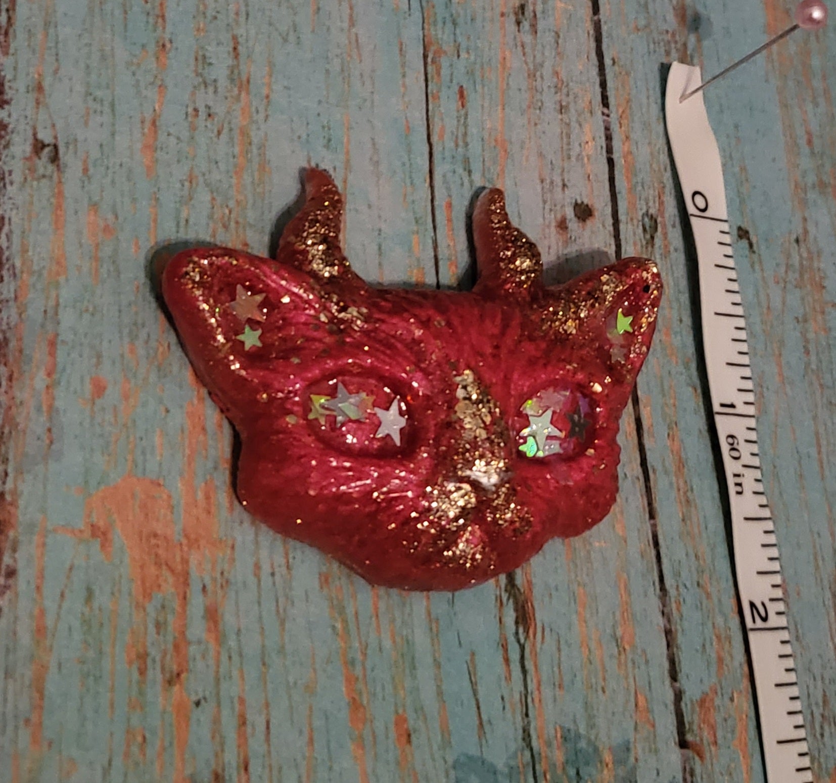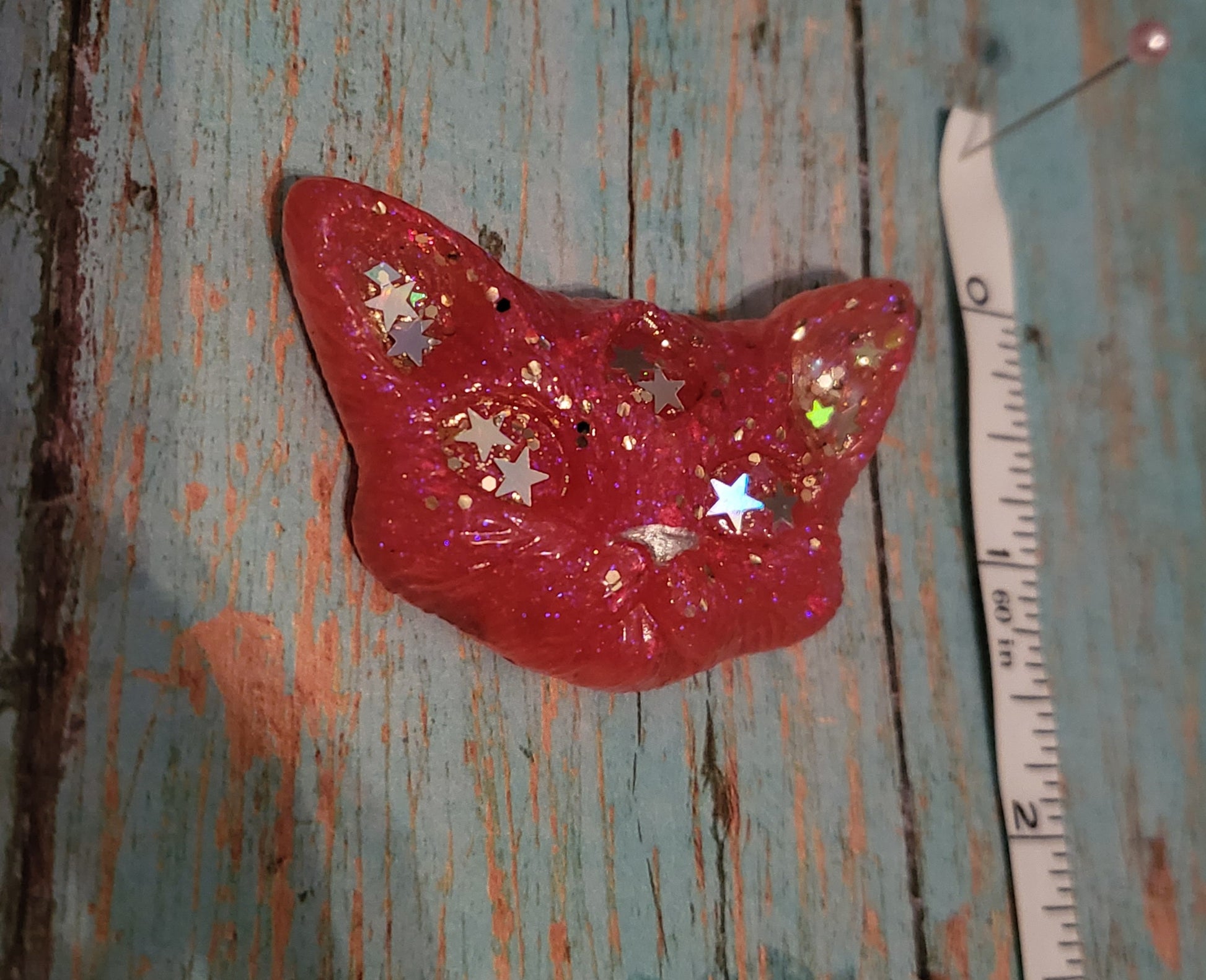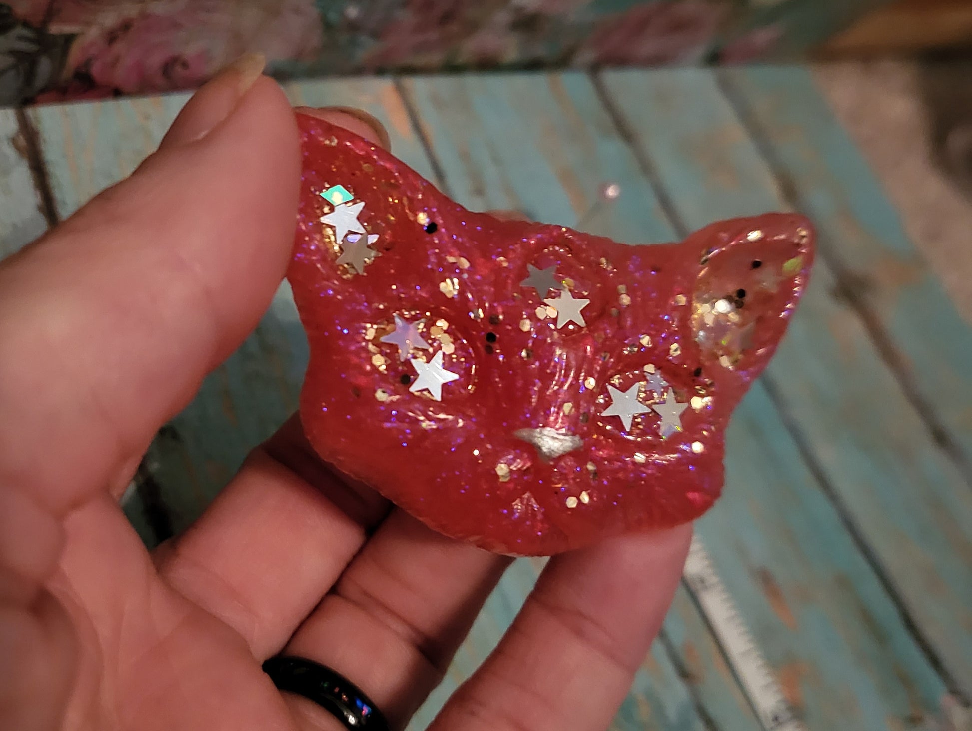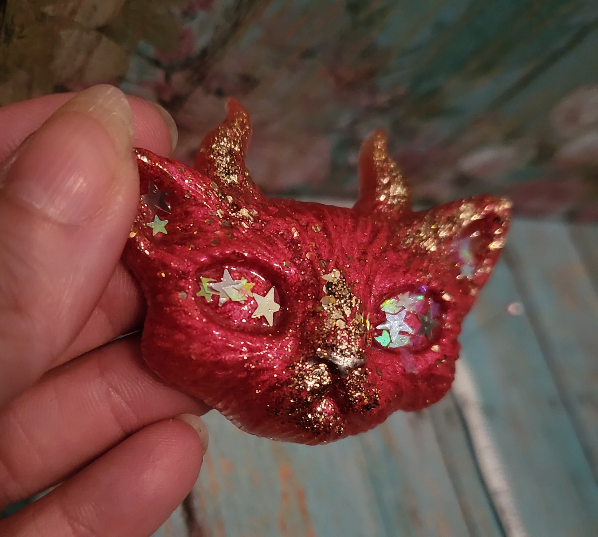 A set of Odd Kitty magnets, cast from epoxy resin and pink/gold glitter with holo stars in there eyes.