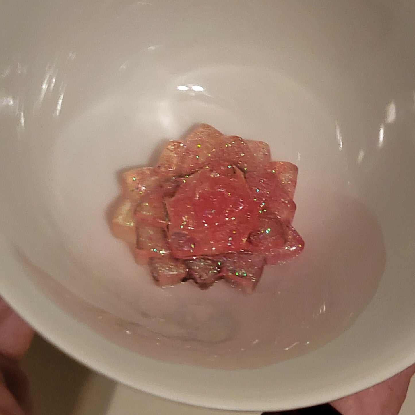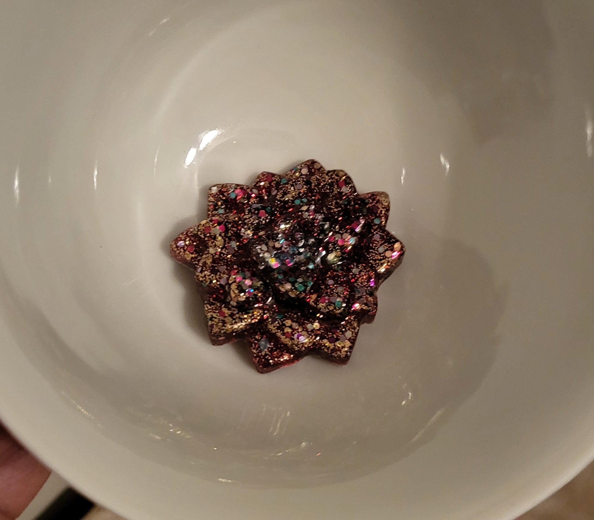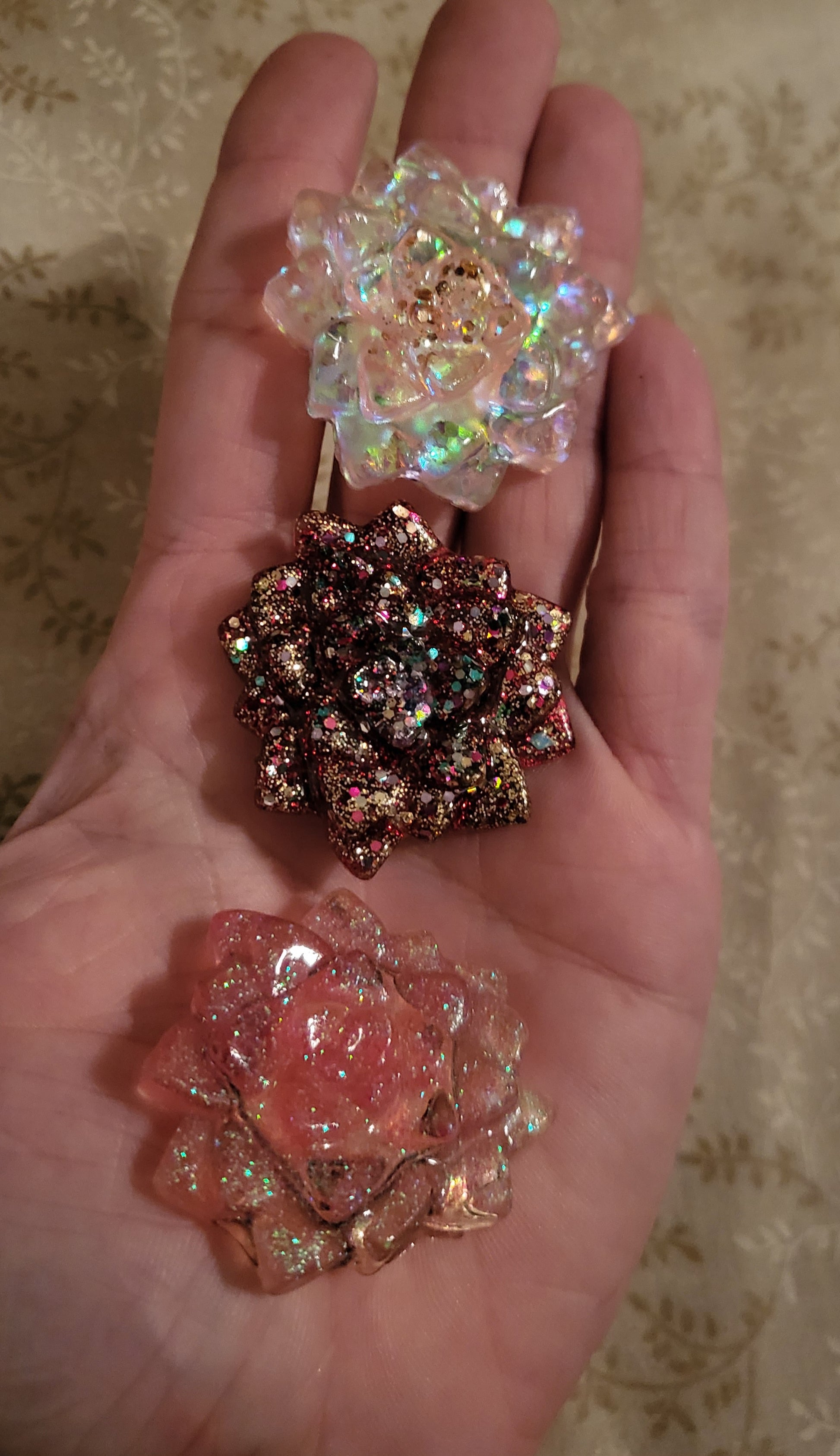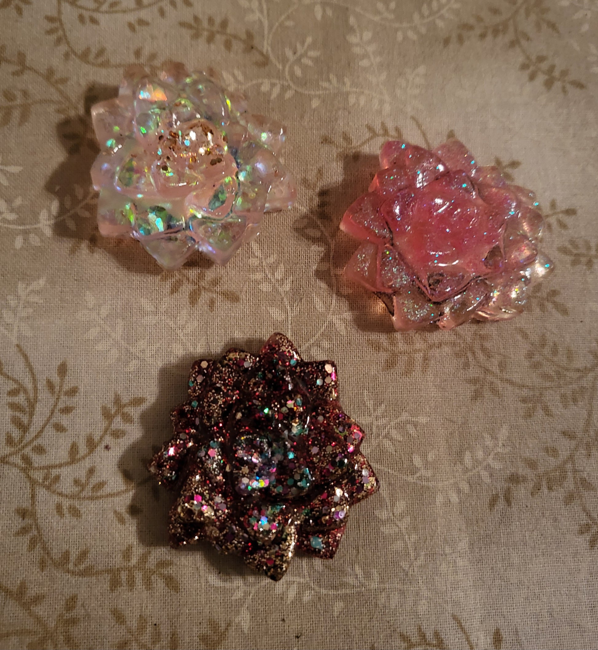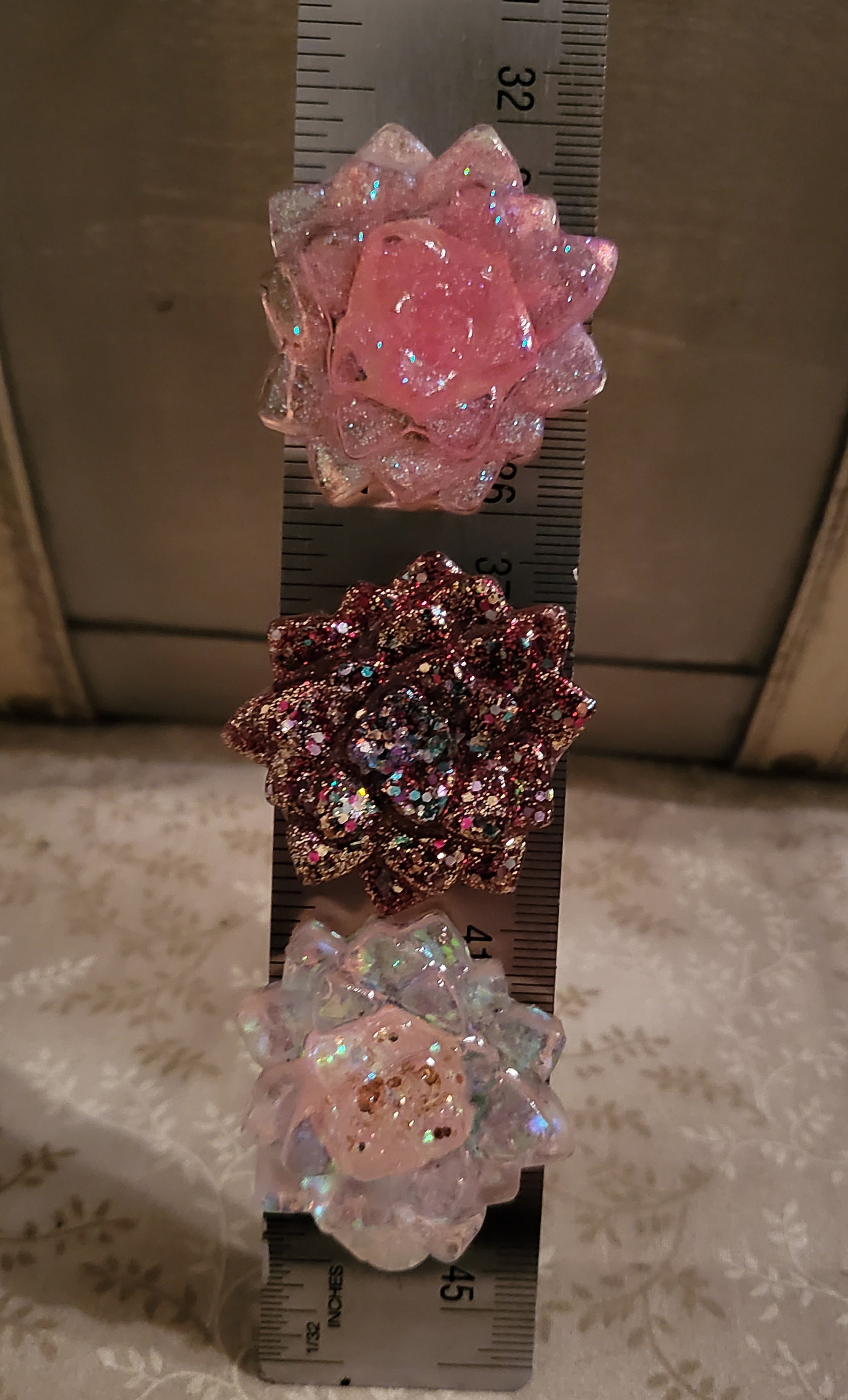 A set of 3 succulent magnets, cast from clear epoxy resin and red/pink glitter. Diameter of 1.5".