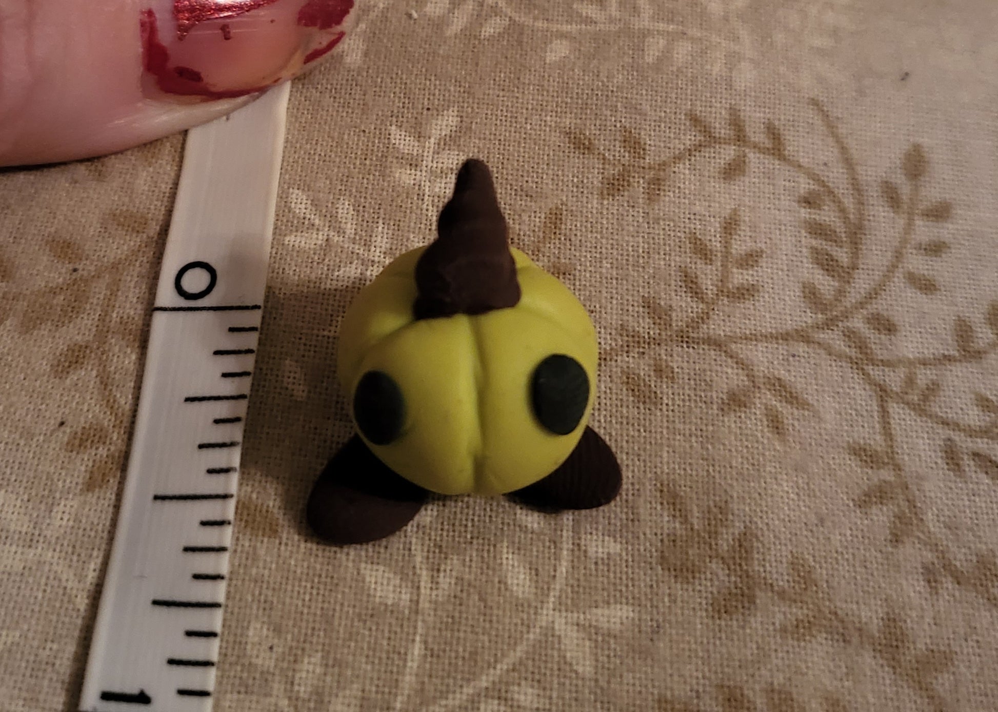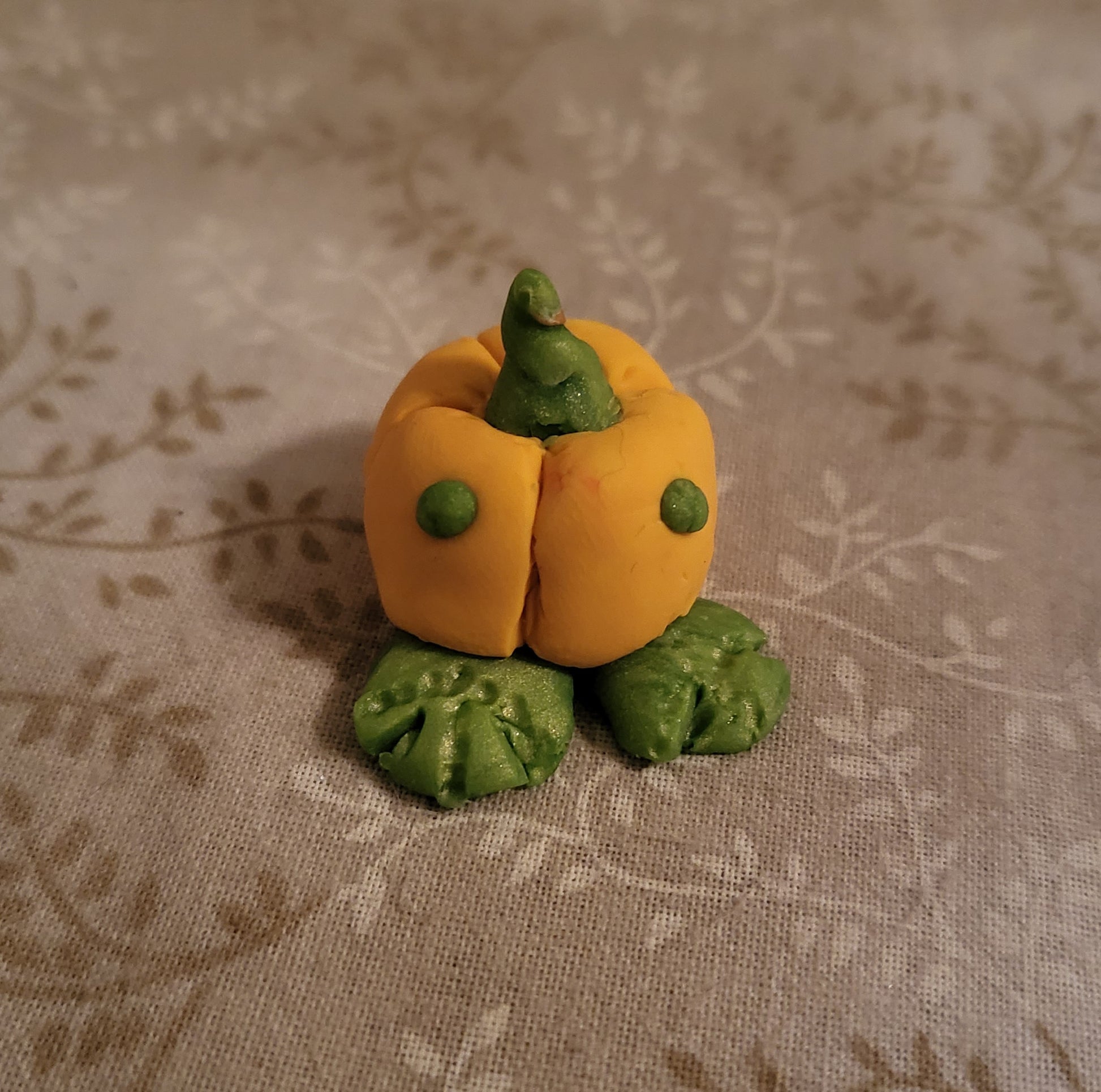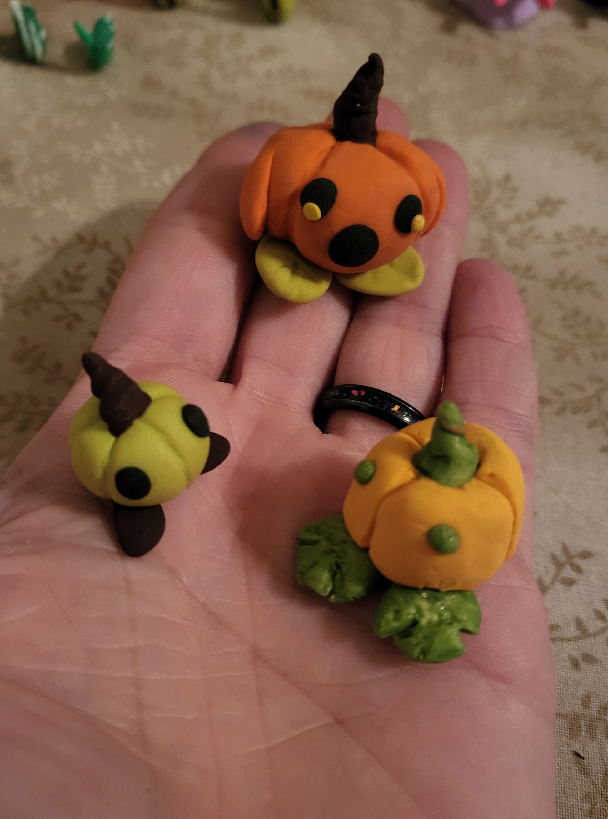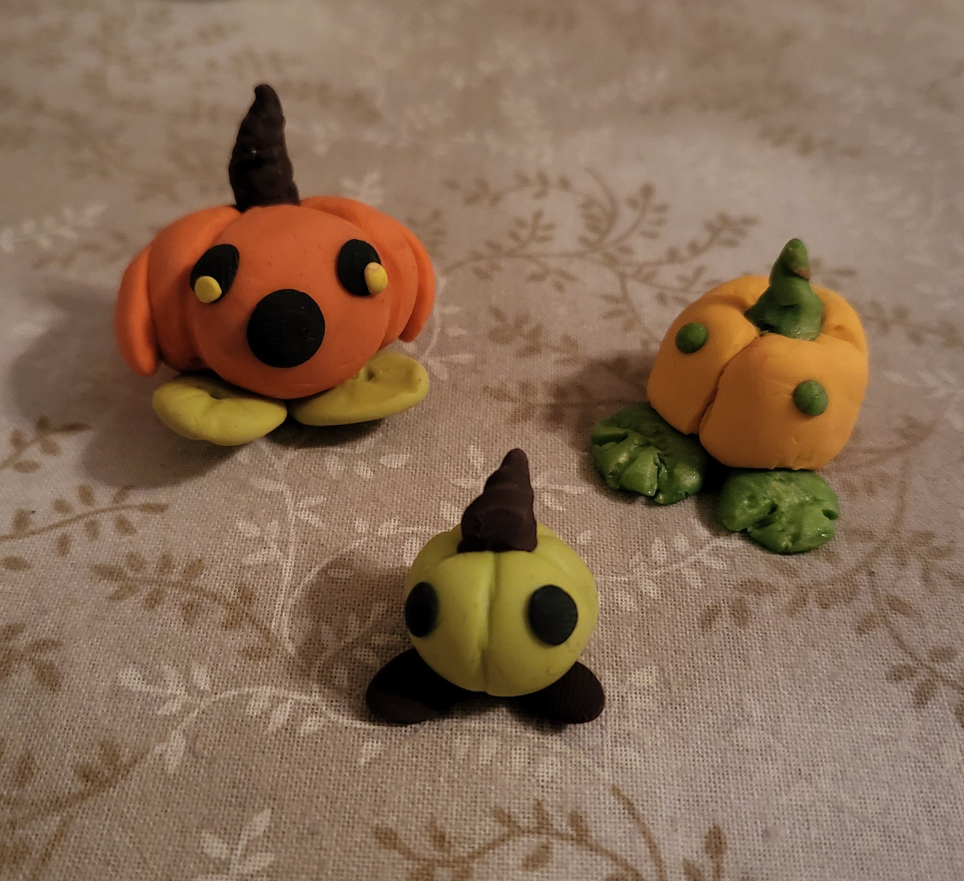 3 Pumpkin Pals made with ovenbake sculpey. The largest pal is orange with a shocked face, the medium pumkpin is a yellow-orange pumpkin with dot eyes and the smallest is a green pumpkin with dot eyes.