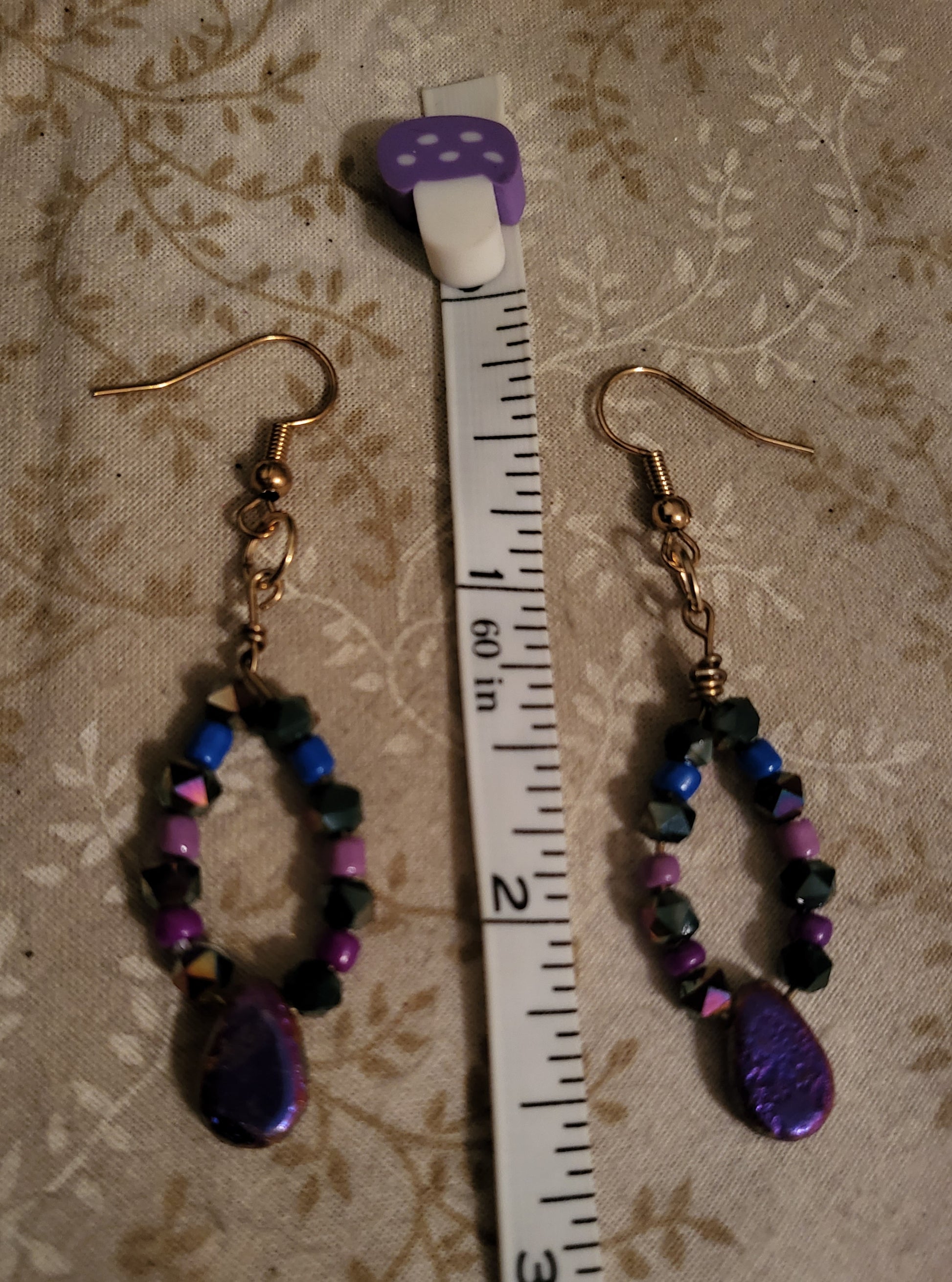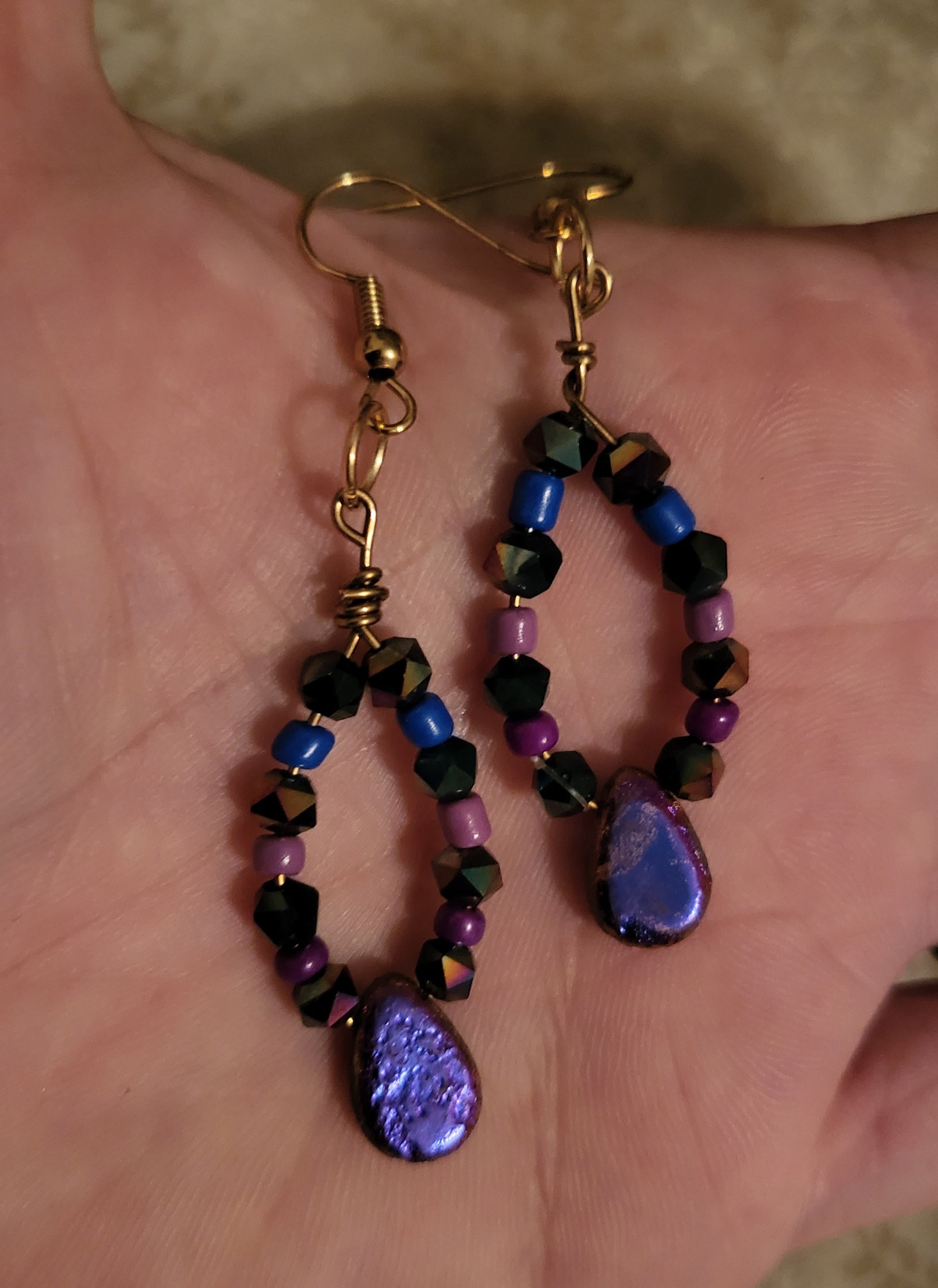 A pair of 2.5" earrings on copper wire featuring an iridescent purple teardrop bead with purple/blue beads as accents. On a fishook earring.