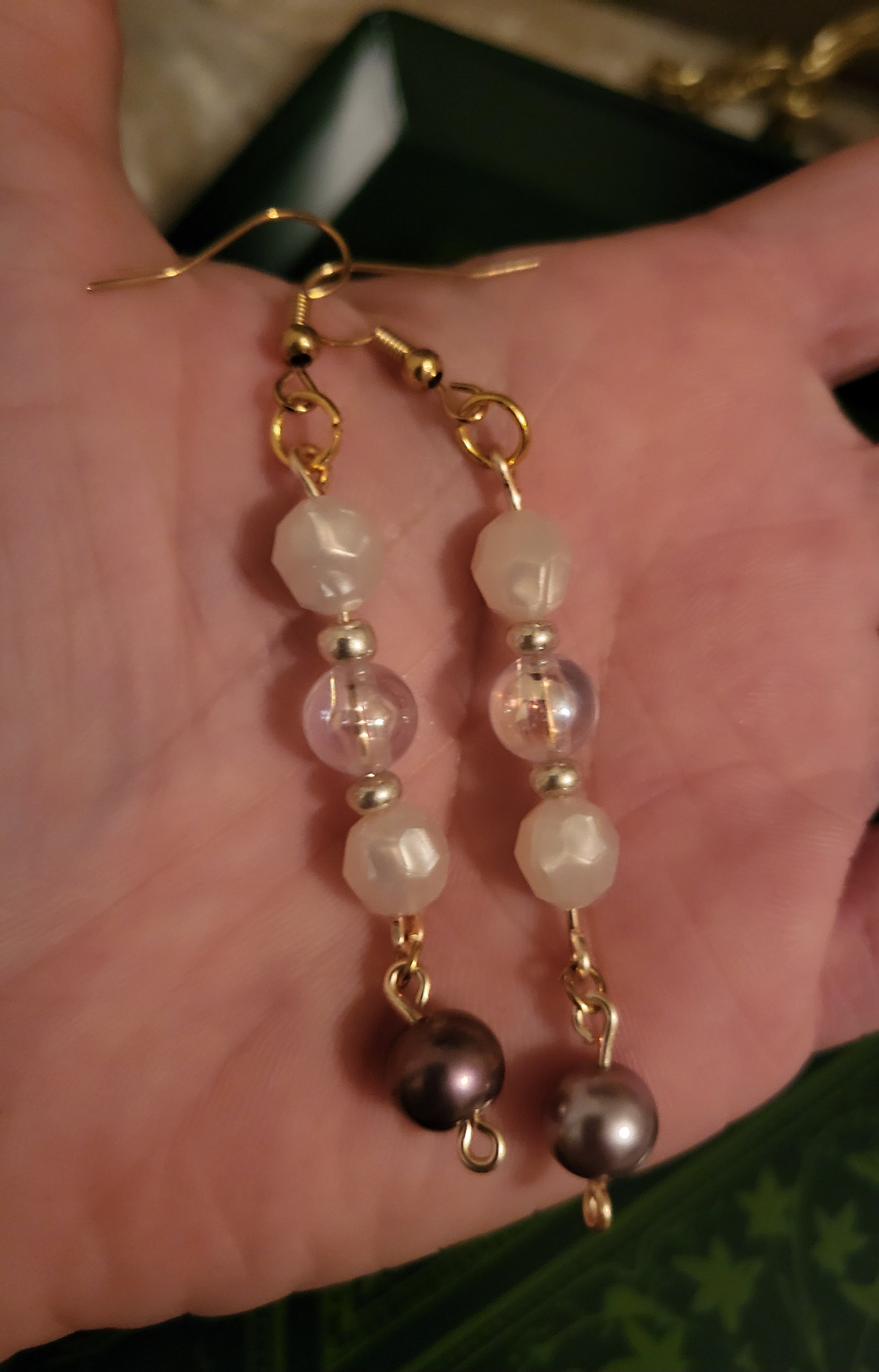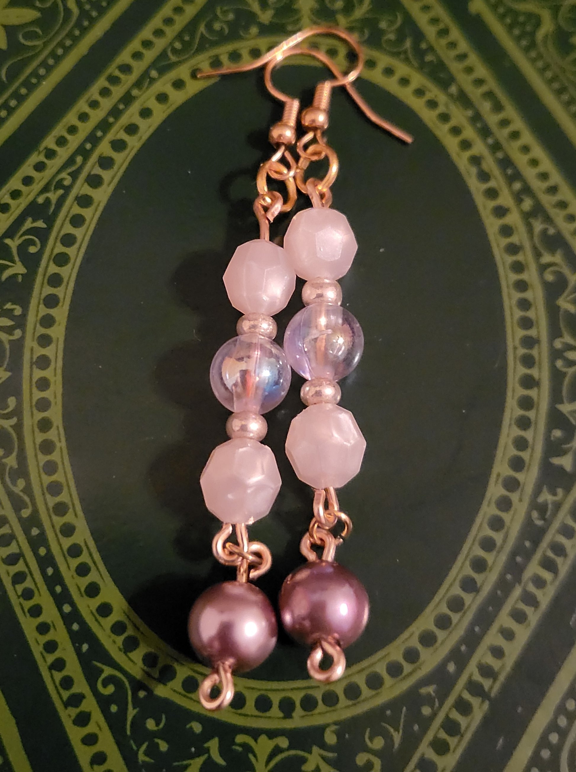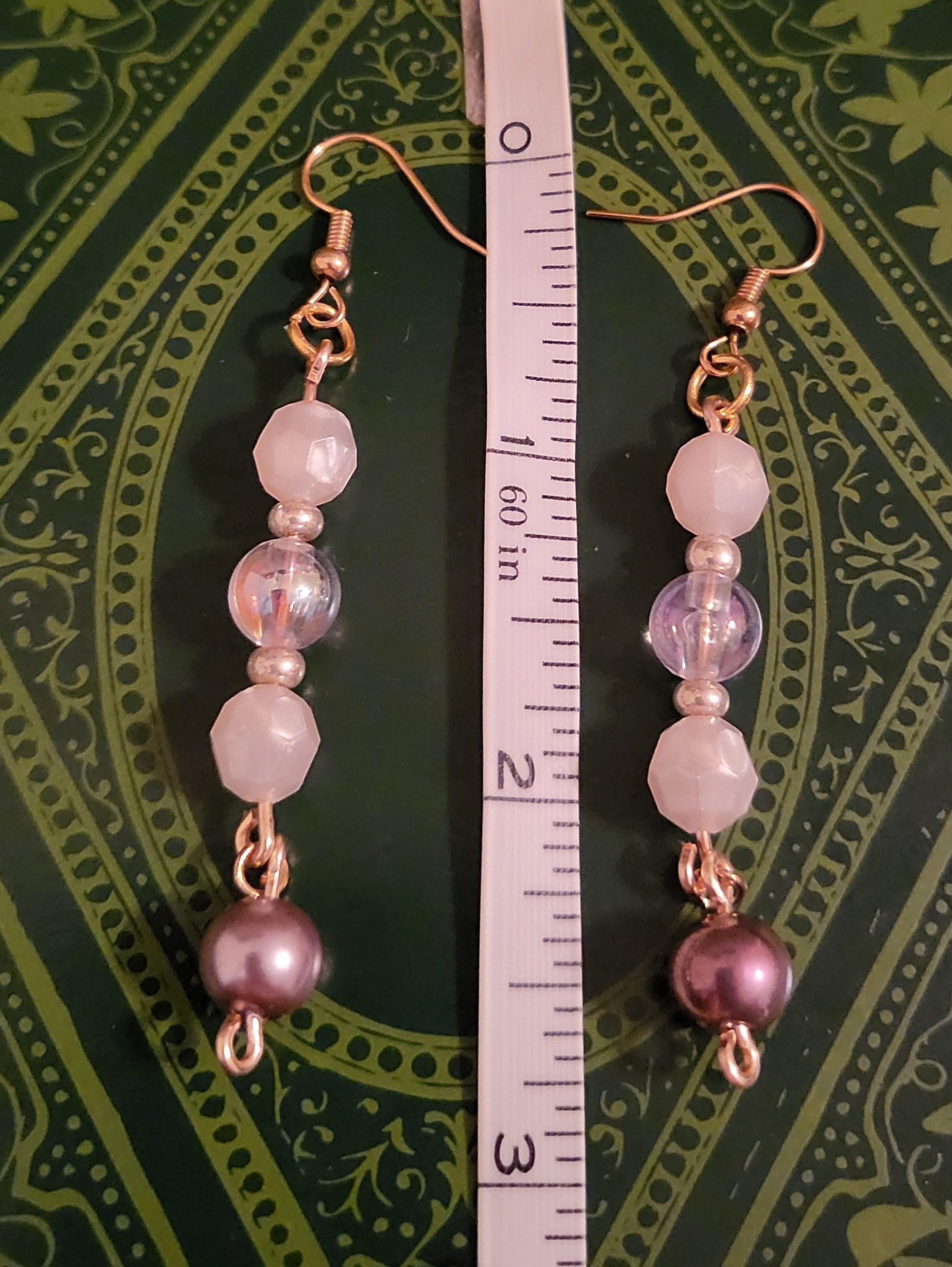 A pair of 3" faux purple pearls with iridescent clear beads on fishook earrings.