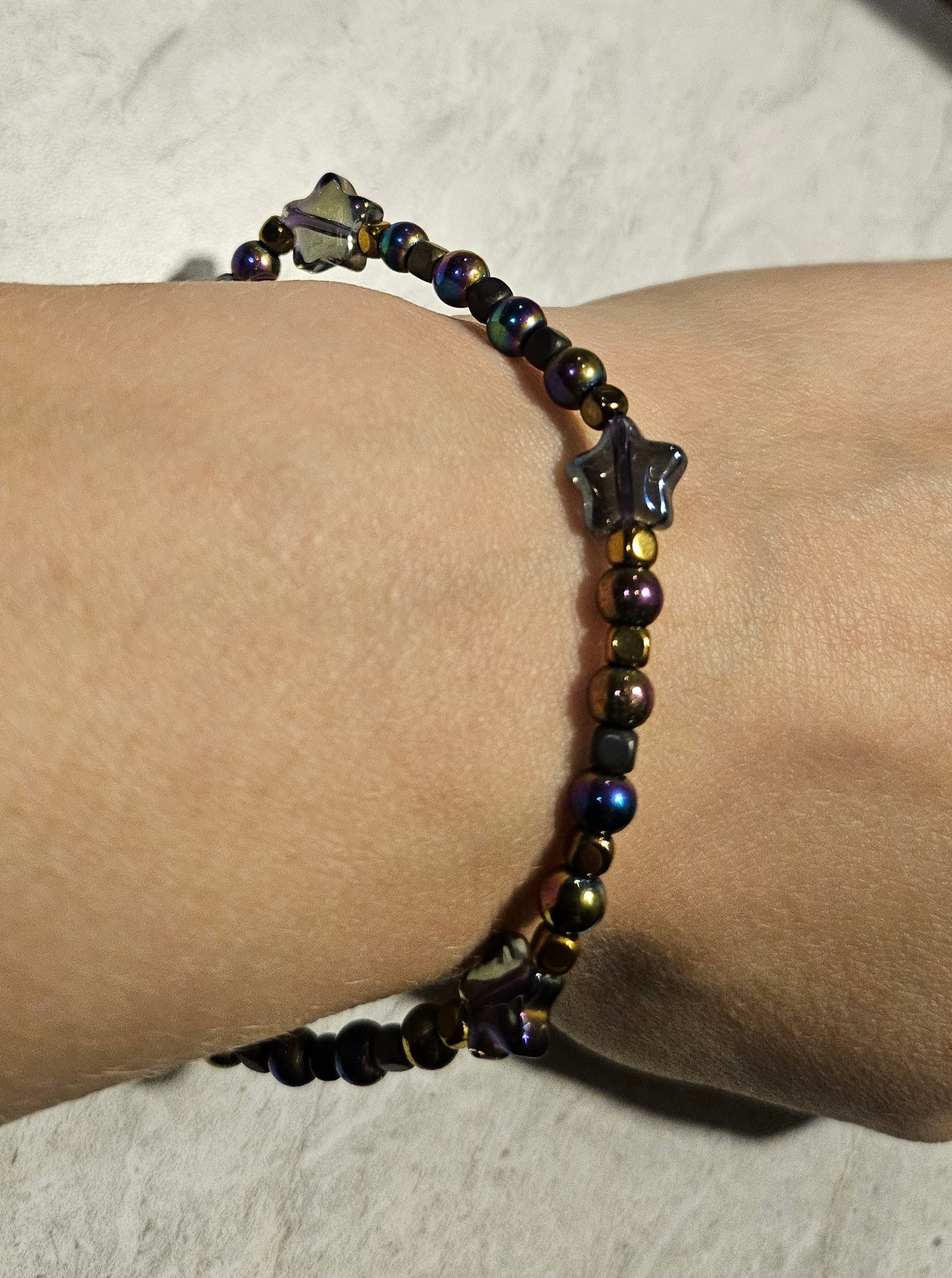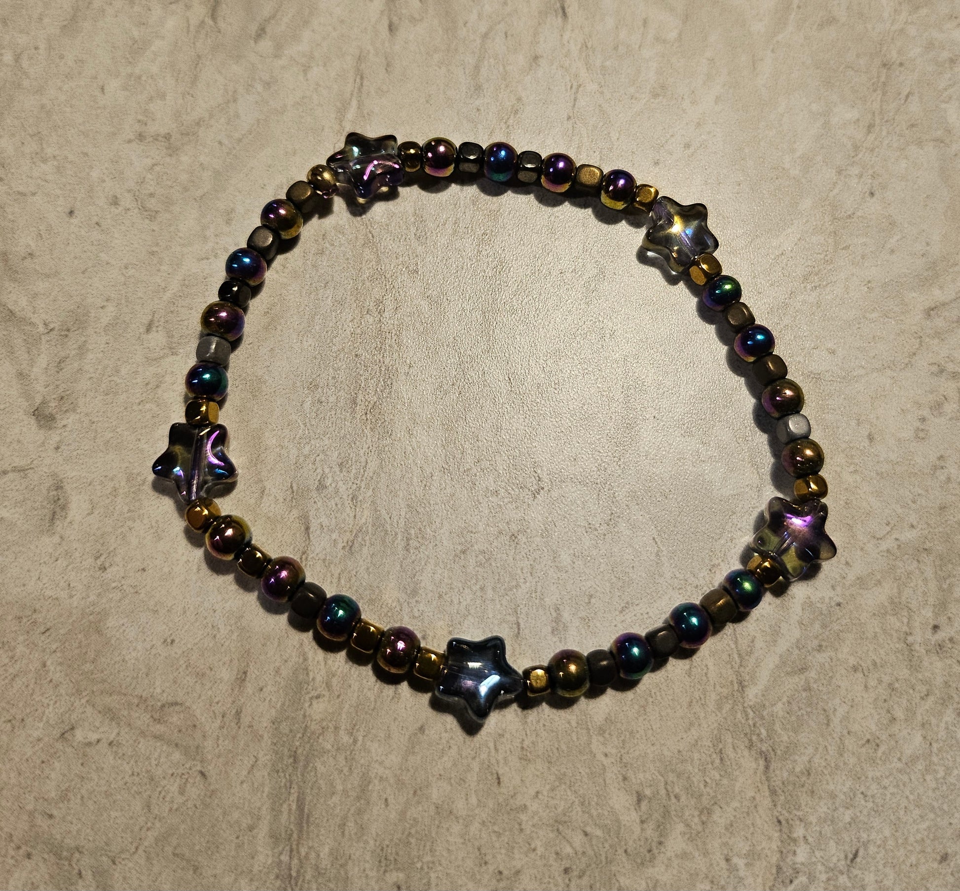 A 7" stretchy bracelet made with purple iridescent beads and glass iridescent purple stars. Double-knotted and secured with a crimp bead.