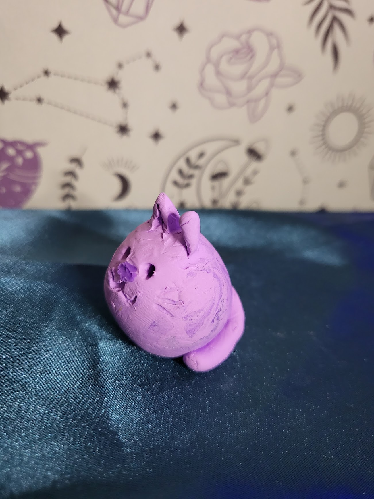A chomby little cat made from marbled purple Sculpey, made by Kelsey.
