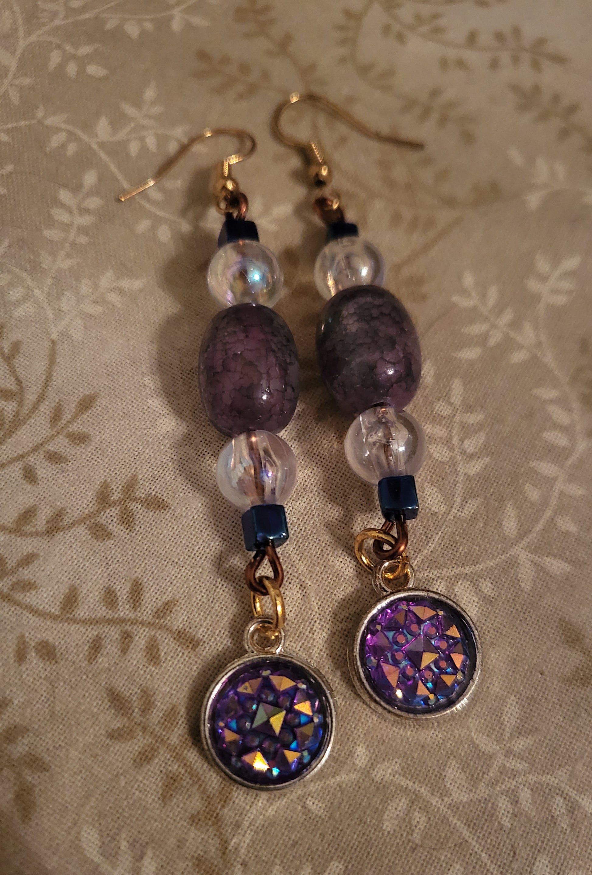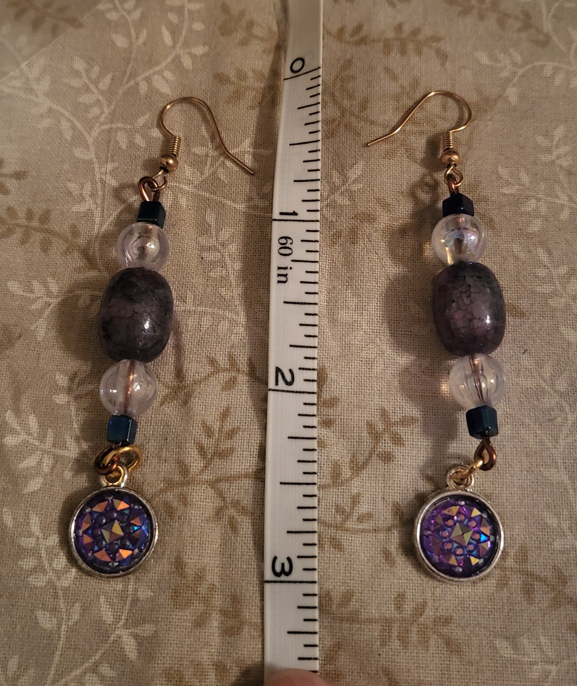 A pair of 3." inch dangly earrings on coppr wire, beads are purple and iridescent with a purple charm. Earrings are fishook with clear backs.