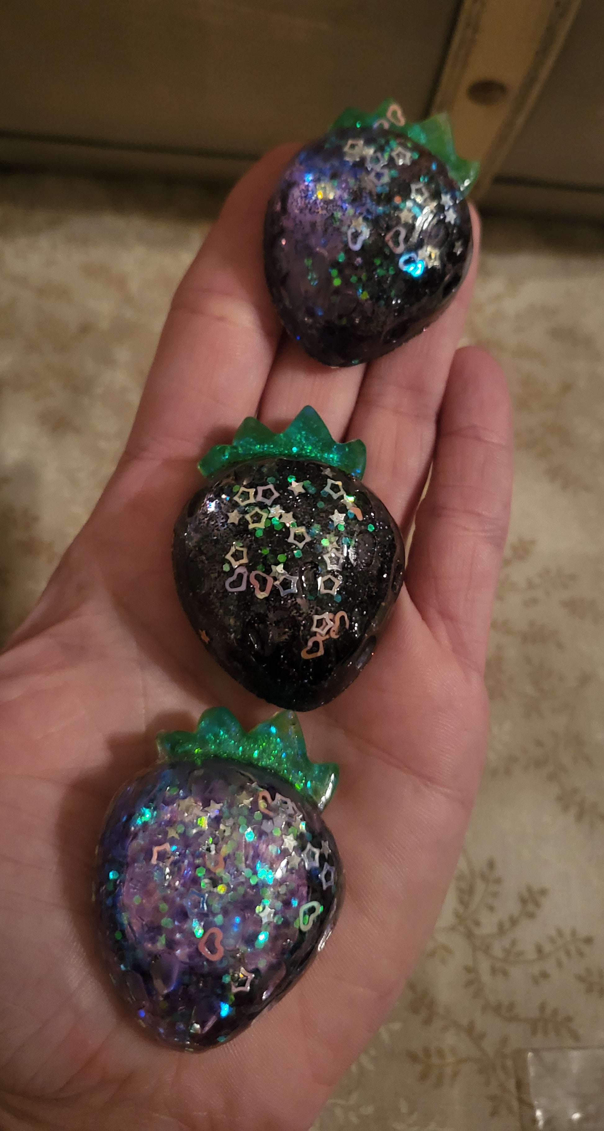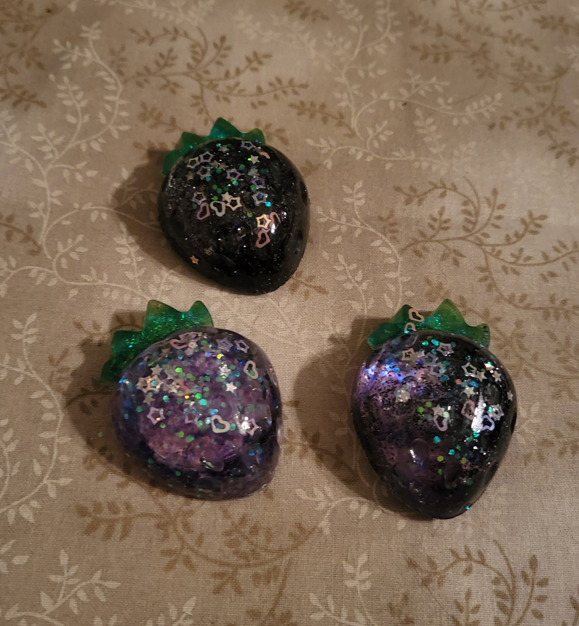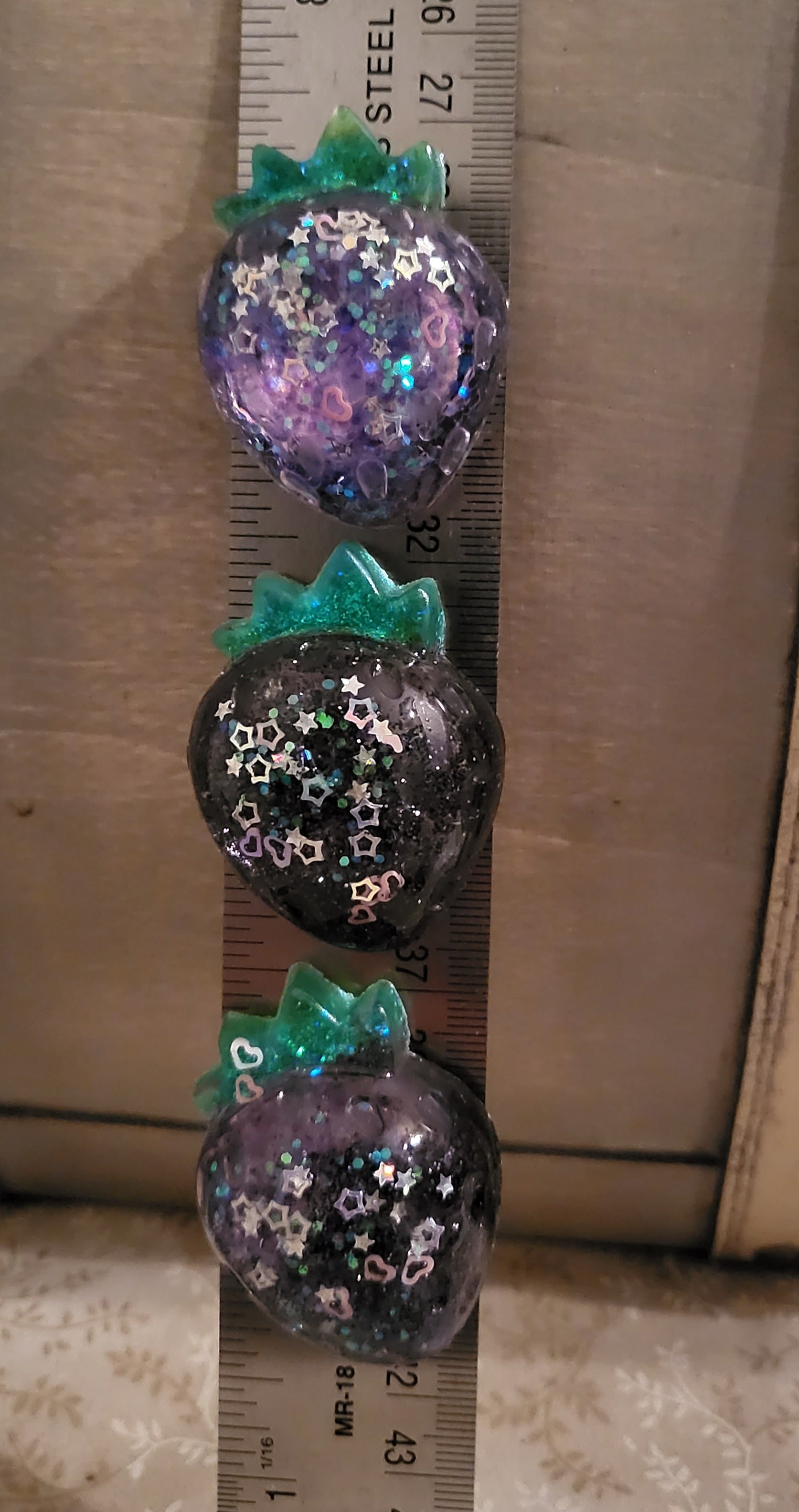 A set of 3 strawberry shaped magnets cast from epoxy resin with purple and black glitter and green glitter for the top. Each berry has a unique glitter pattern and measures 1.5 inches.