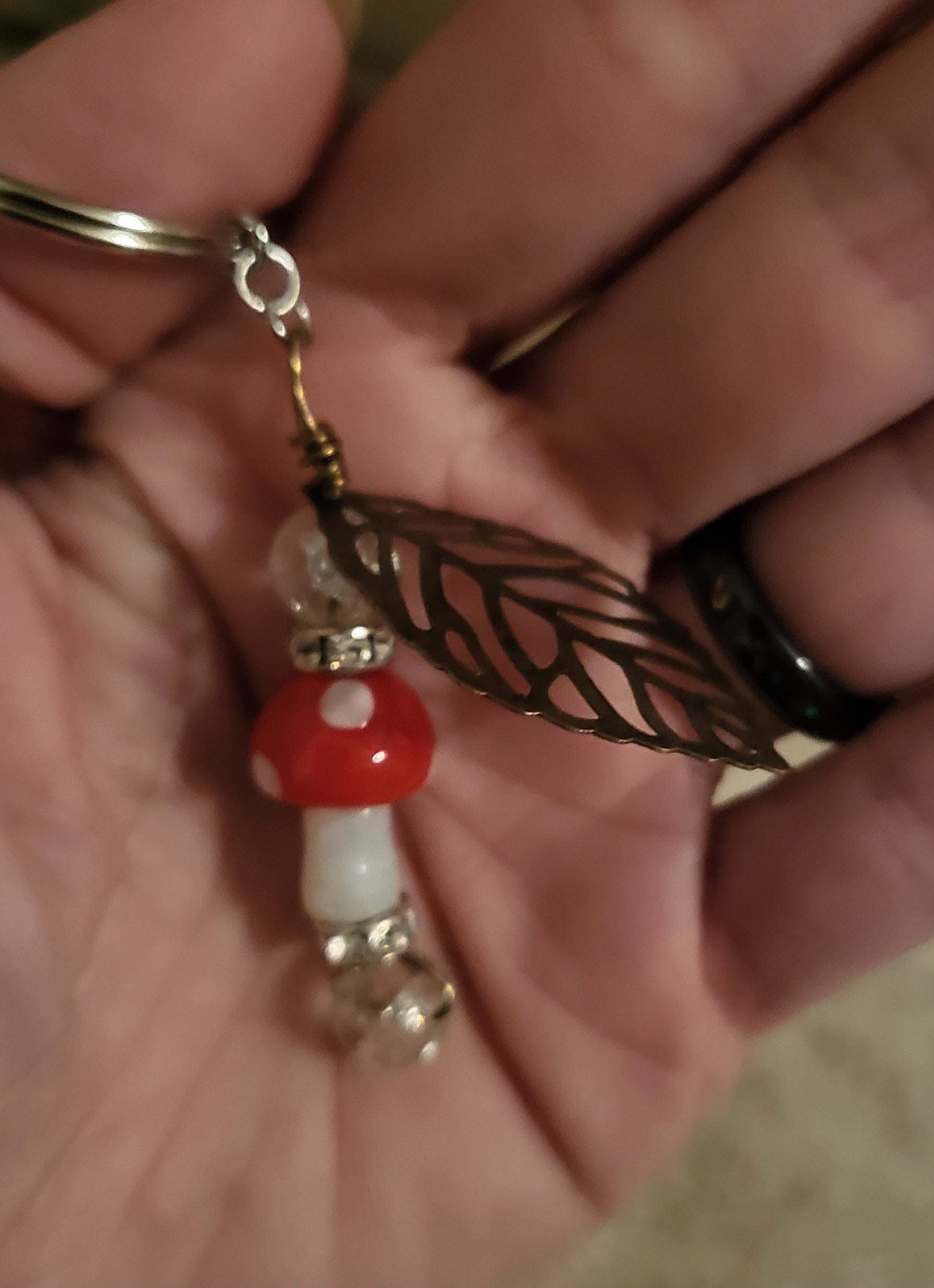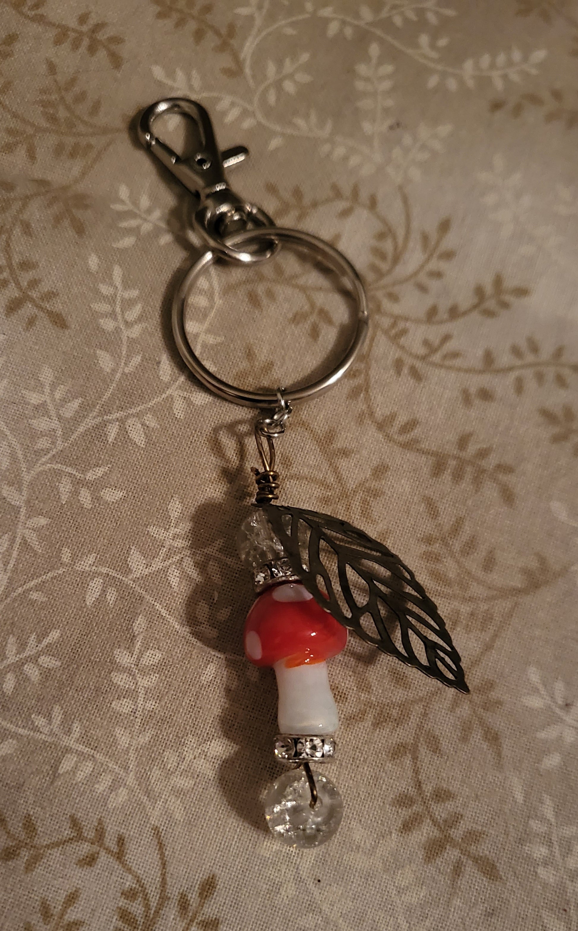 A glass red Mushroom beads wire wrapped with clear crystal beads under a bronze leaf. Keychain is lobster clasp and measures about 4 inches altogether.