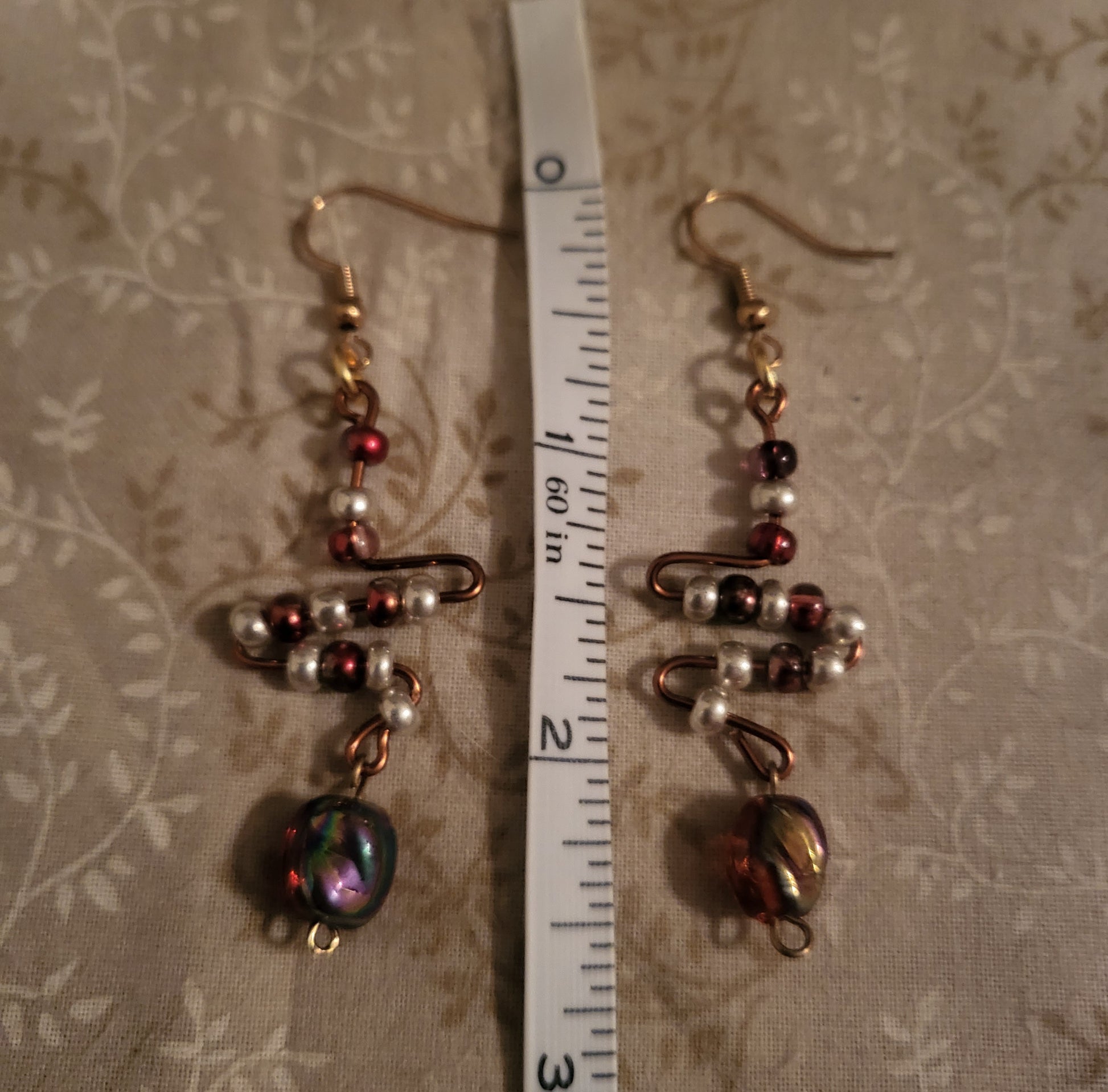 A pair of 2.5" dangly fishook earrings wrapped in copper wire with red, white and iridescent beads in a squiggle pattern. On fishook earrings with clear backs.