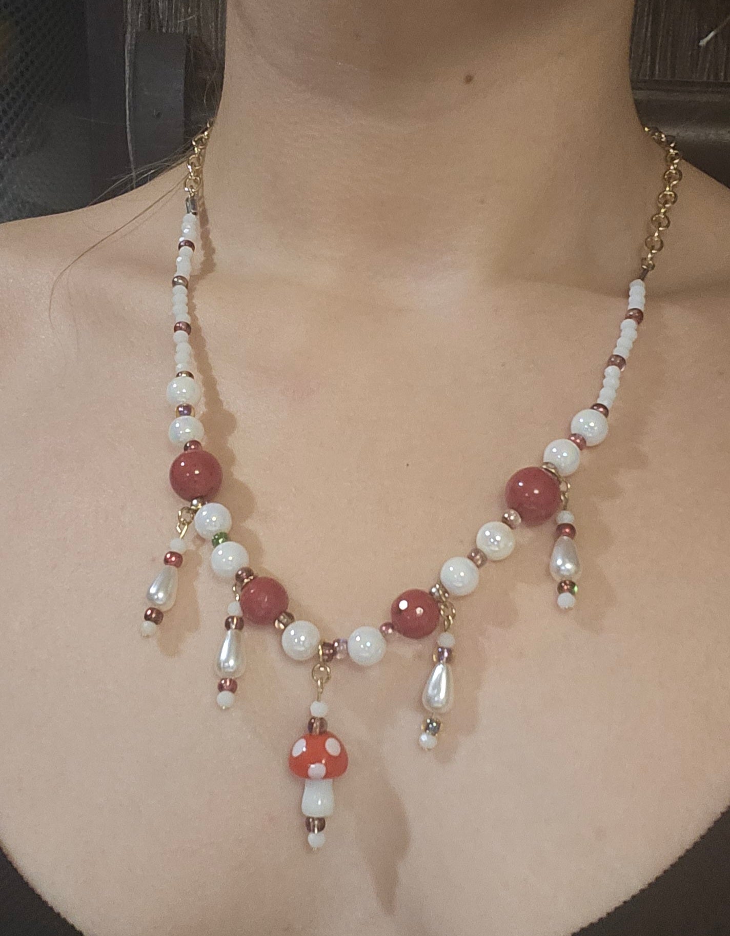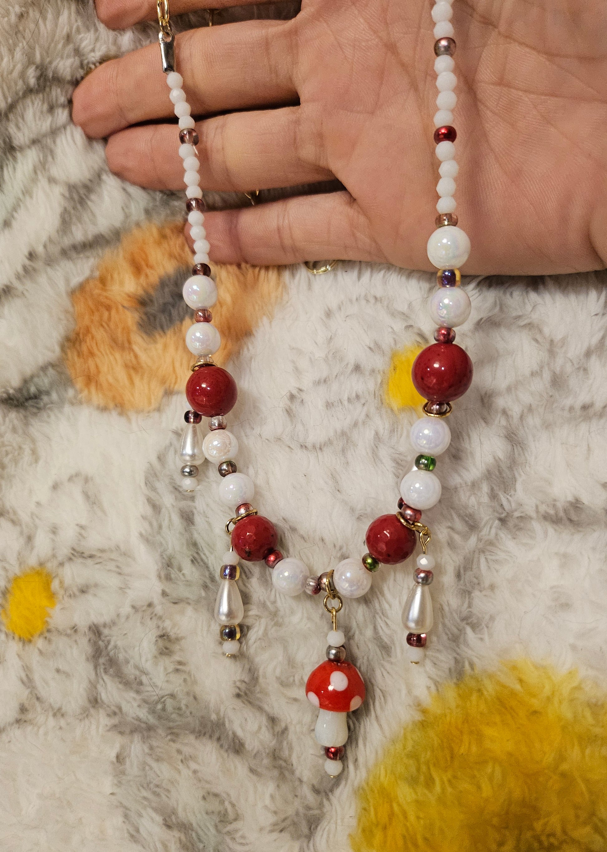 A 10" lobster clasp necklace featuring a glass mushroom bead spaced with red plastic beads and shiny white plastic beads. It has dangly teardrop charms.
