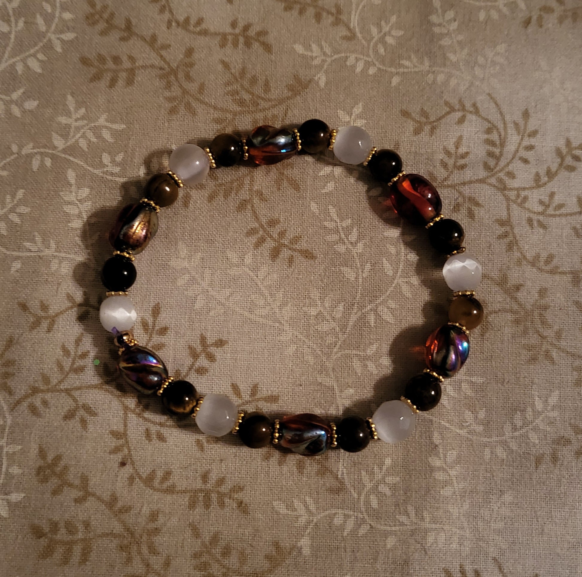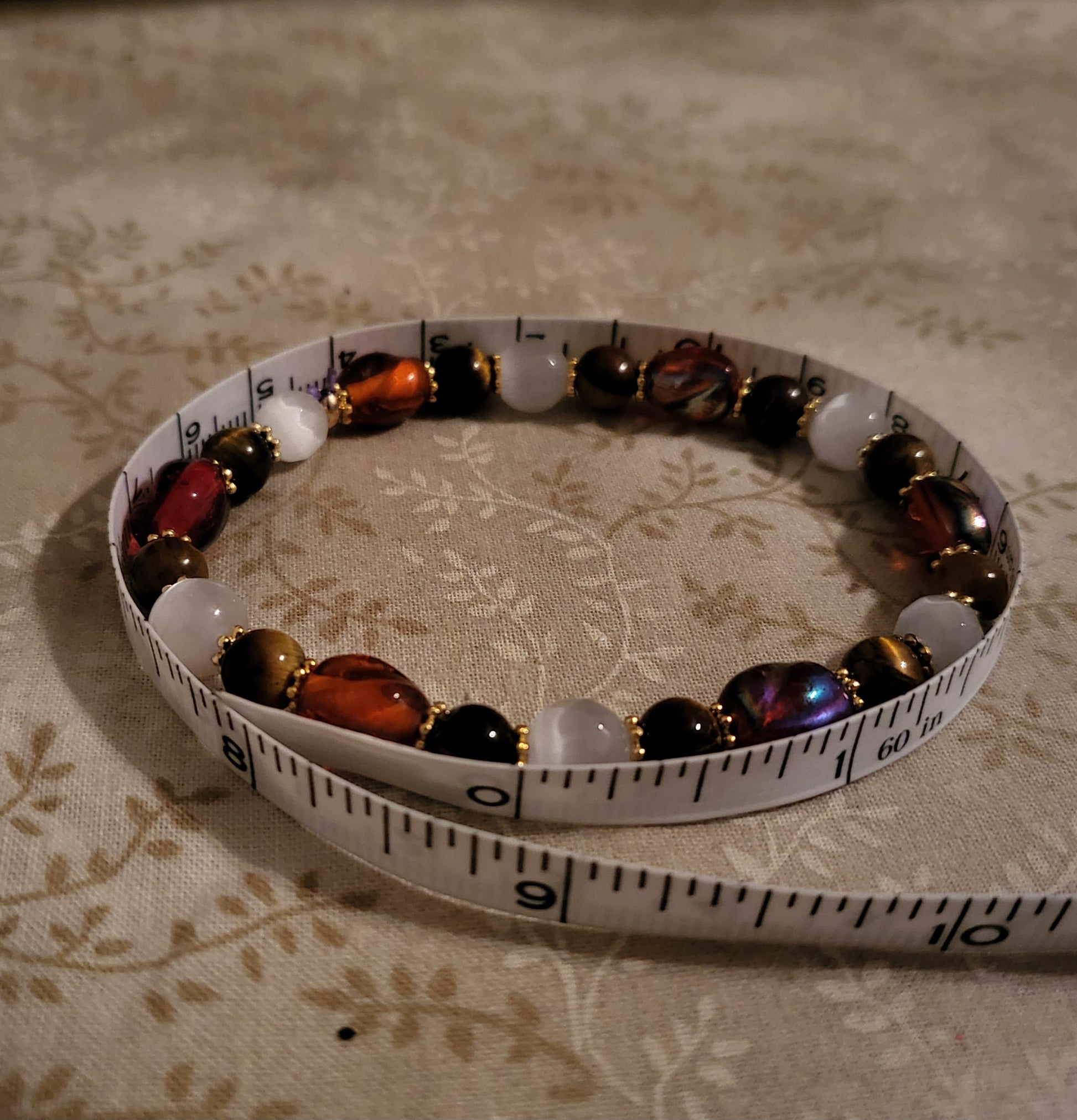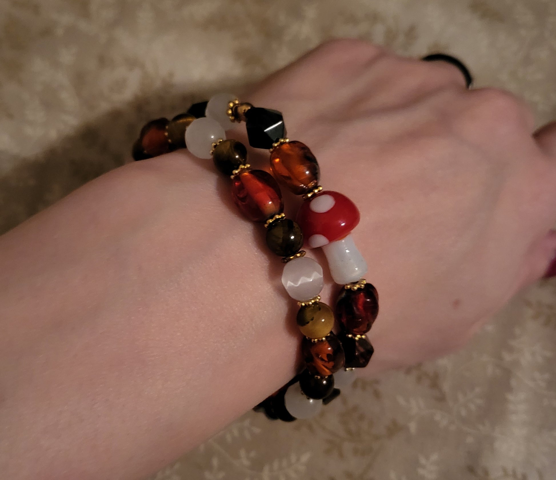 These two match each other so well that they have to go as a set! Adorable red glass mushrooms offset by pearly white beads, tiger's eye beads, and other complementary jewel tones on a durable but stretchy band.